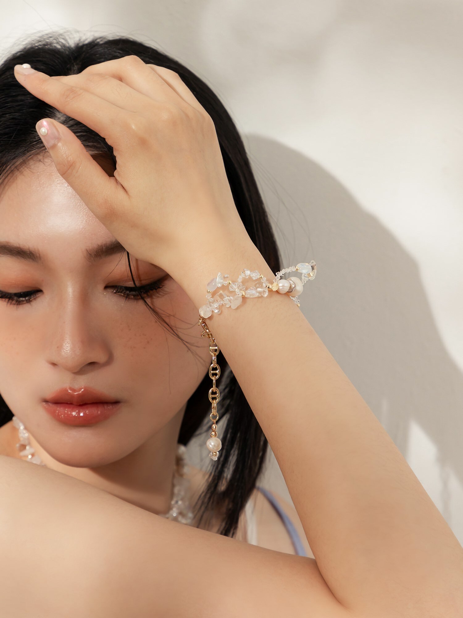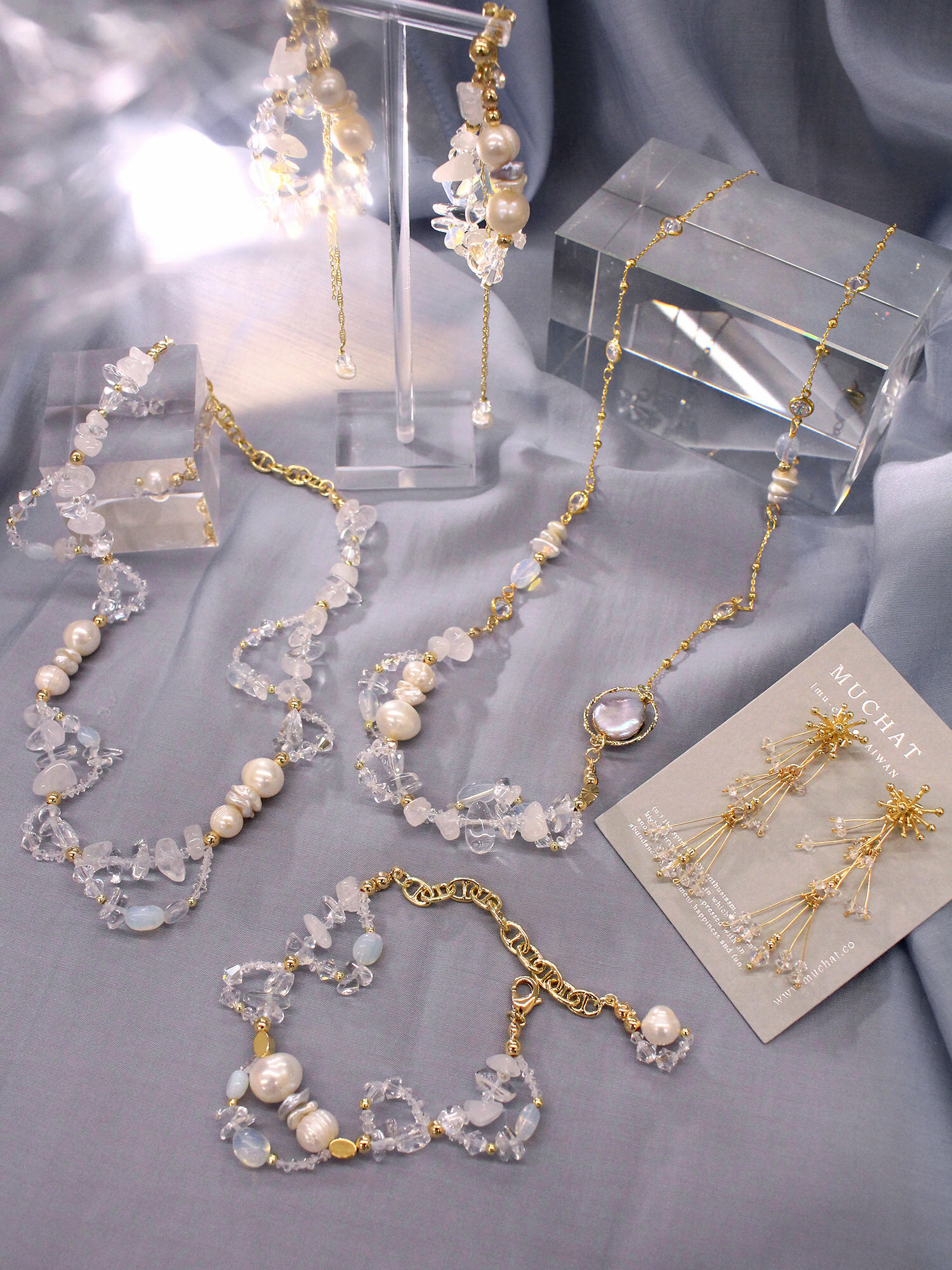 ▸ 素材:銅鍍14KGP、天然淡水珍珠、施華洛水晶角珠、蛋白石、白水晶、閃靈鑽等複合材質