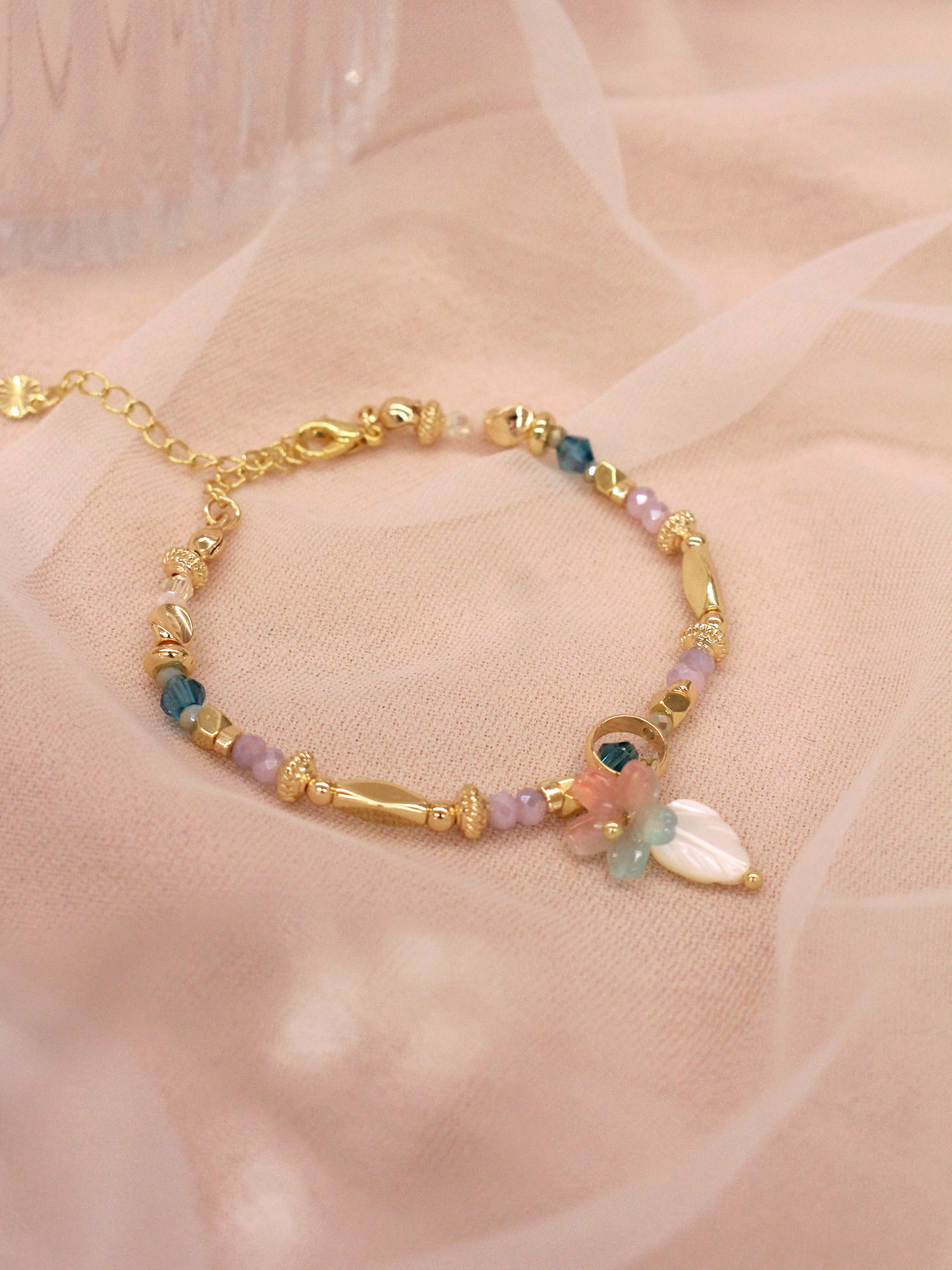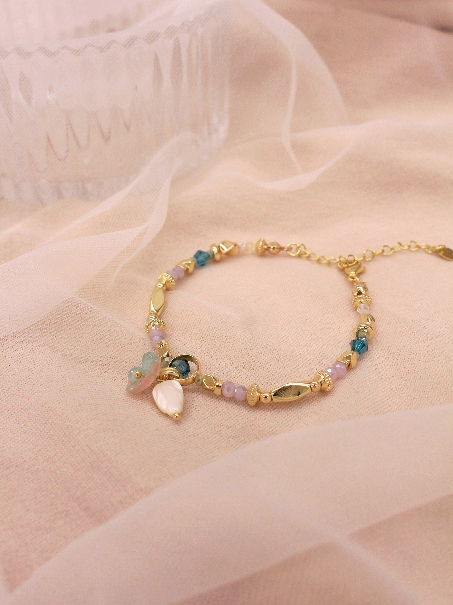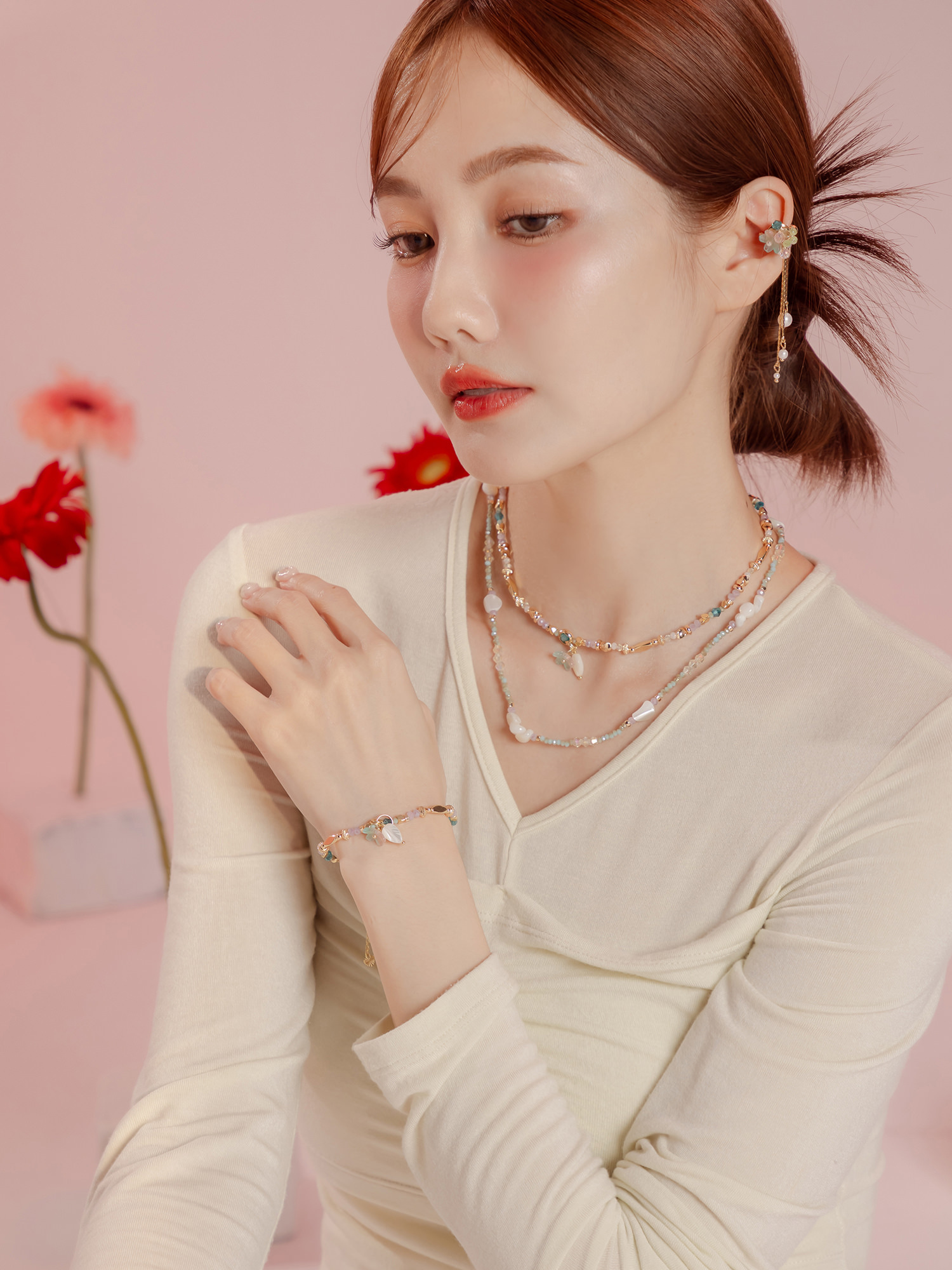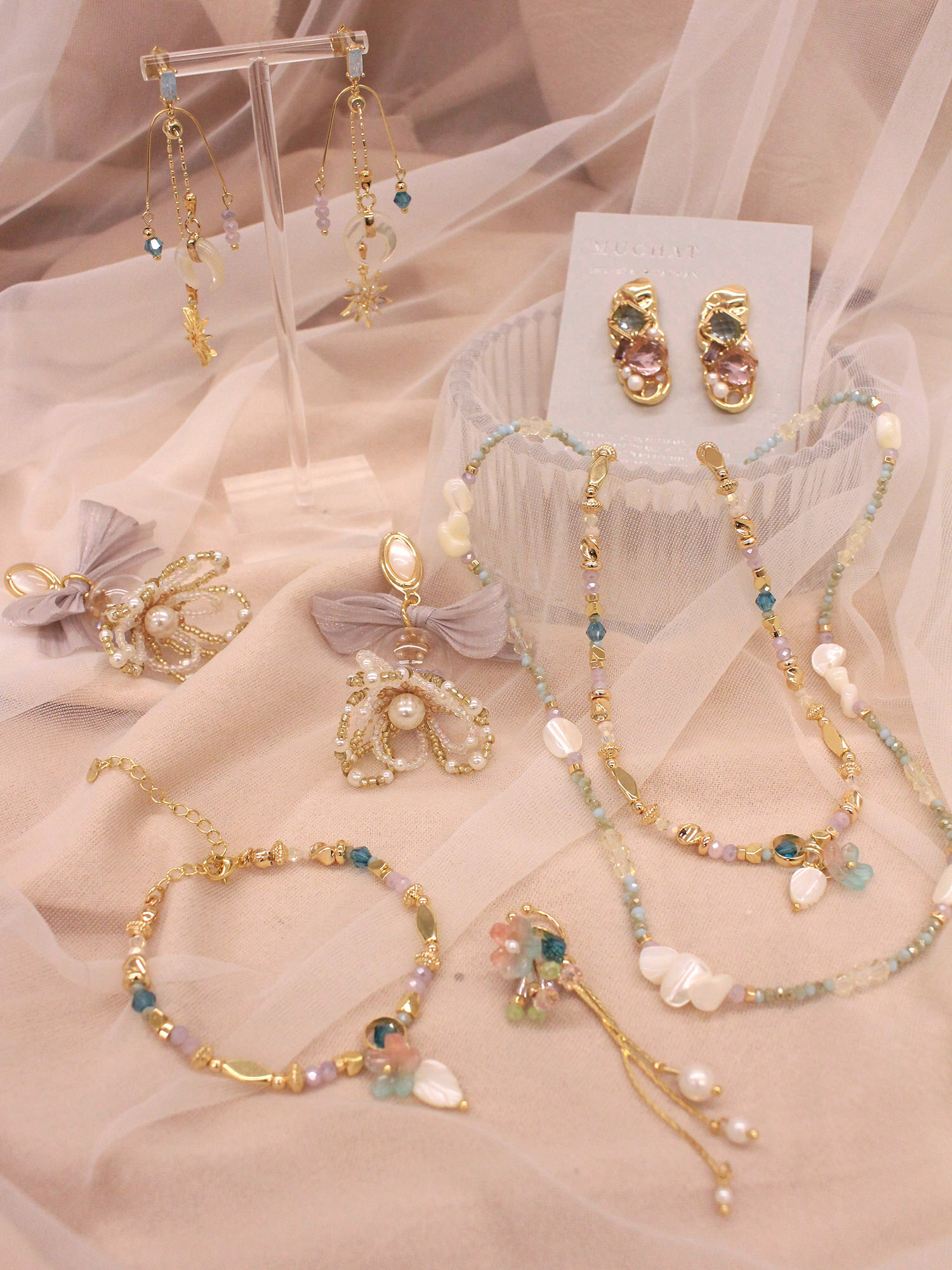 ▸ 素材:銅鍍14KGP、天然貝殼片、樹酯、水晶珠、串珠等複合材質
