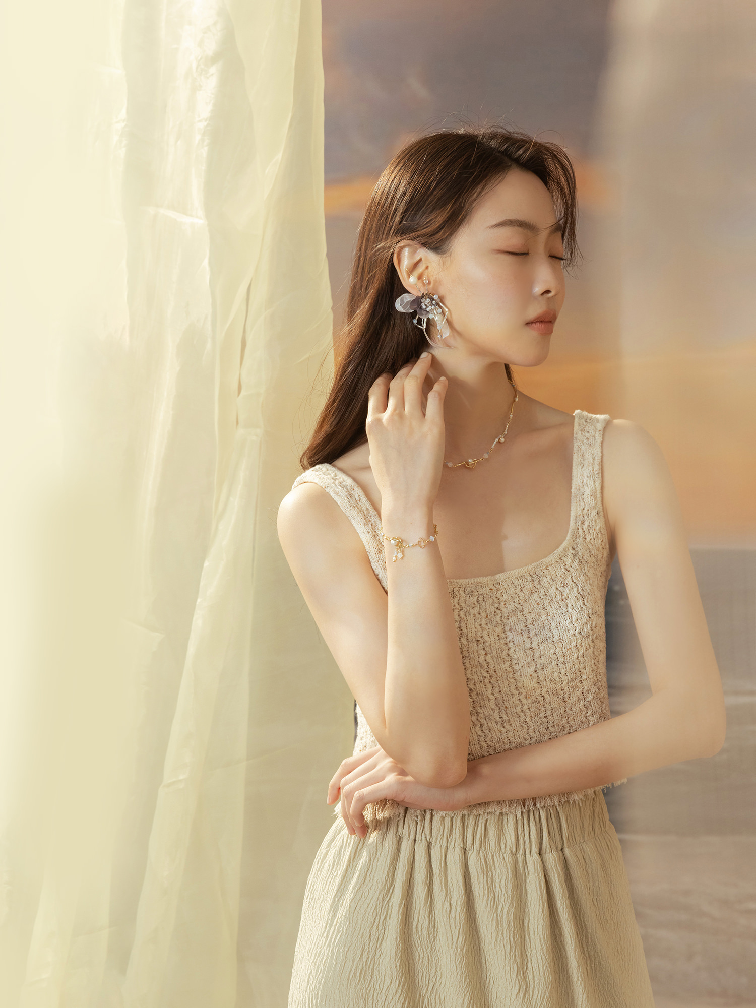 ▸ 素材:銅鍍14KGP、水晶珠、串珠、仿珠、聚酯纖維、塑片等複合材質