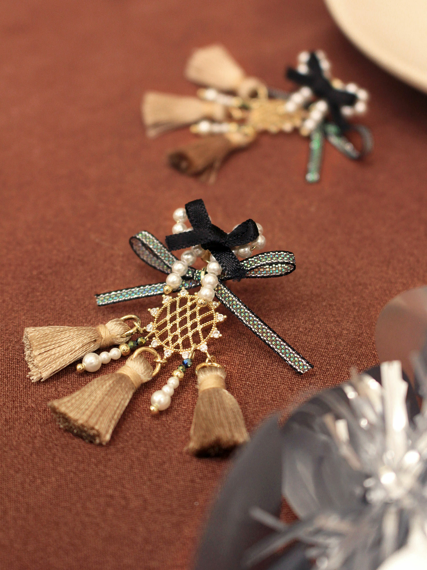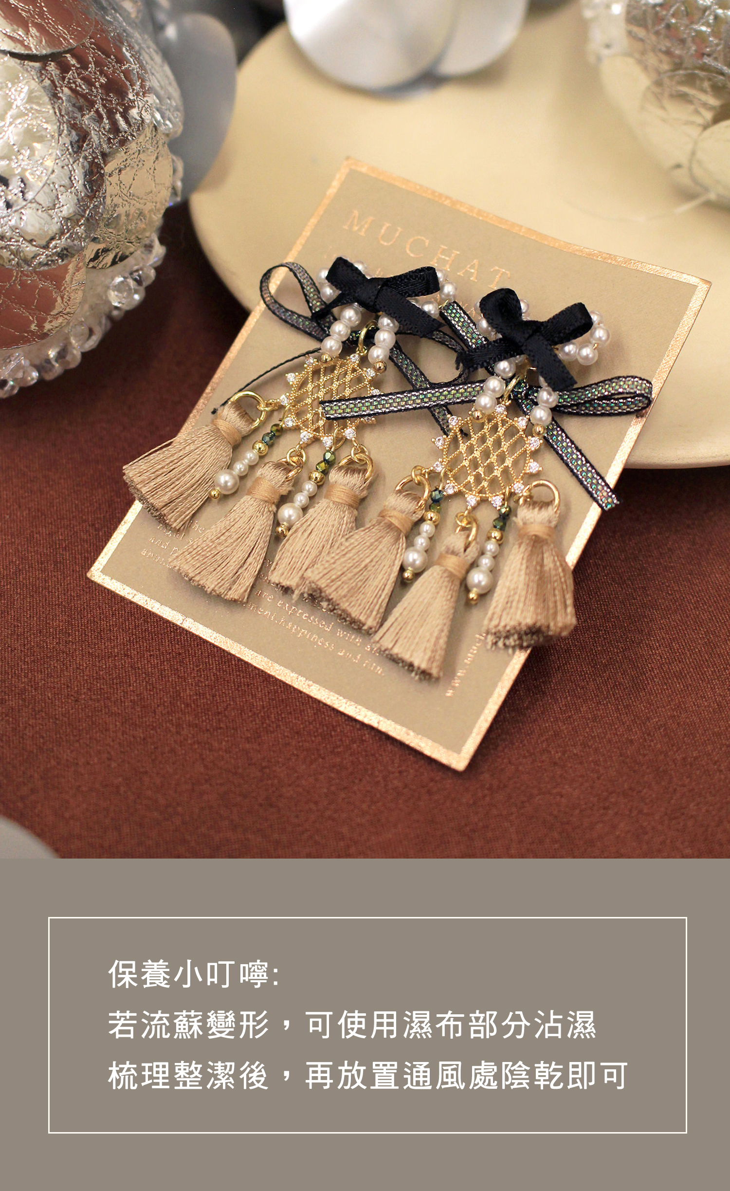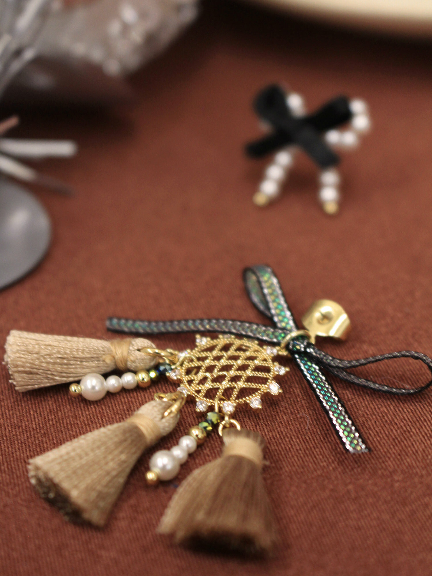 ▸ 素材:銅鍍14KGP、聚酯纖維、仿珠、鋯石、緞帶等複合材質