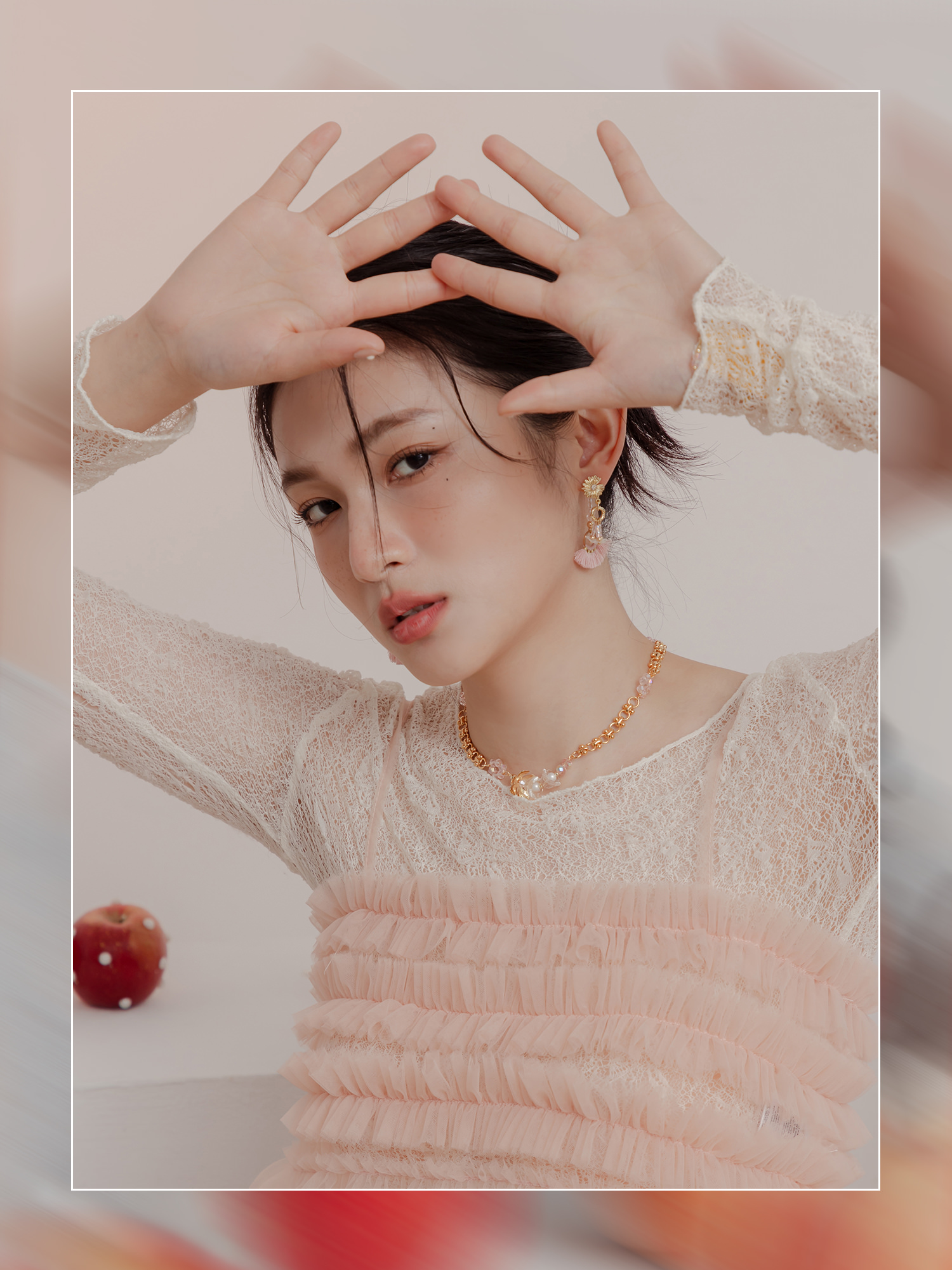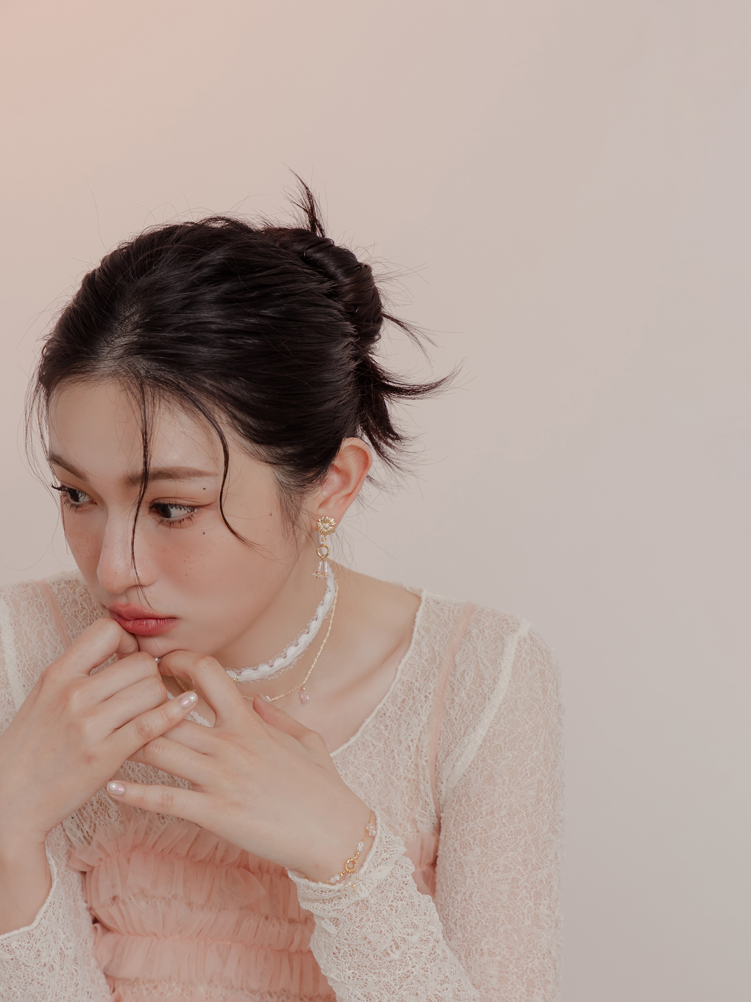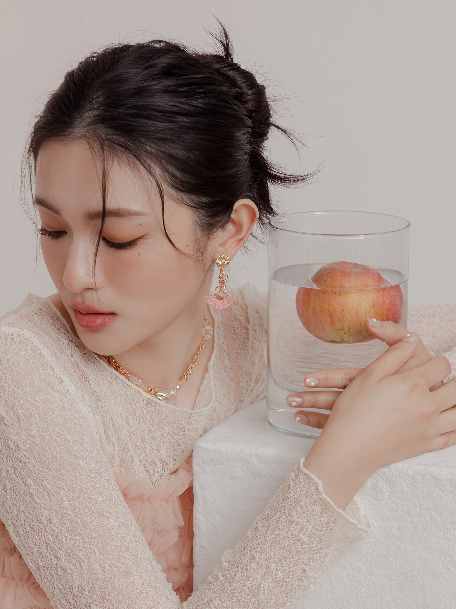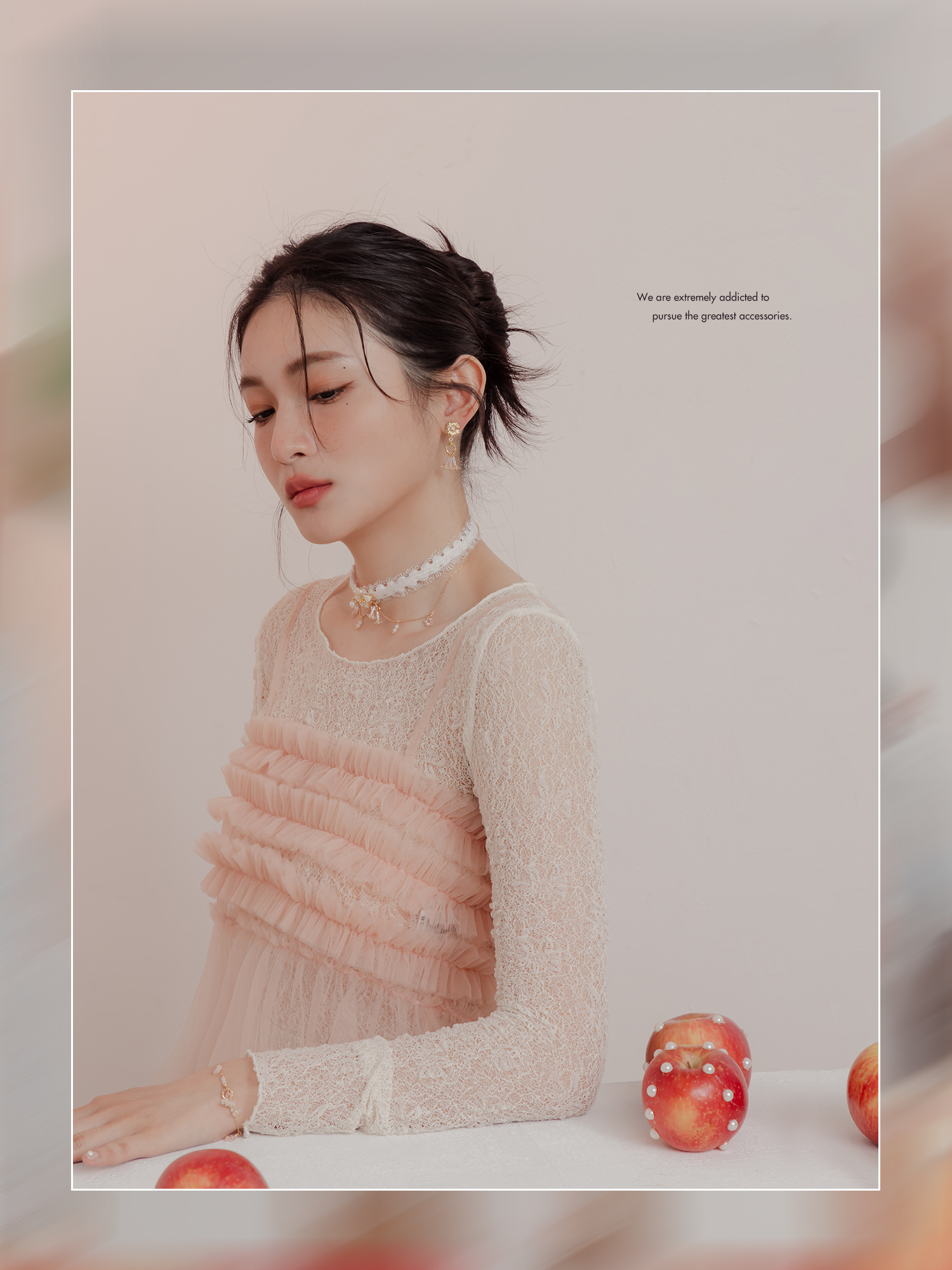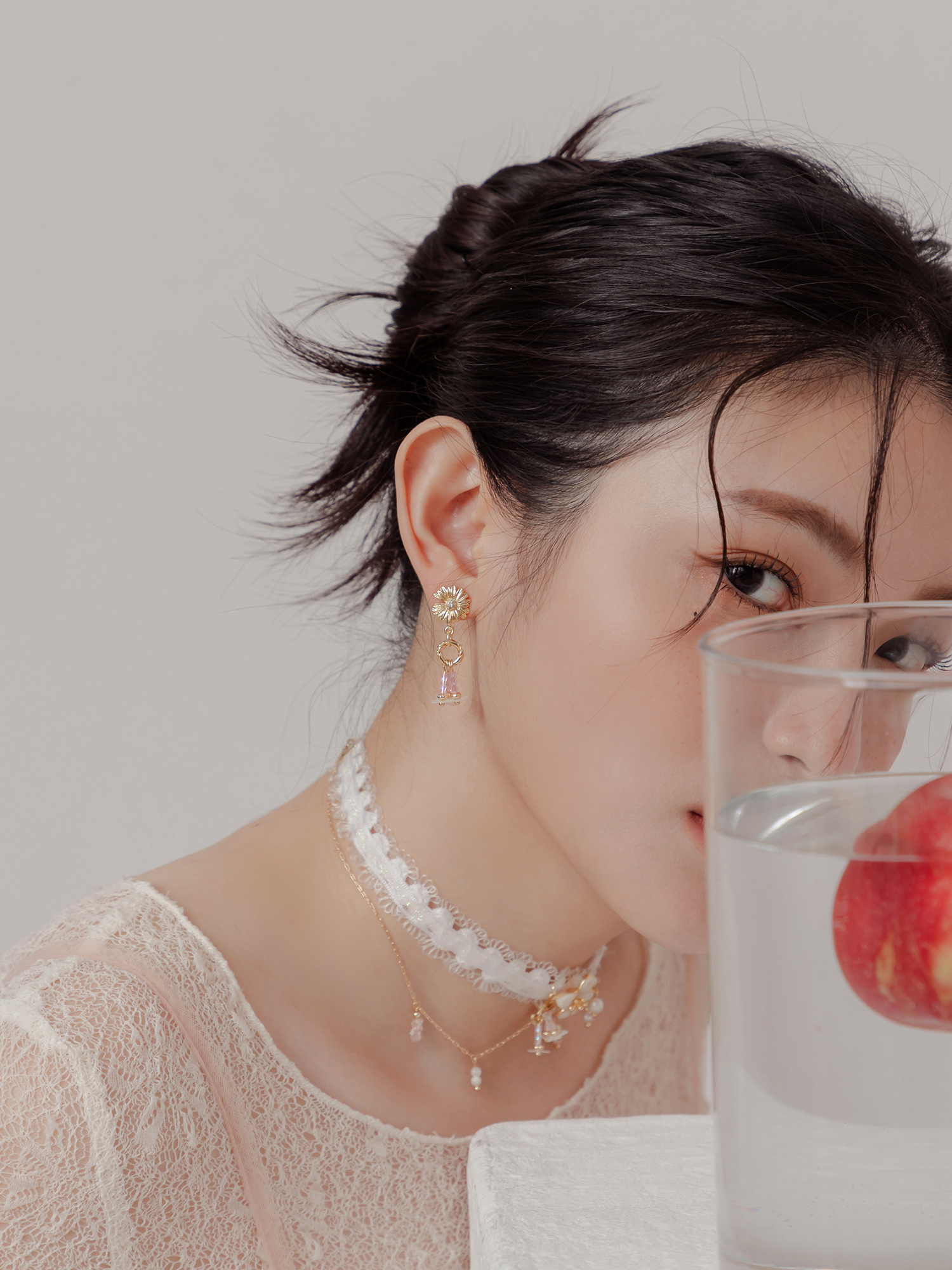 ▸ 素材:銅鍍14KGP、鋯石、仿珠、亮片、水晶珠、聚酯纖維等複合材質