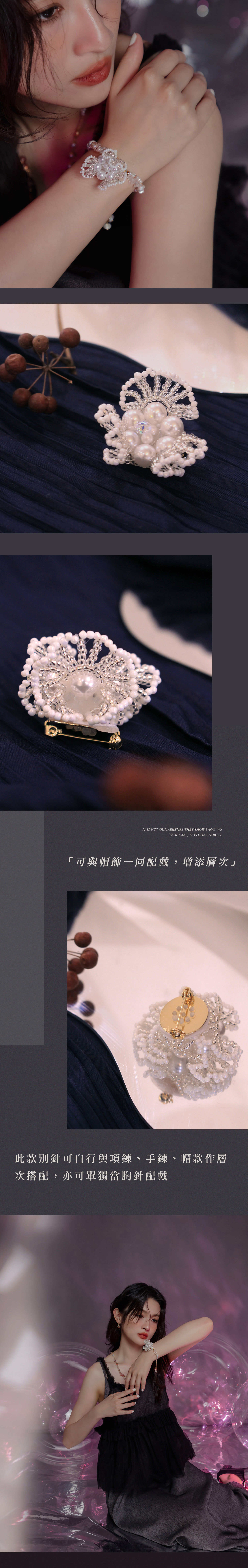 ▸ 素材:銅鍍14KGP、施華洛水晶珠、仿珠、串珠、白水晶、聚酯纖維等複合材質