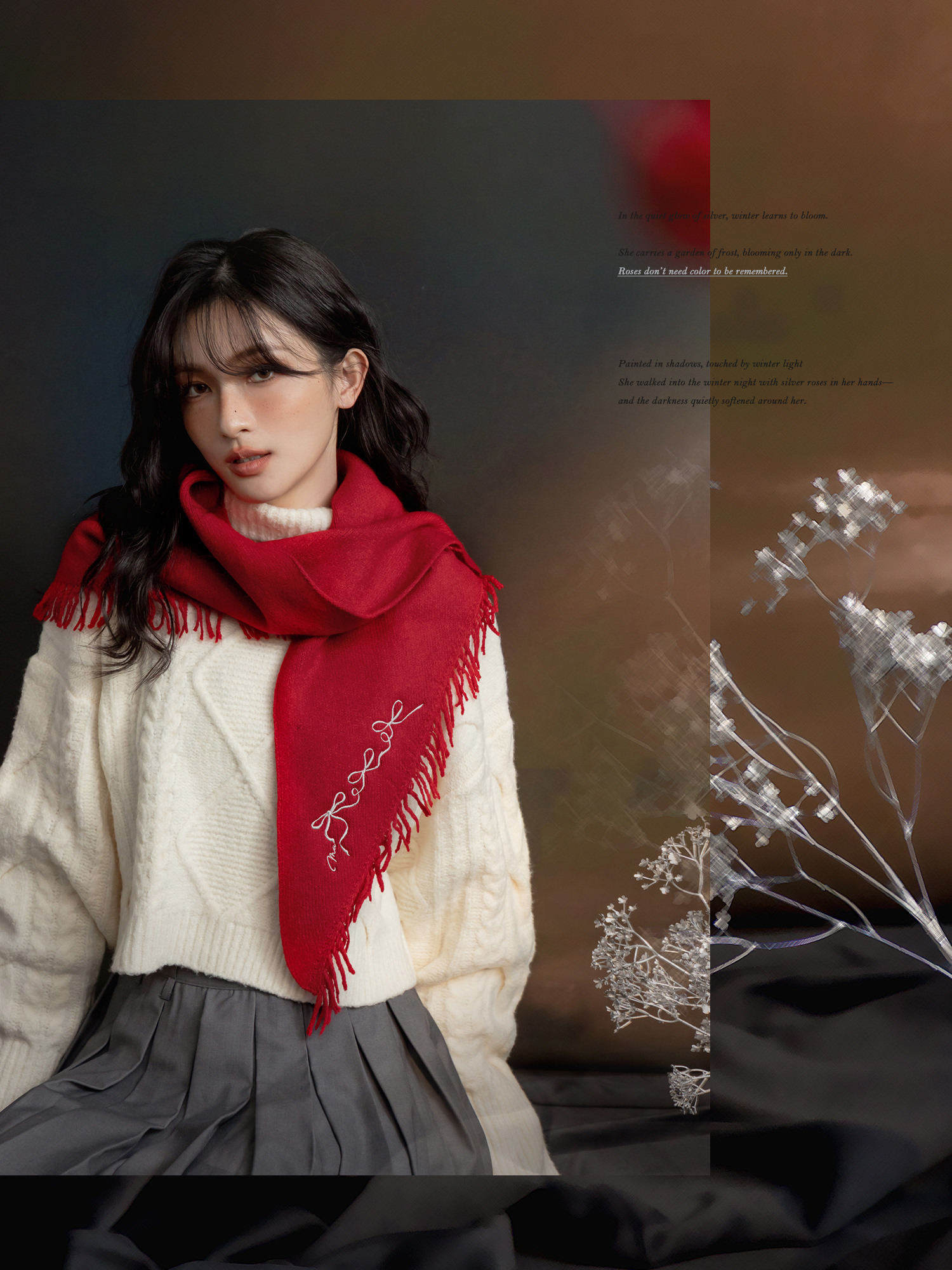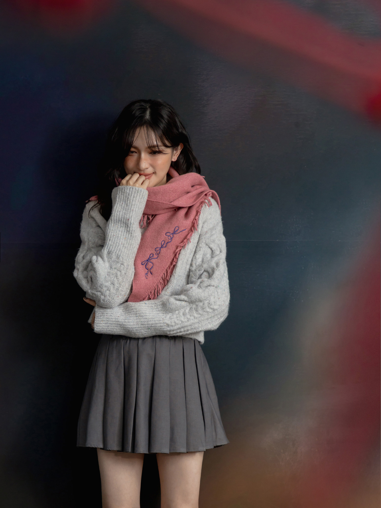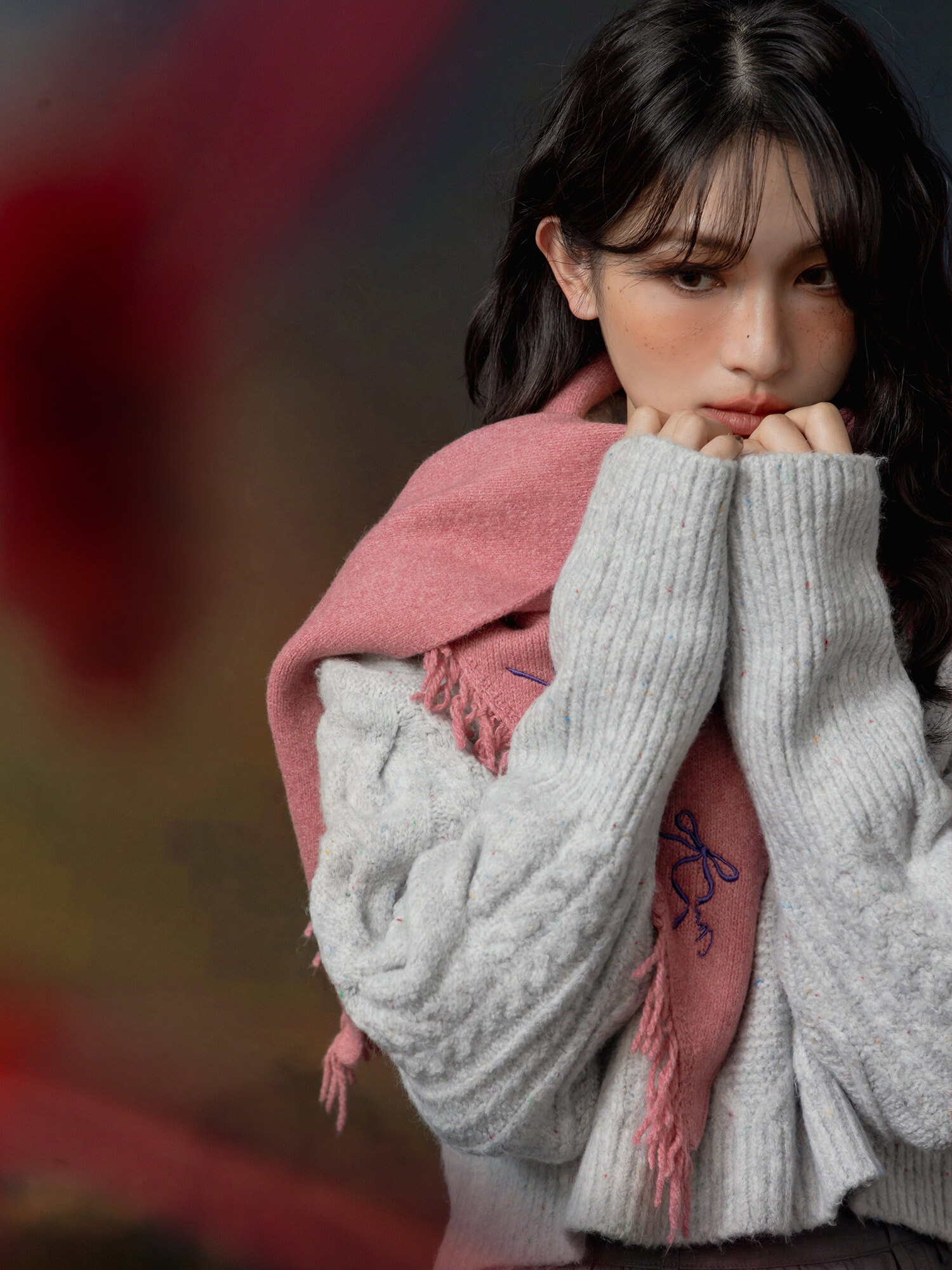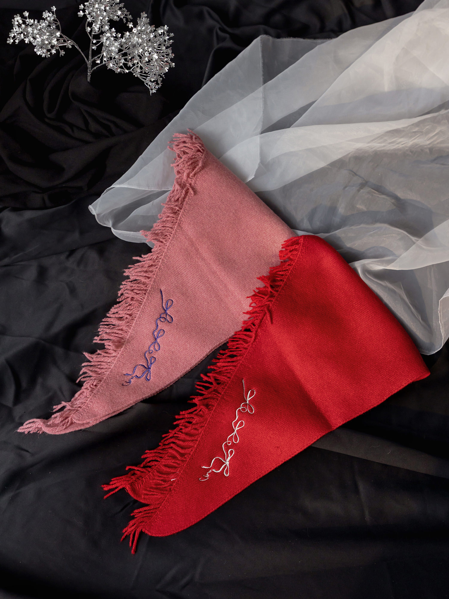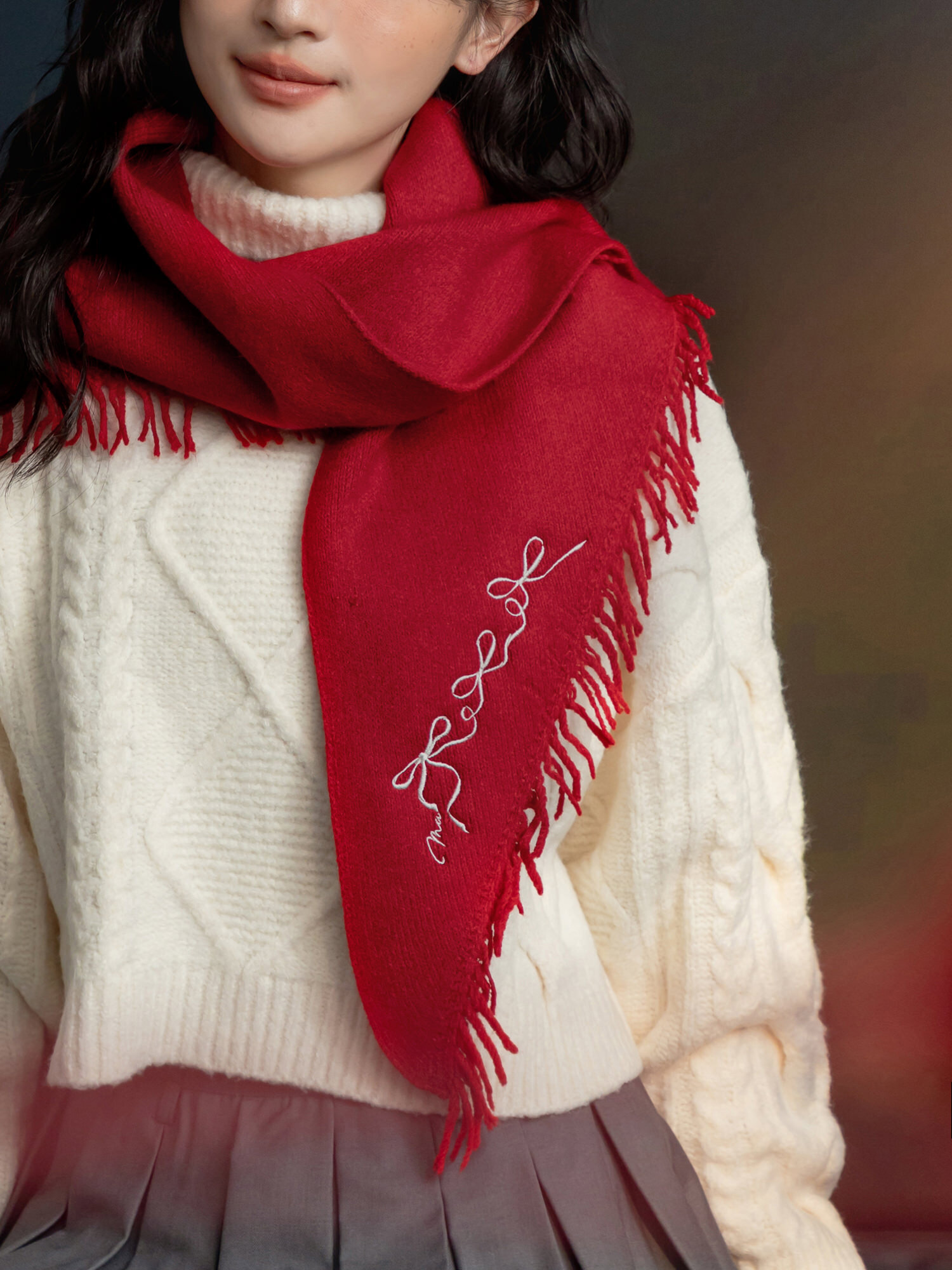 夢遊者。MUCHAT手作刺繡蝶結流蘇圍巾 (紅)