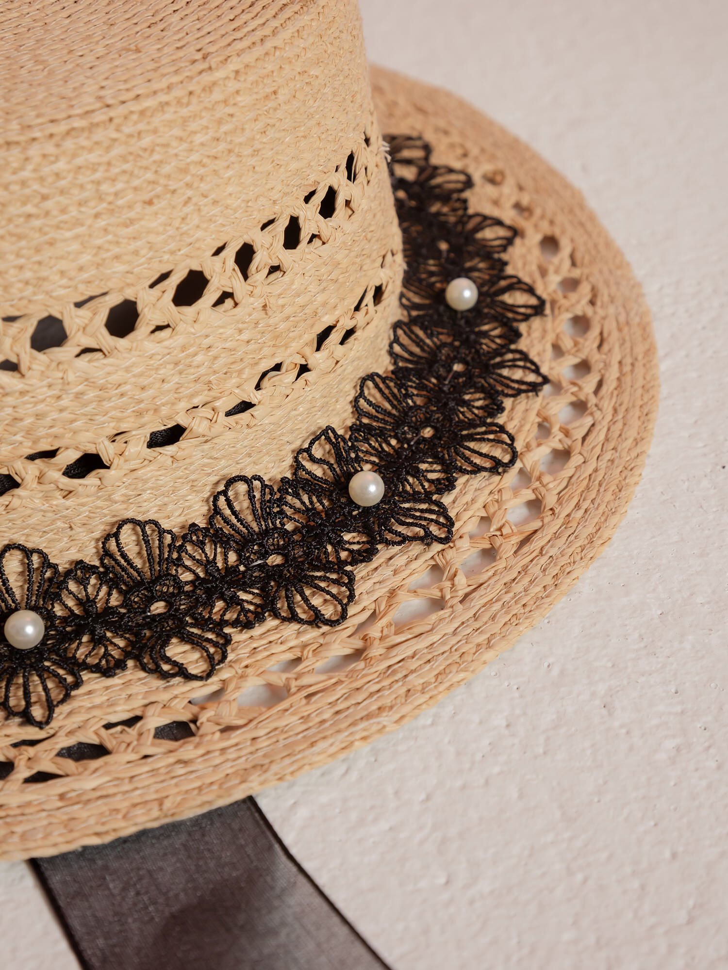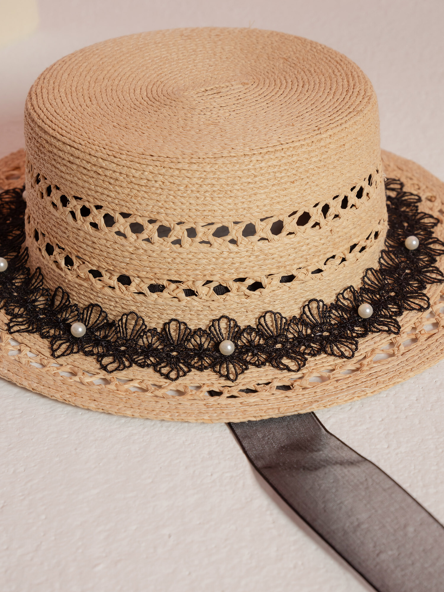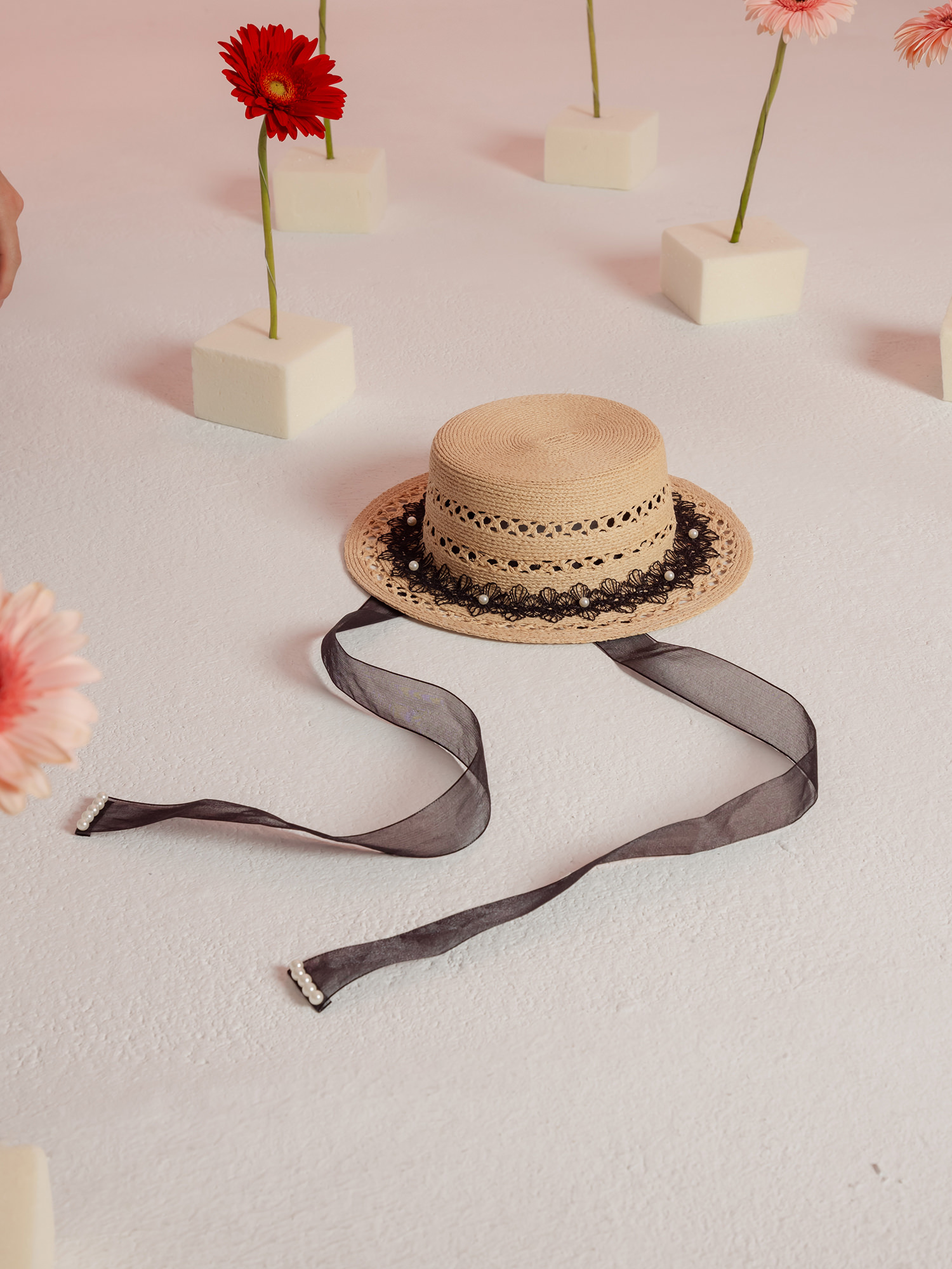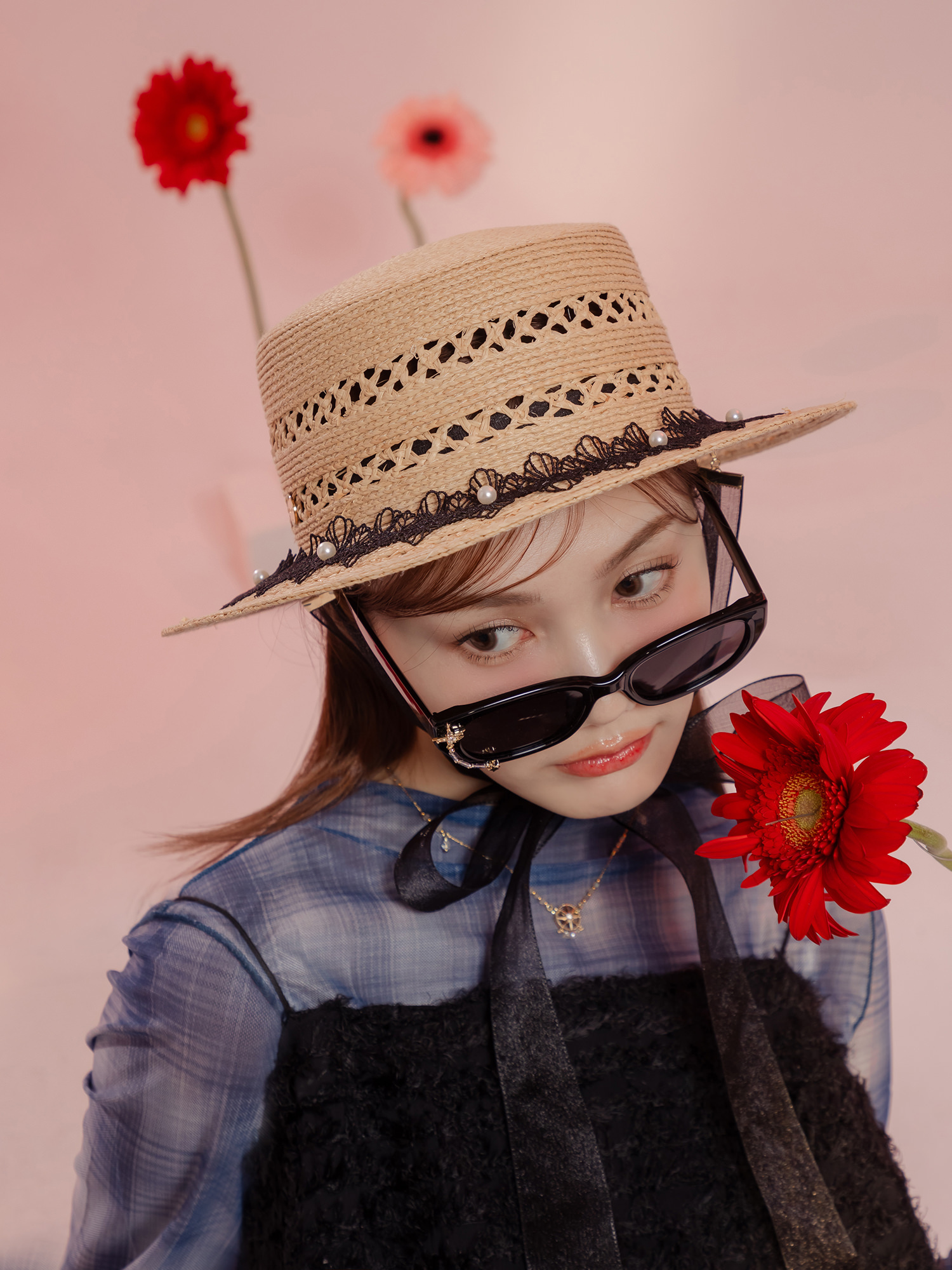 紅雀斑女子。MUCHAT手作蕾絲珍珠綁帶拉菲草平頂草帽
