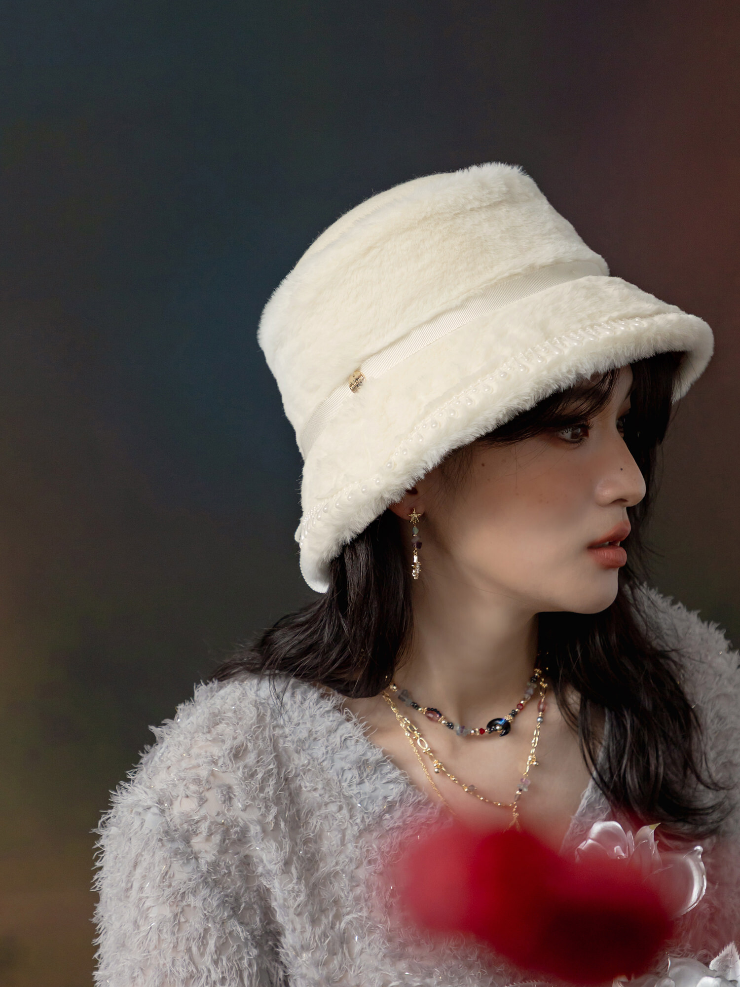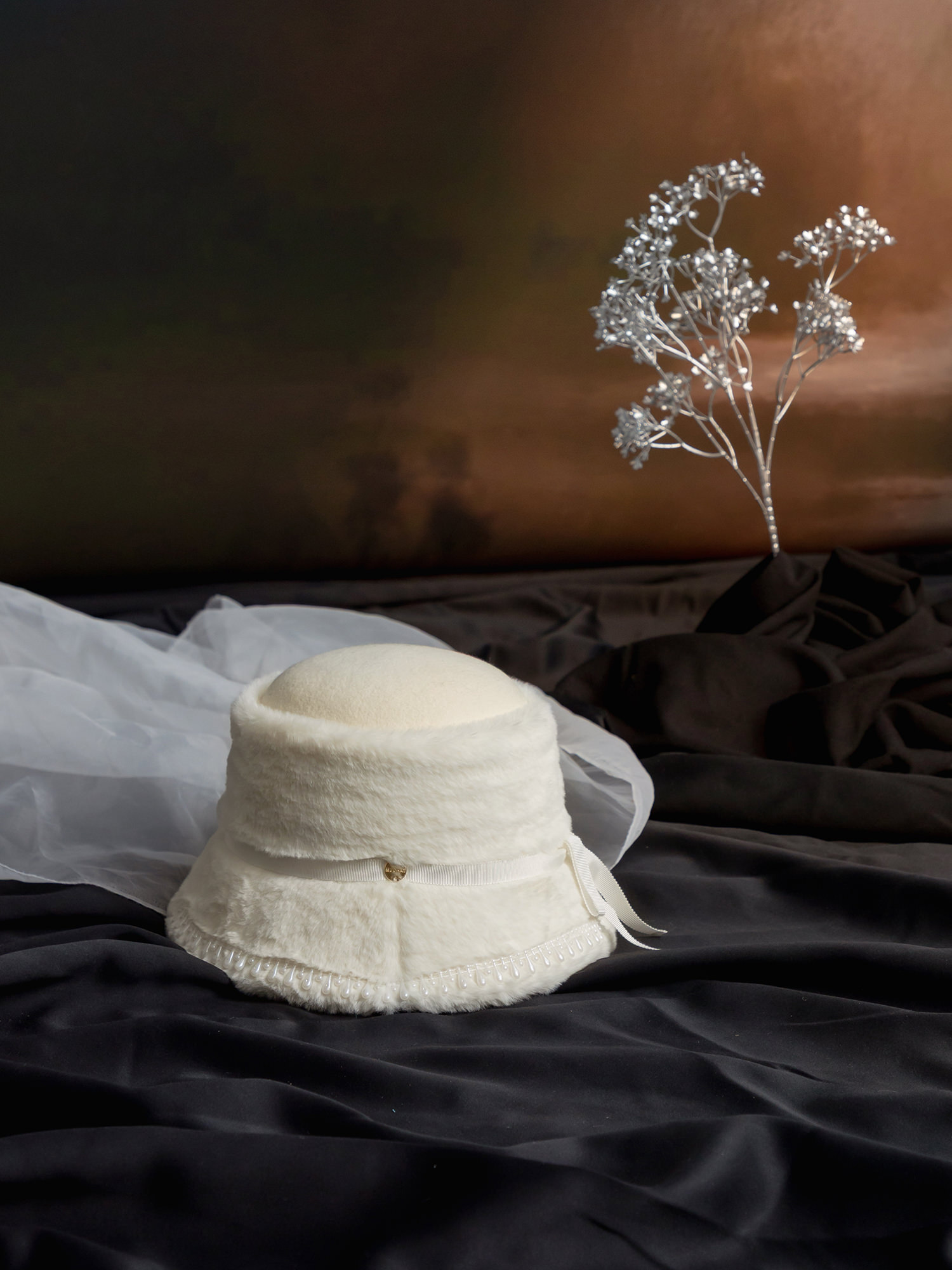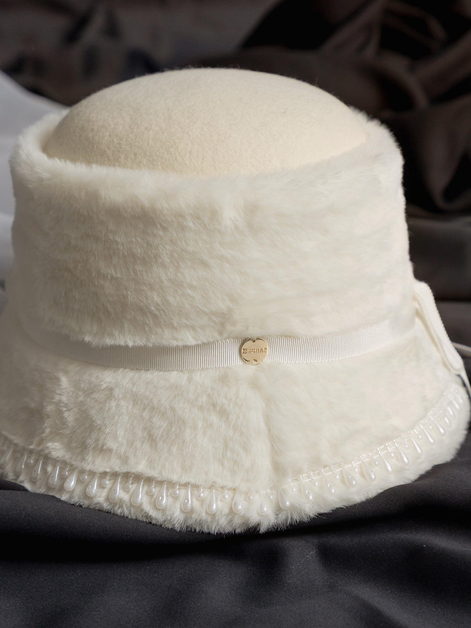 馬格畫作。MUCHAT手作珍珠蝶結毛呢淑女帽 (米白)
