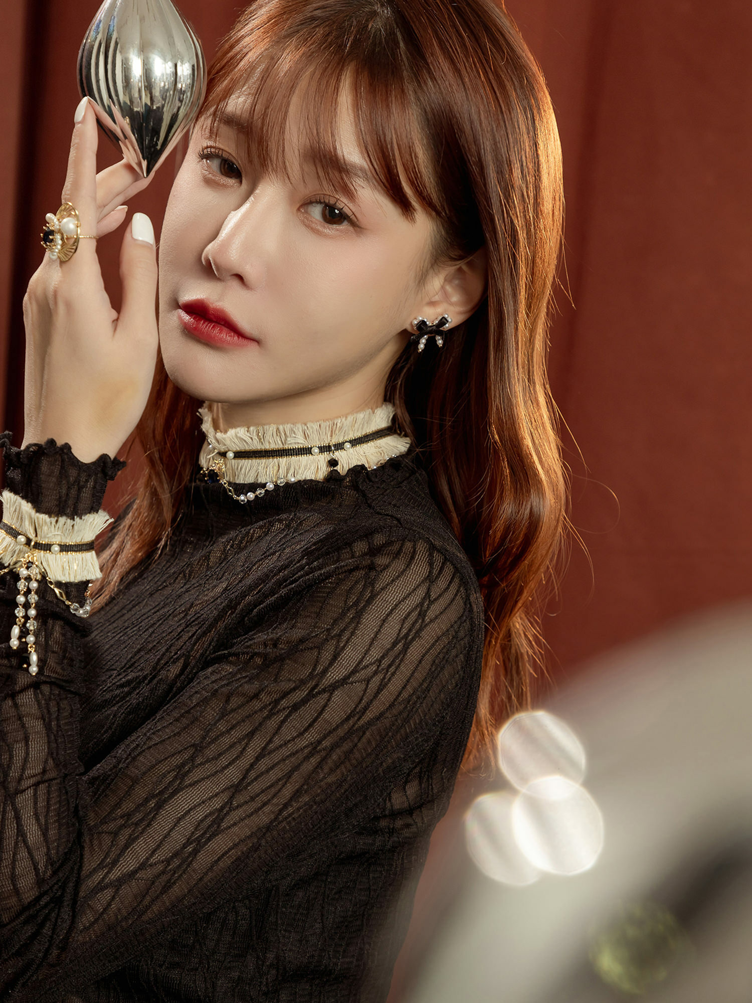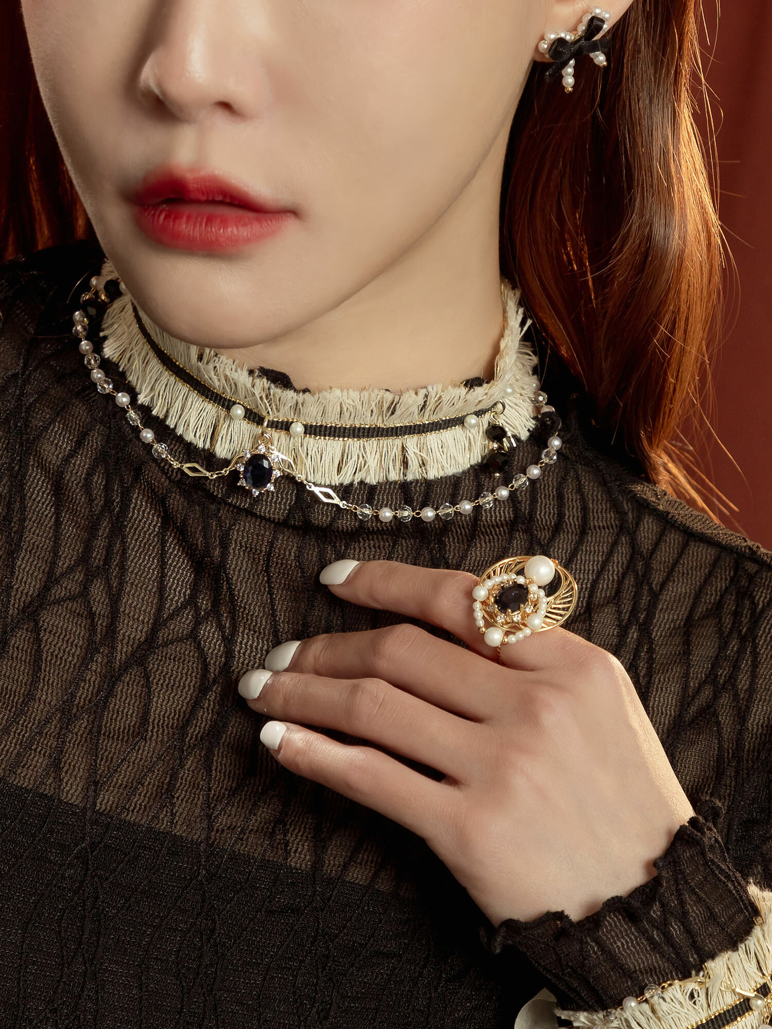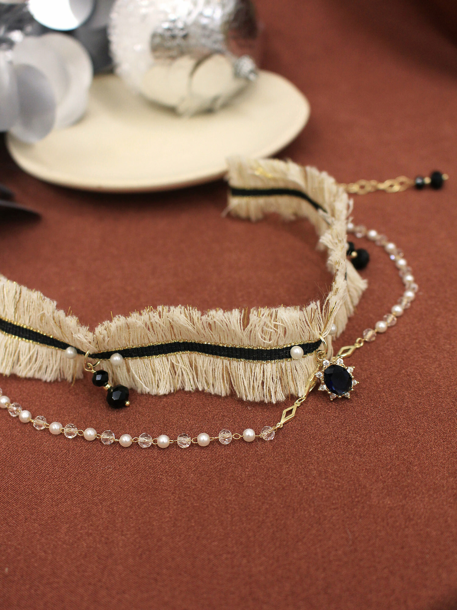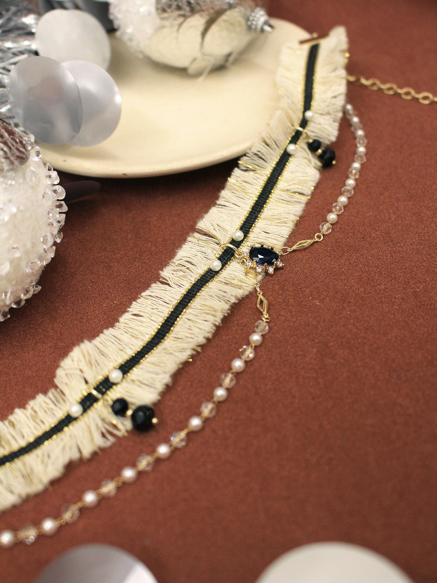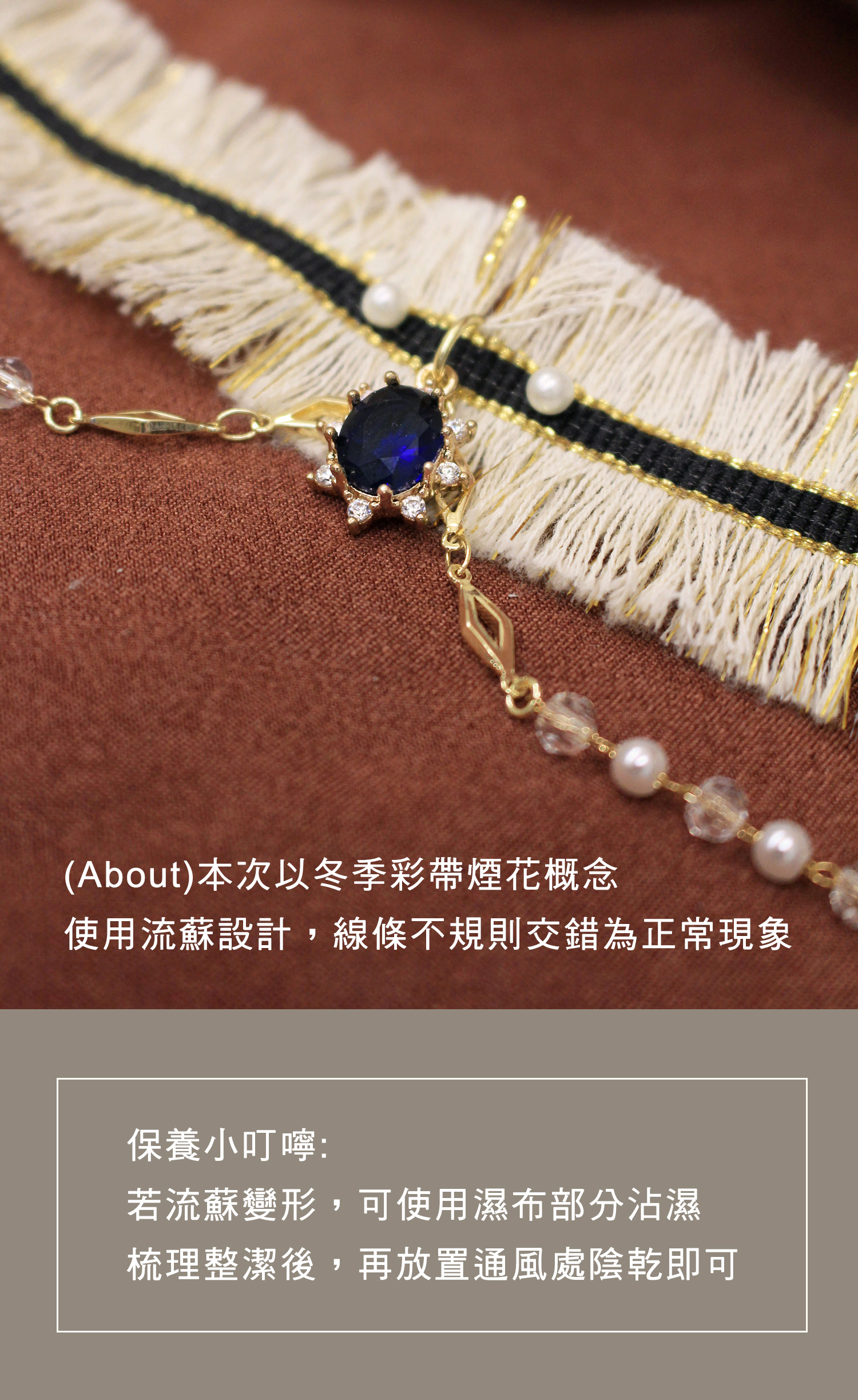 ▸ 素材:銅鍍14KGP 、水晶、鋯石、仿珠、水晶珠、聚酯纖維等複合材質