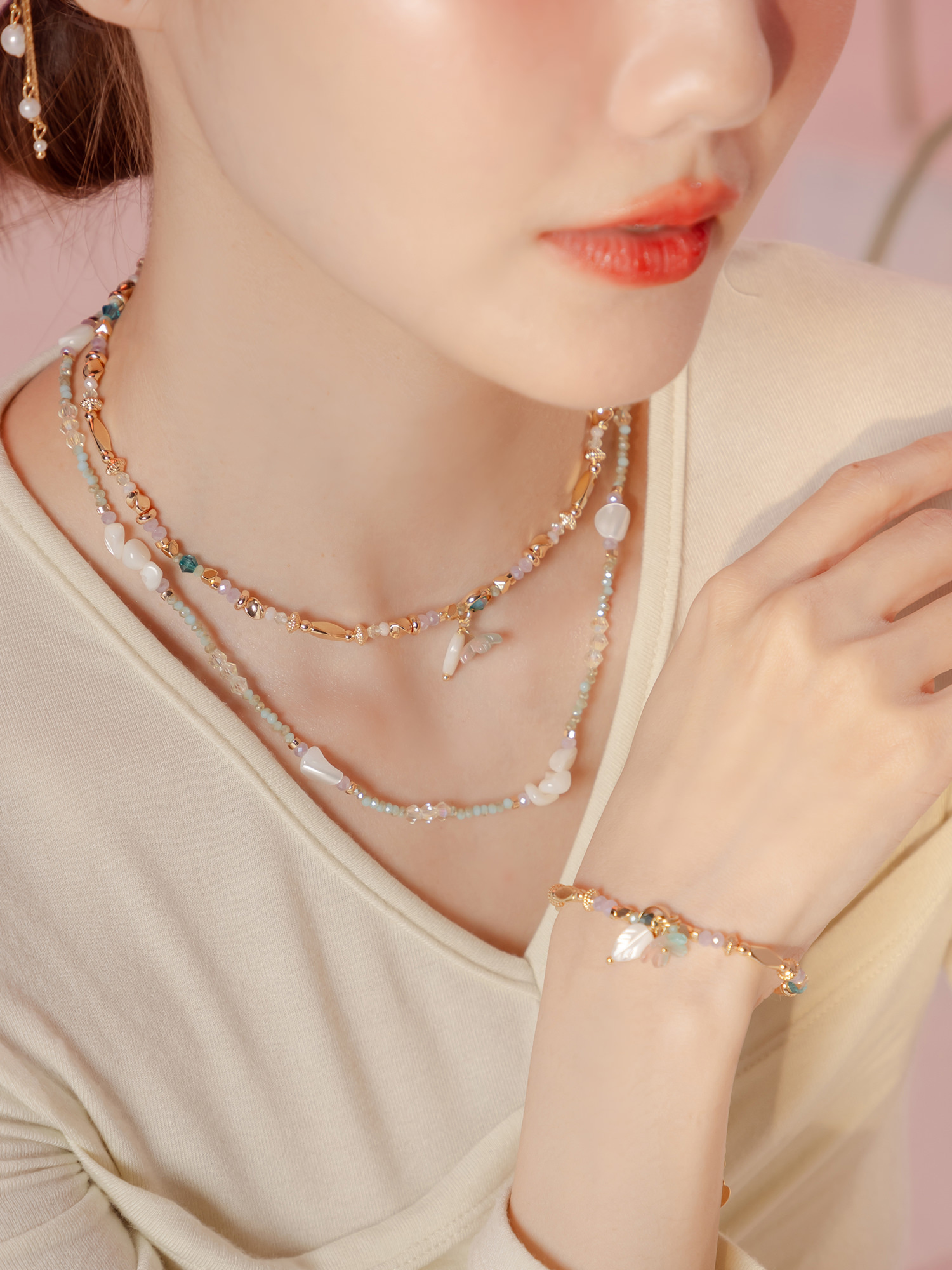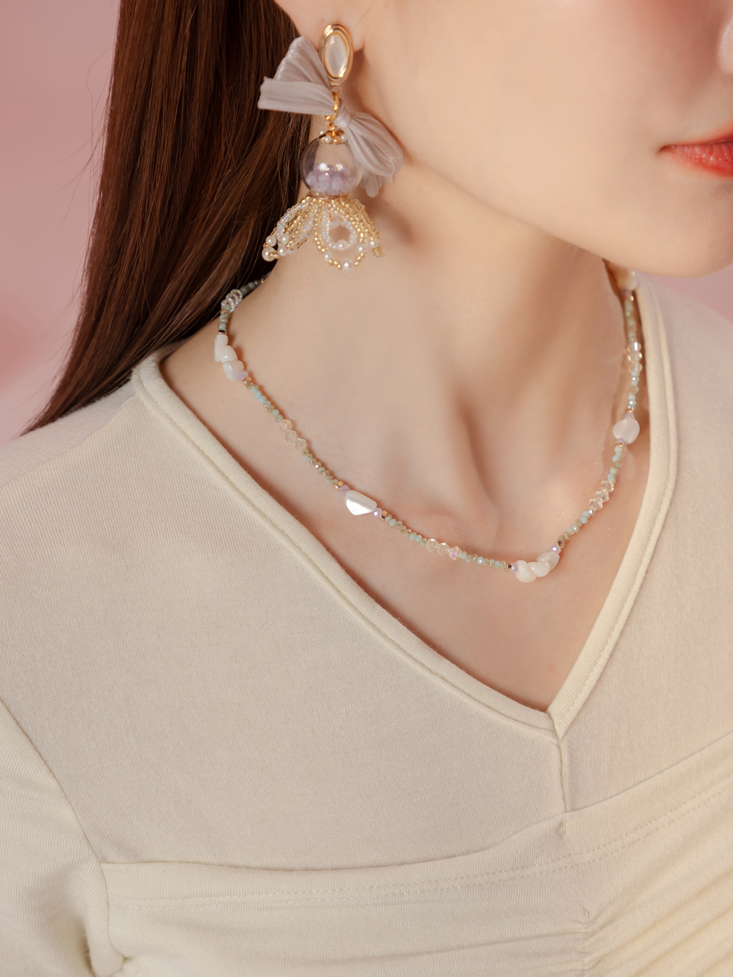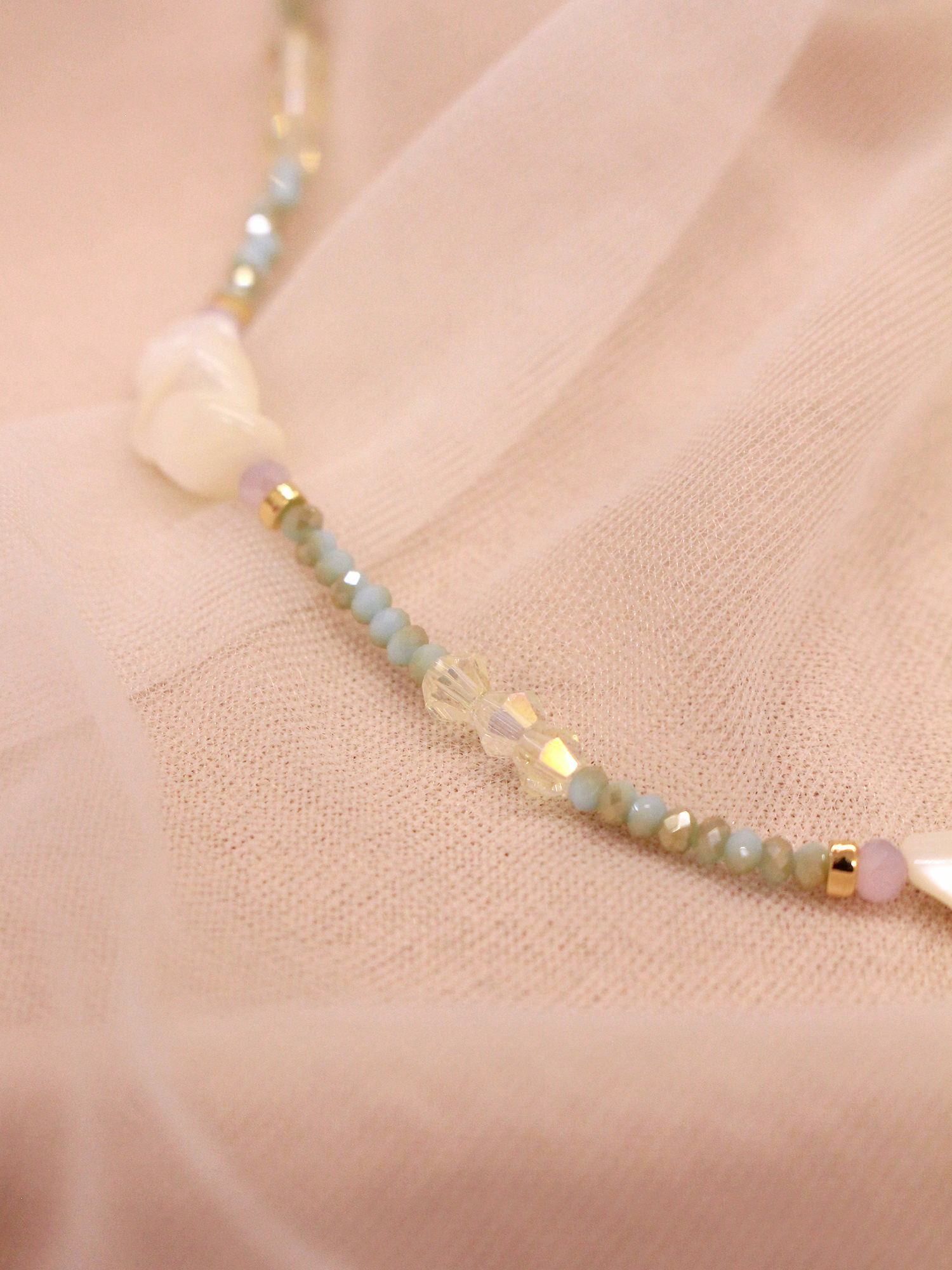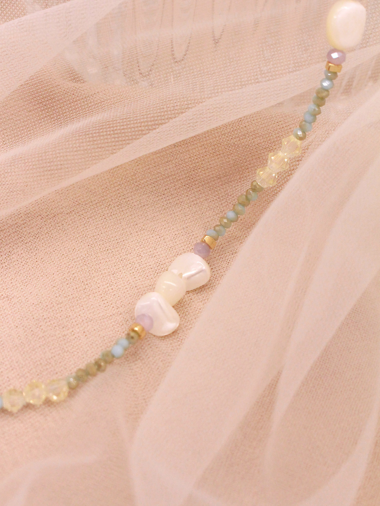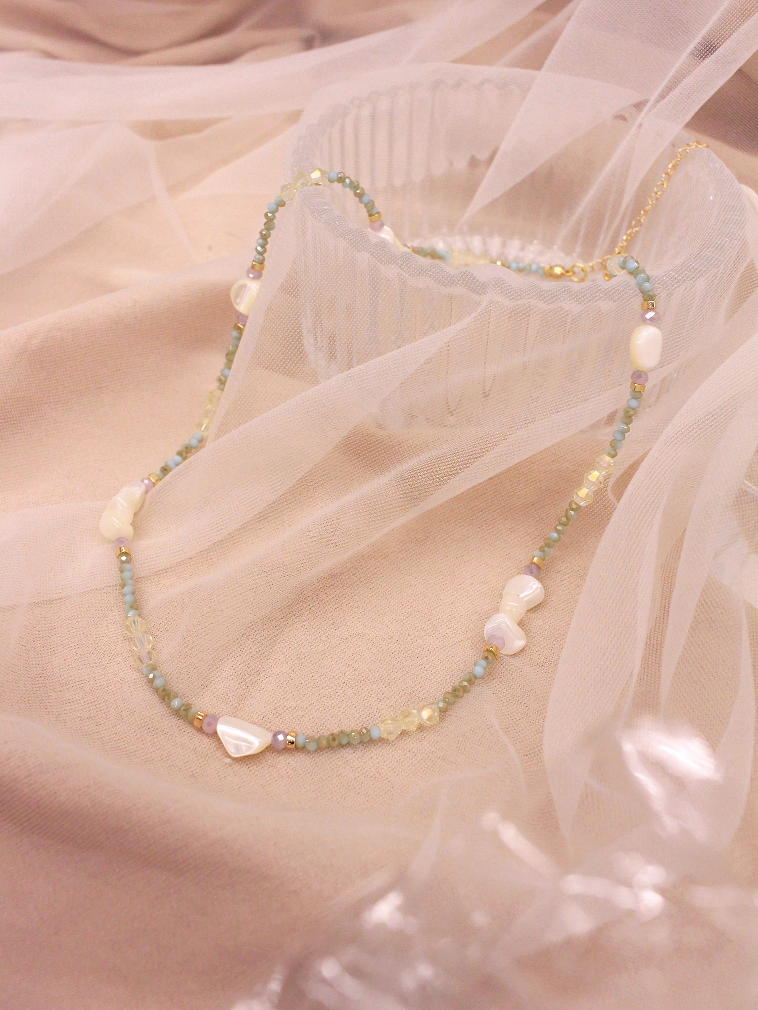 ▸ 素材:銅鍍14KGP、天然白蝶貝、水晶珠、串珠等複合材質