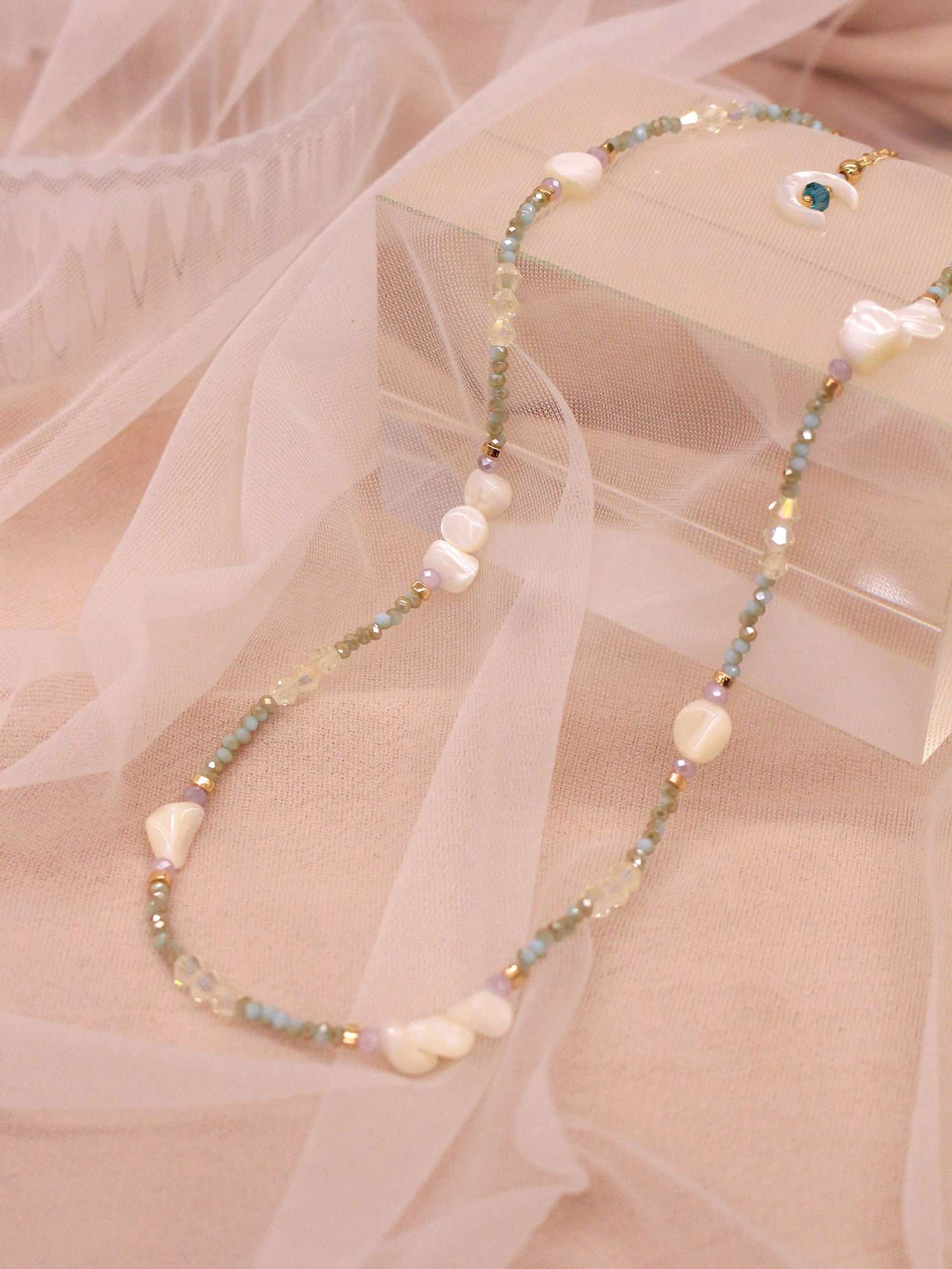 ▸ 水晶、貝殼、天然珍珠為天然材料,混色與花紋每款或有差異,鍍金屬不均、斑點、刮痕與凹洞為正常,非瑕疵。