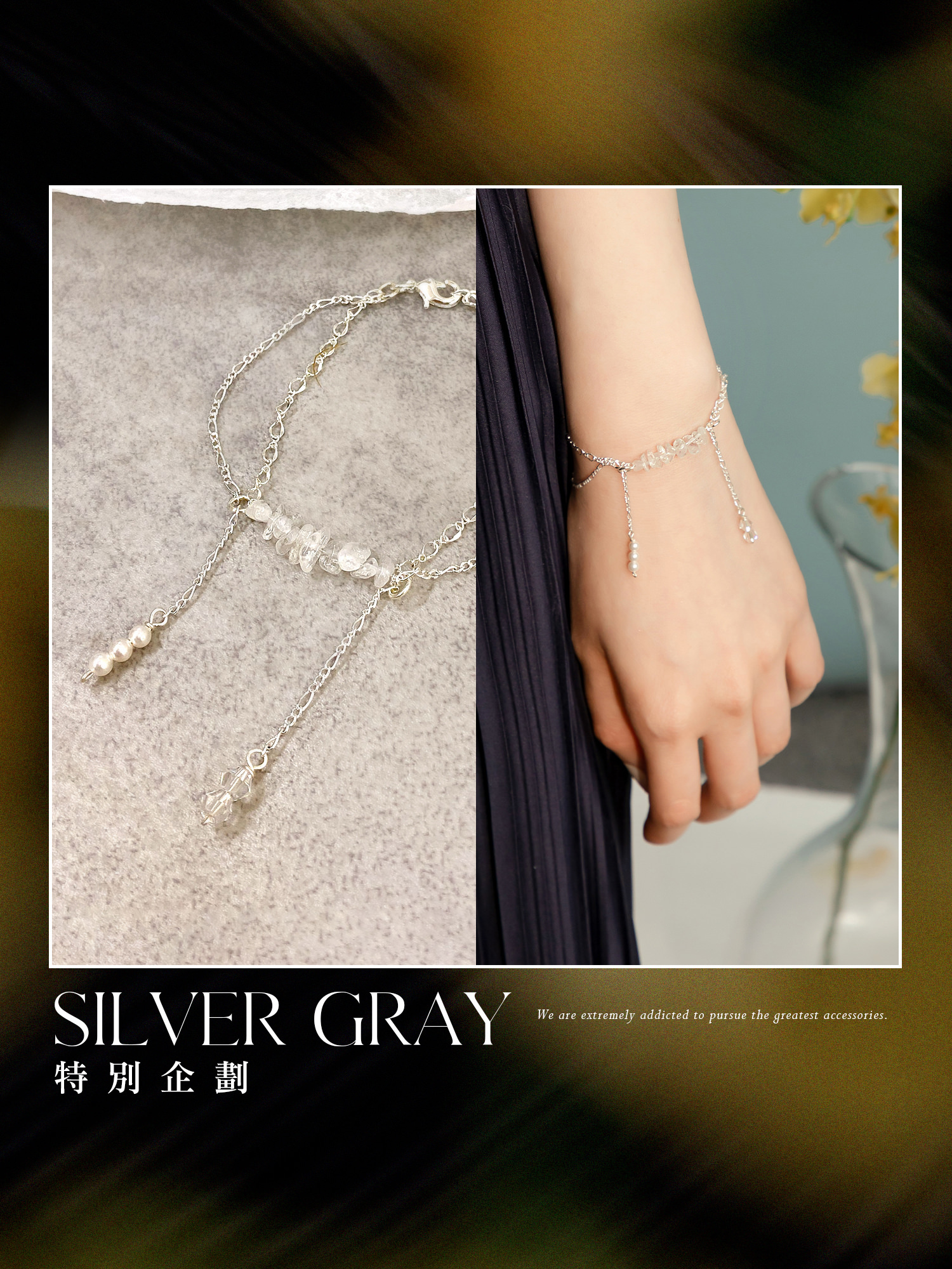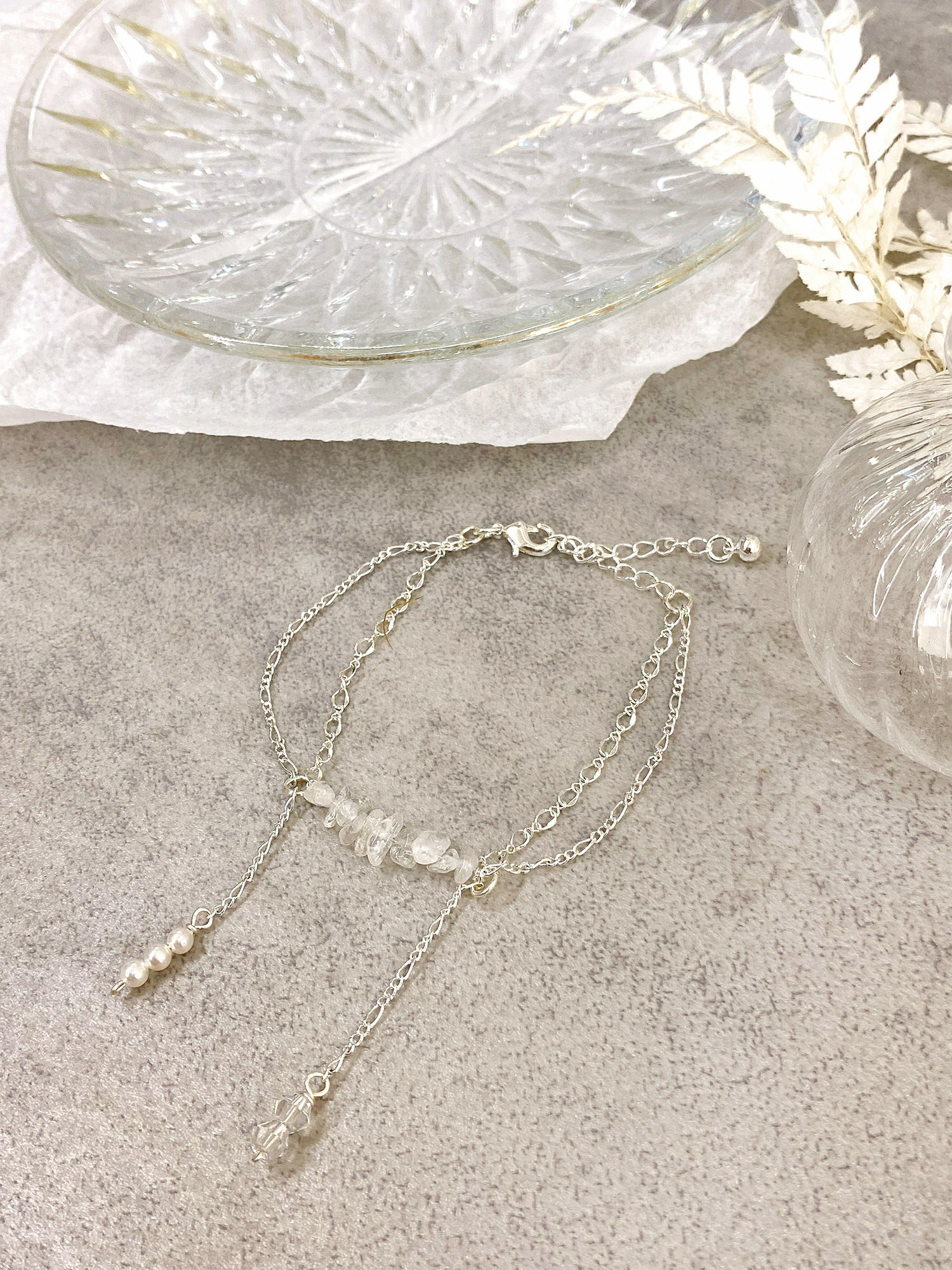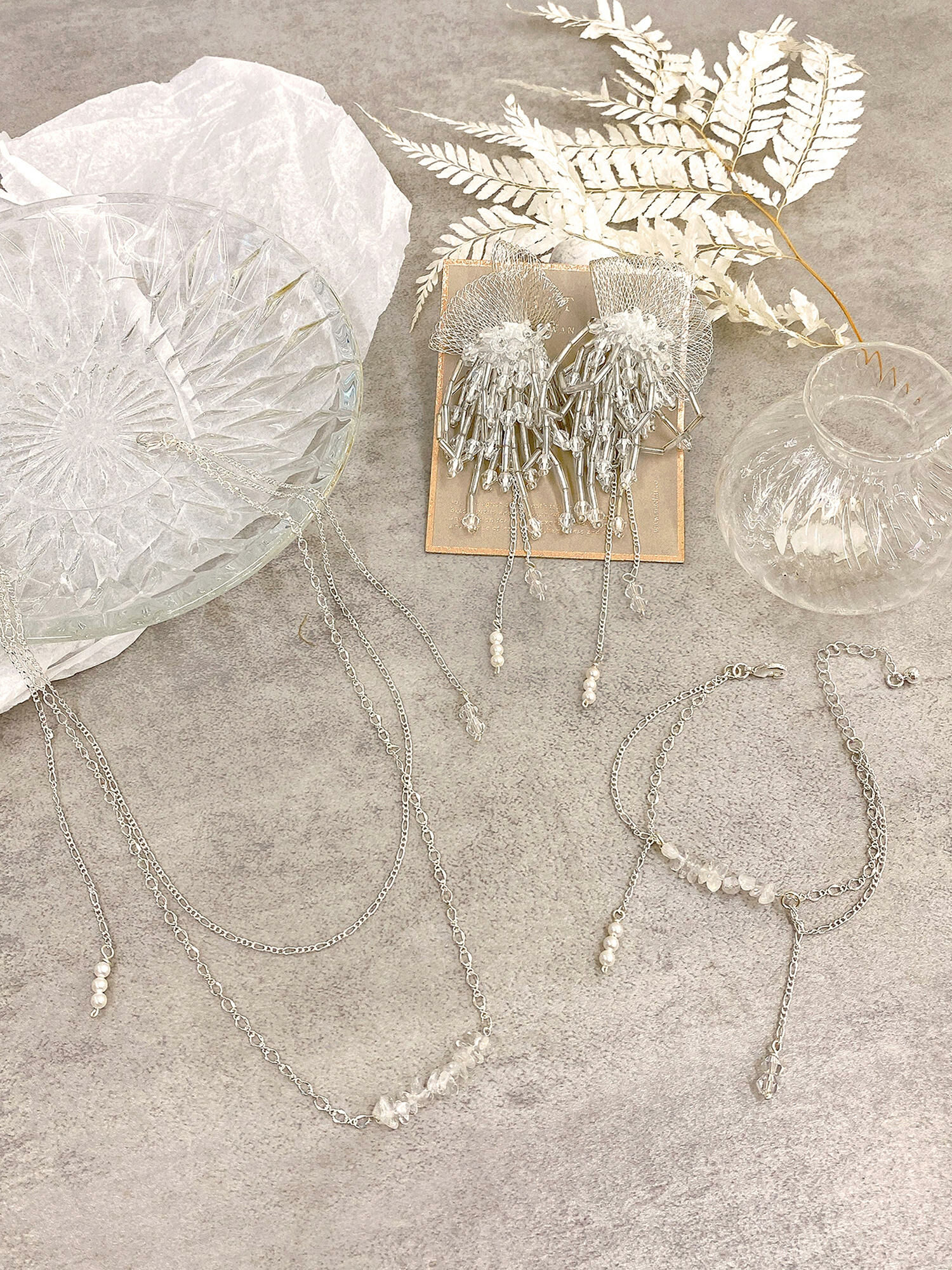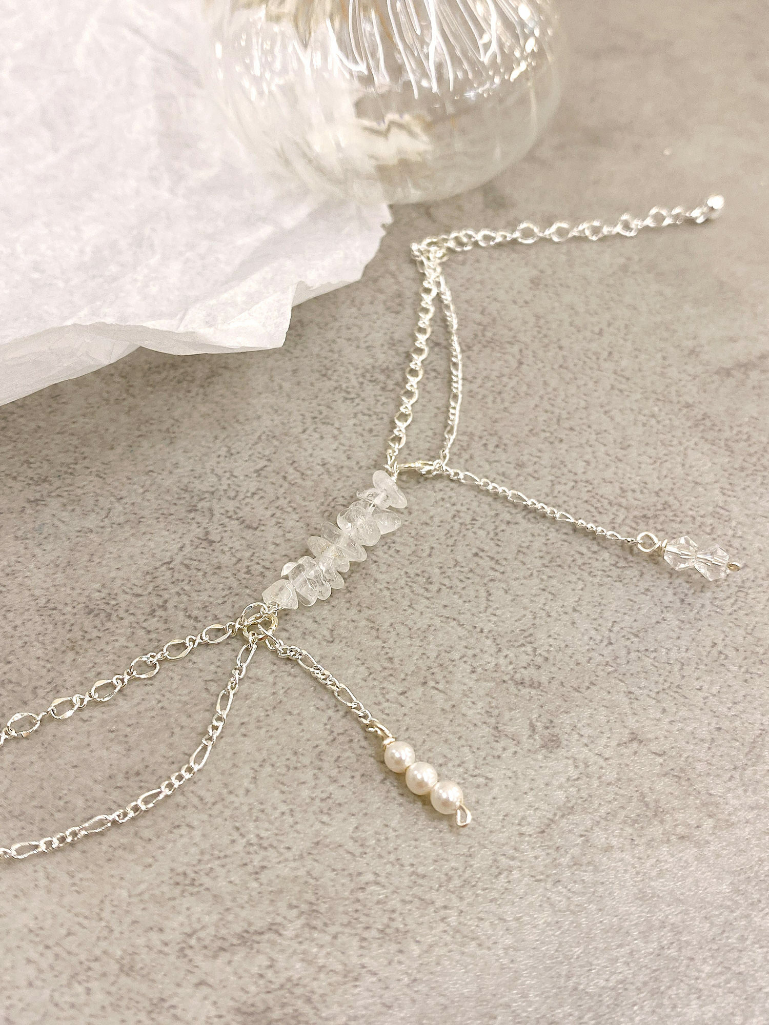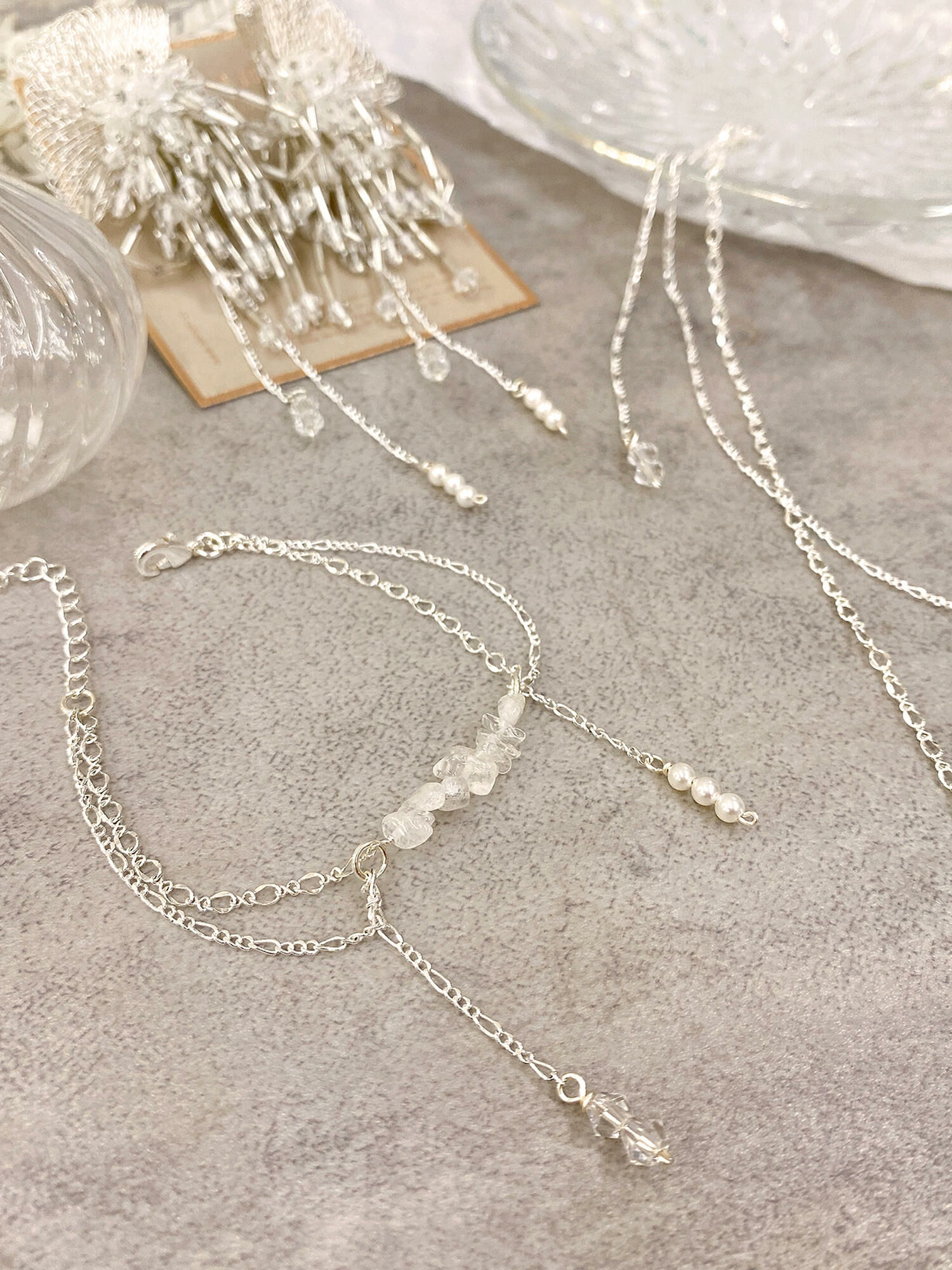 ▸ 素材:鍍白銀、白水晶碎石、水晶珠、仿珠等複合材質