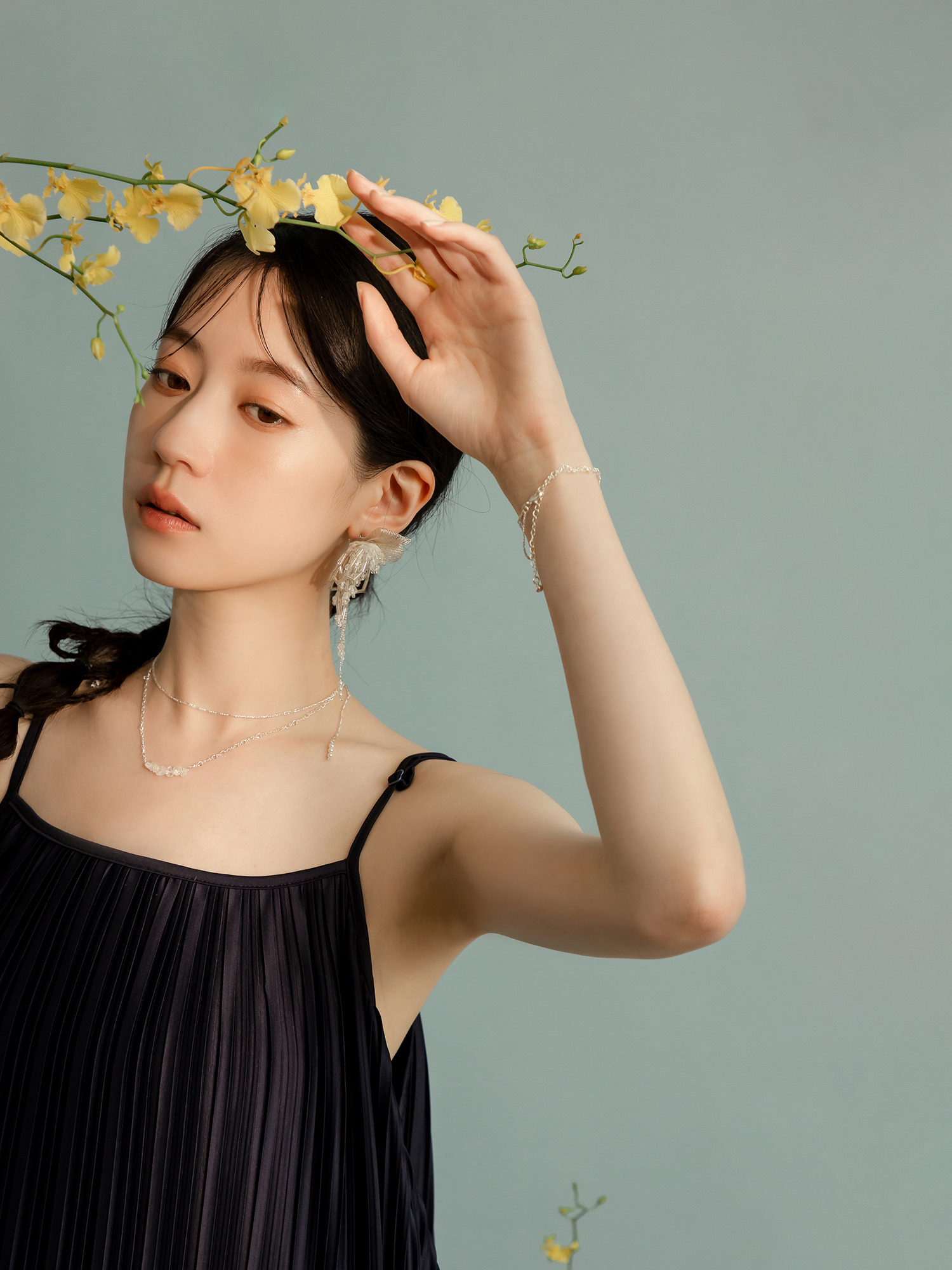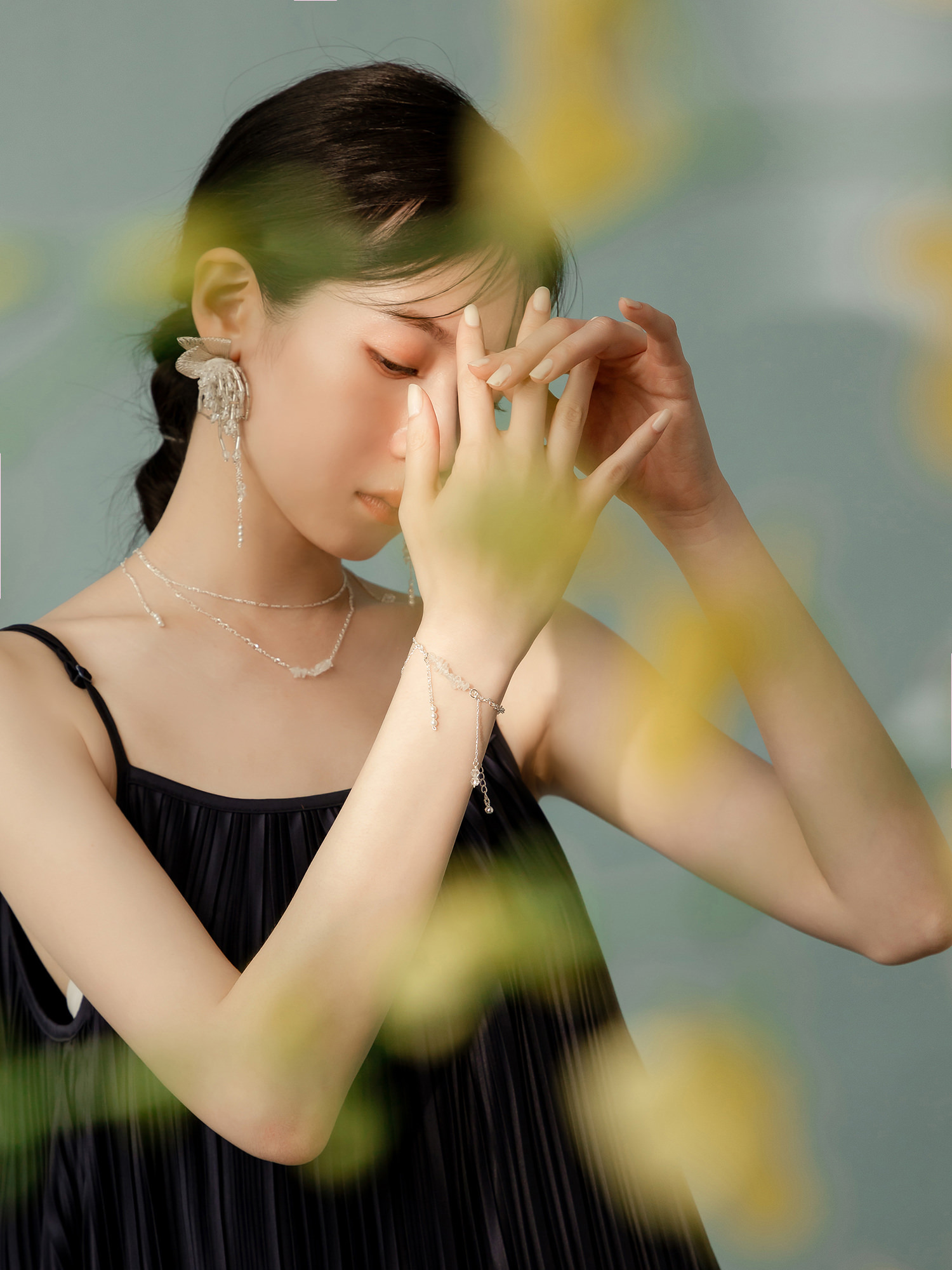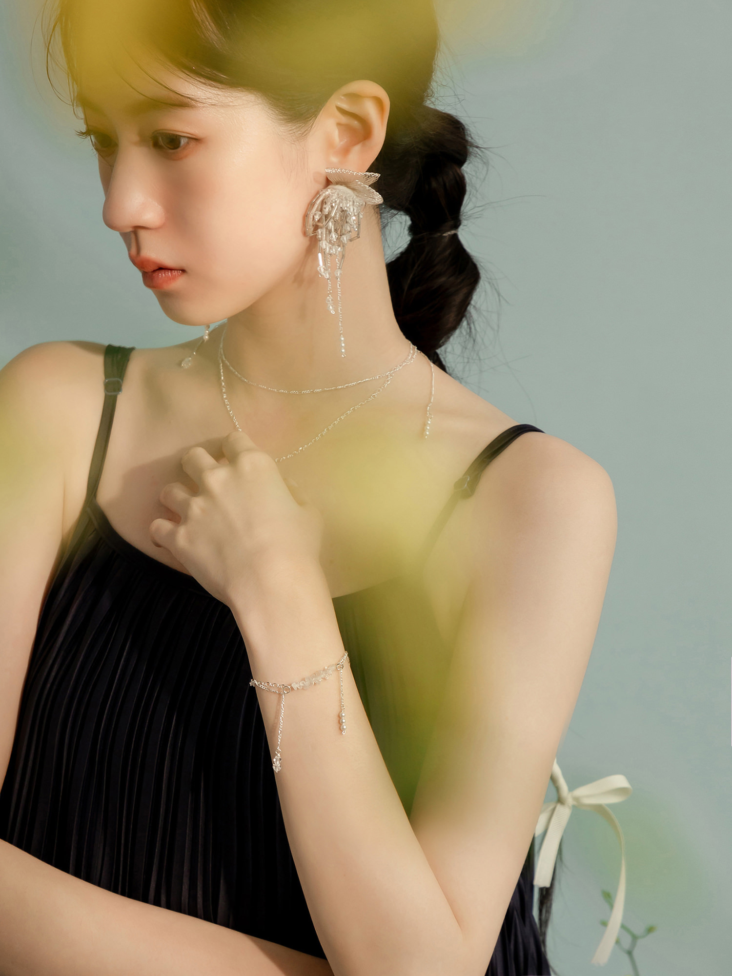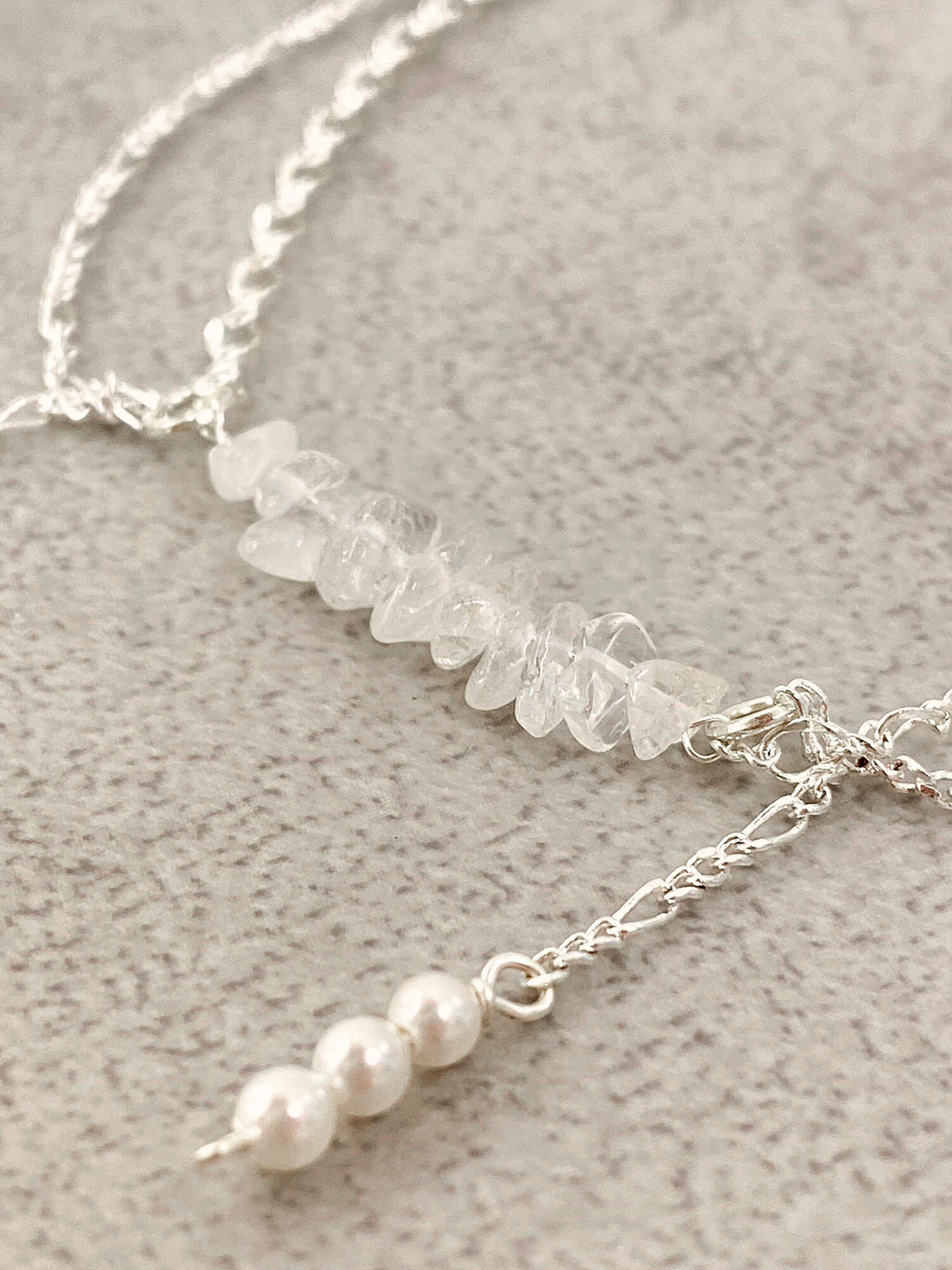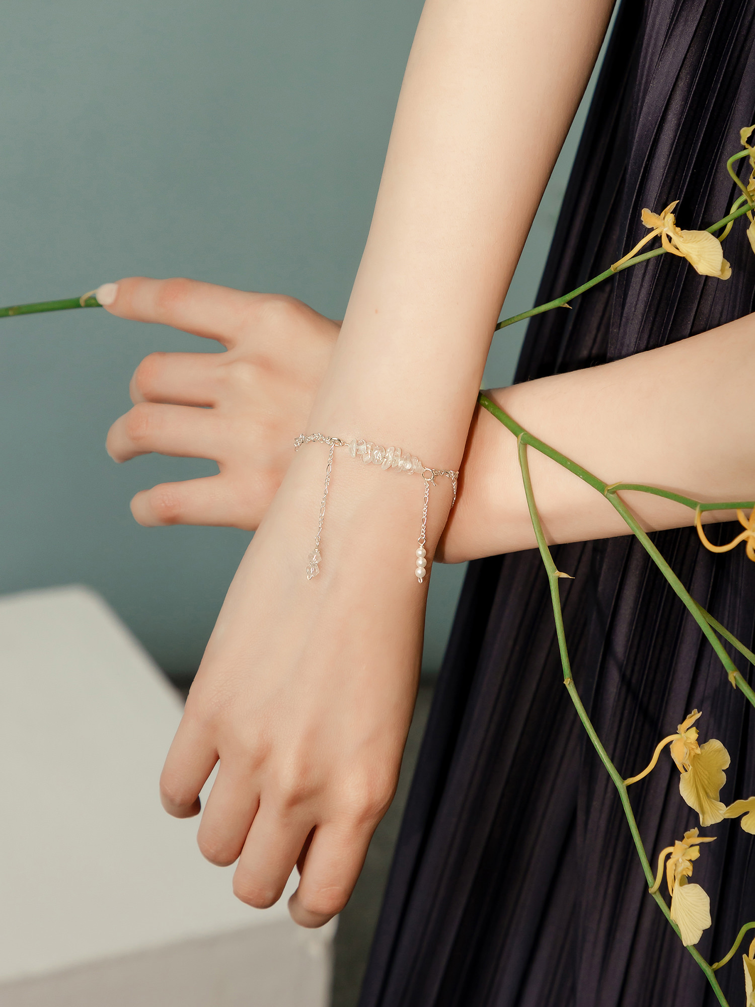 ▸ 素材:鍍白銀、白水晶碎石、水晶珠、仿珠等複合材質