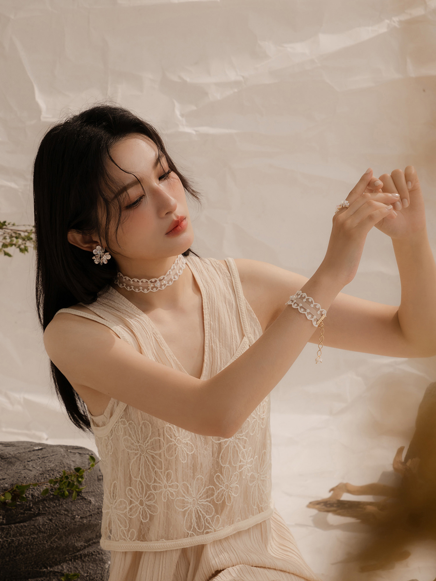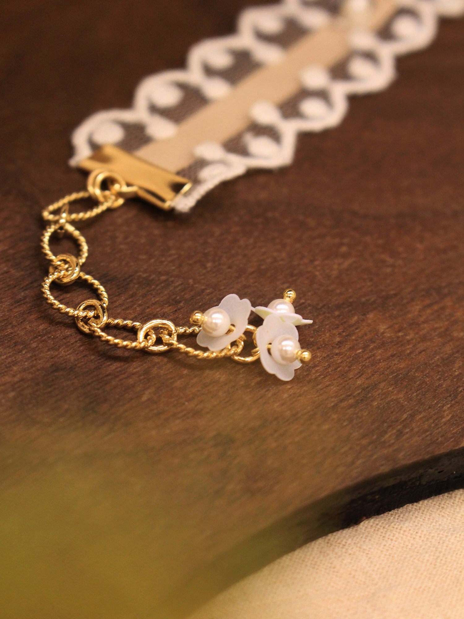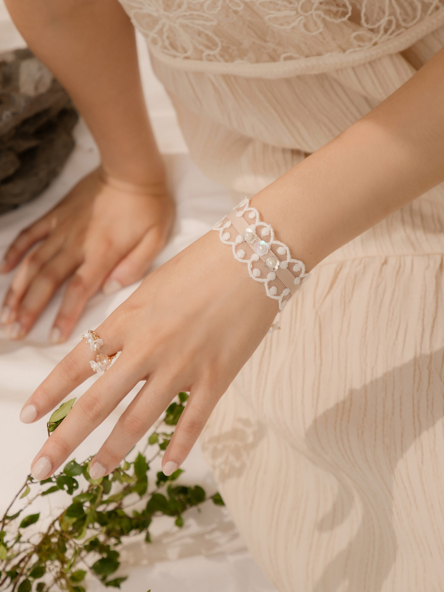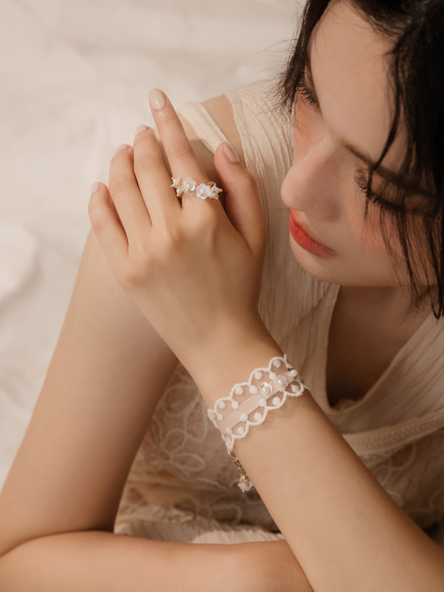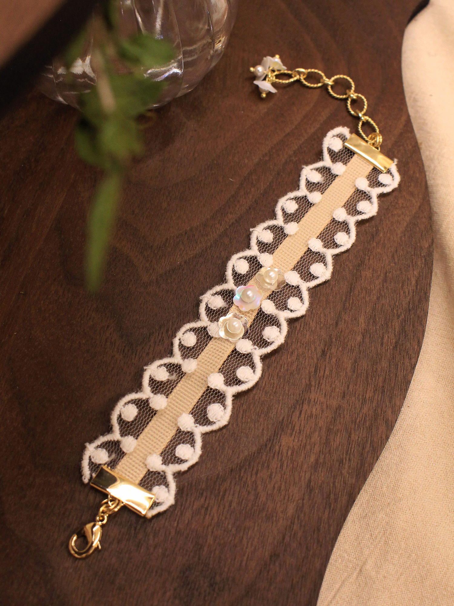 ▸ 素材:銅鍍14+18KGP、仿珠、亮片、緞帶、聚酯纖維等複合材質