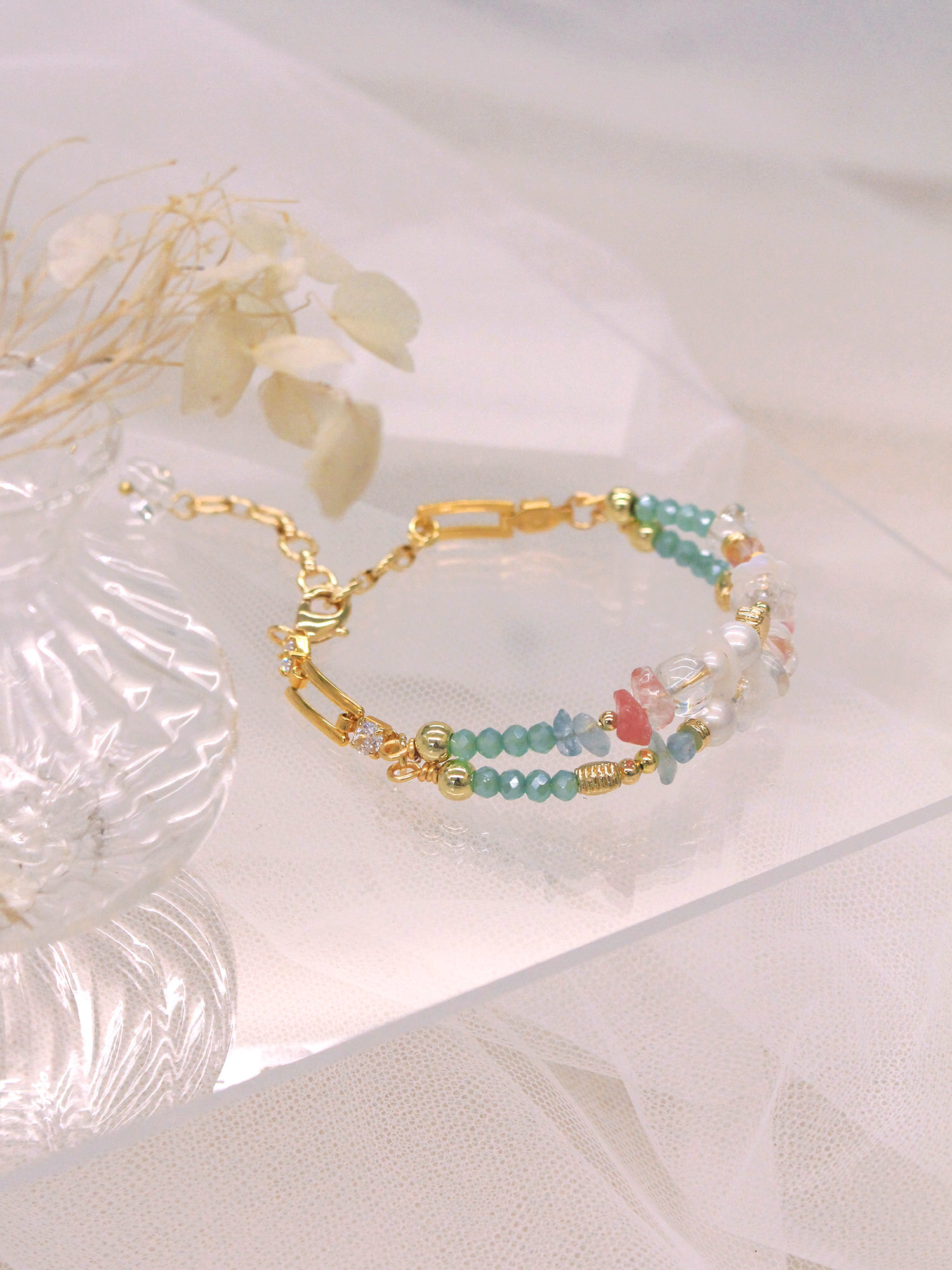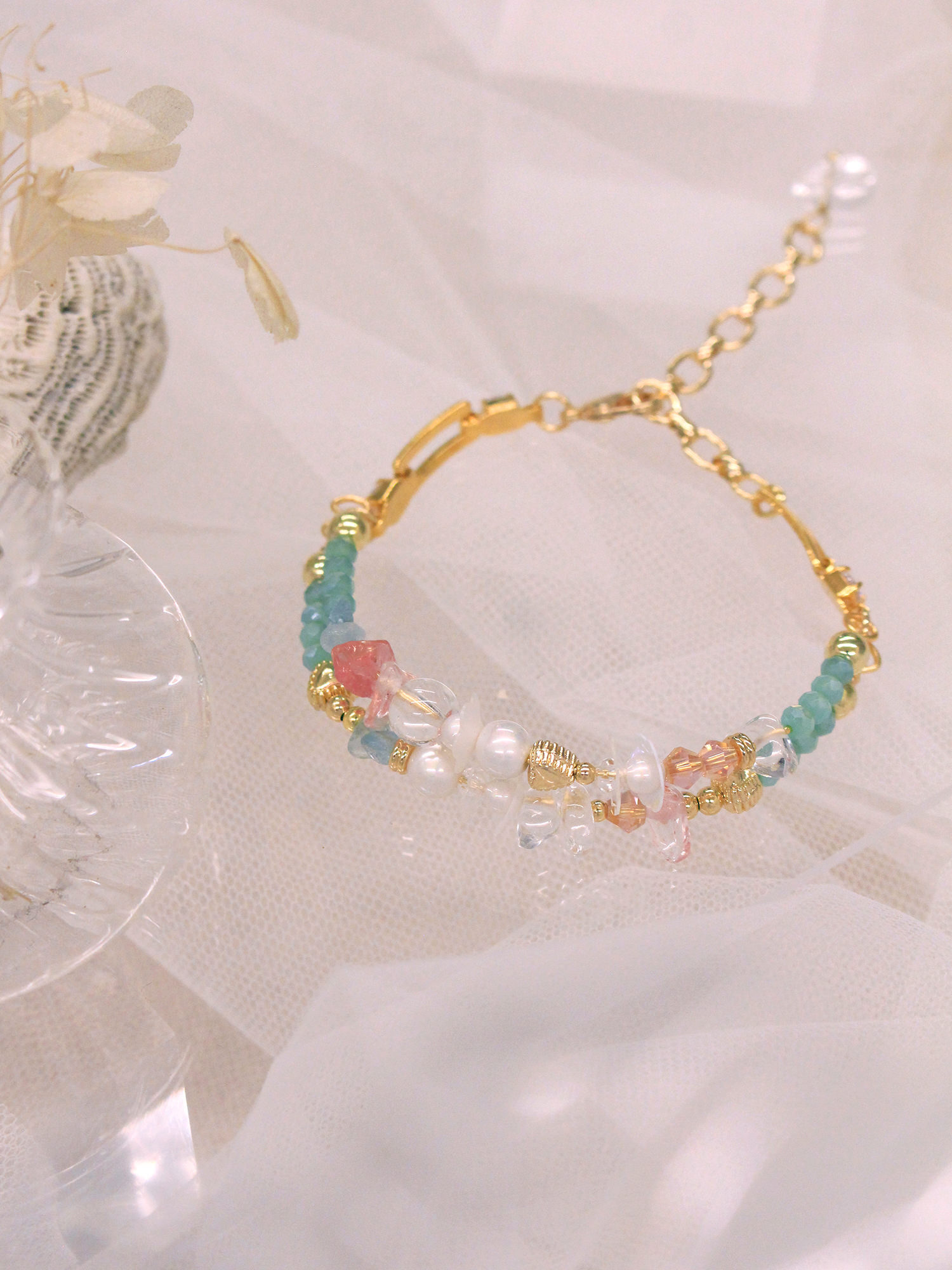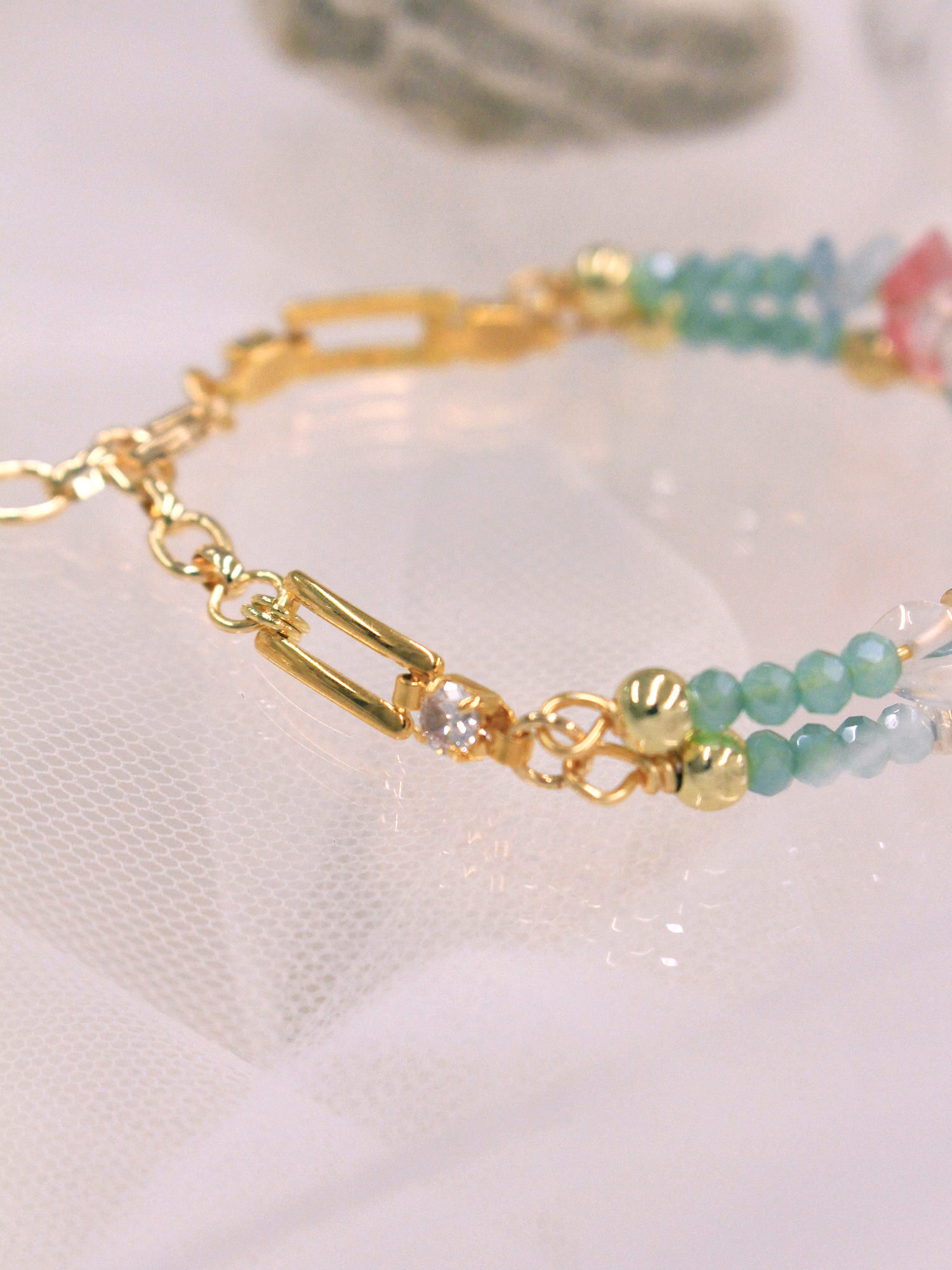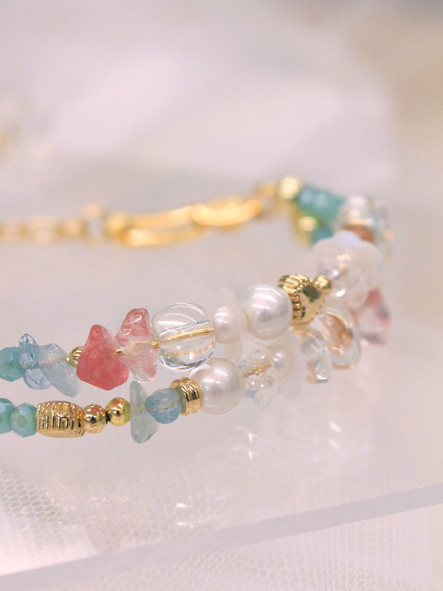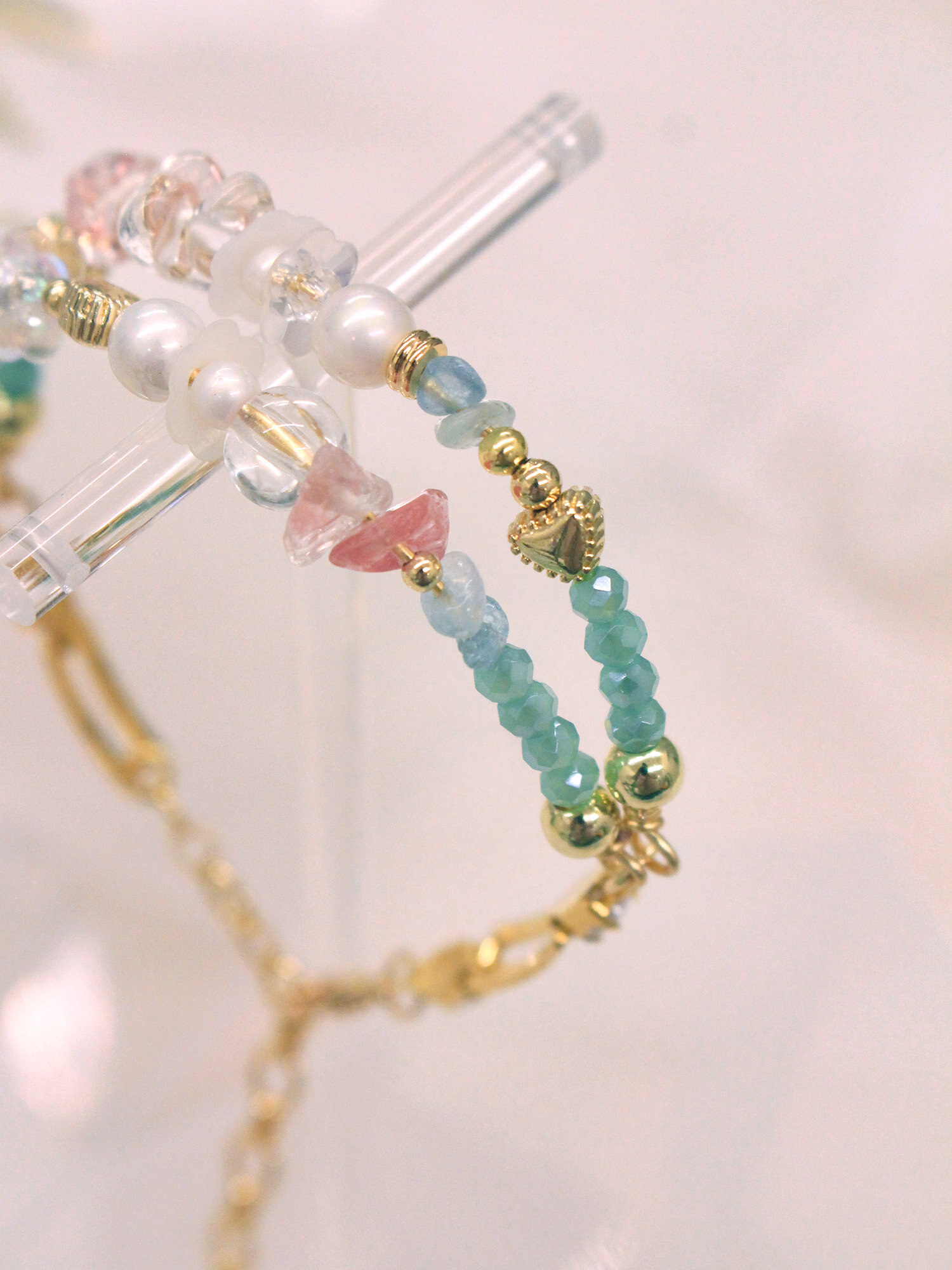 ▸ 素材:銅鍍14KGP、仿珠、亮片、海藍寶、西瓜晶、白水晶、鋯石、水晶珠等複合材質