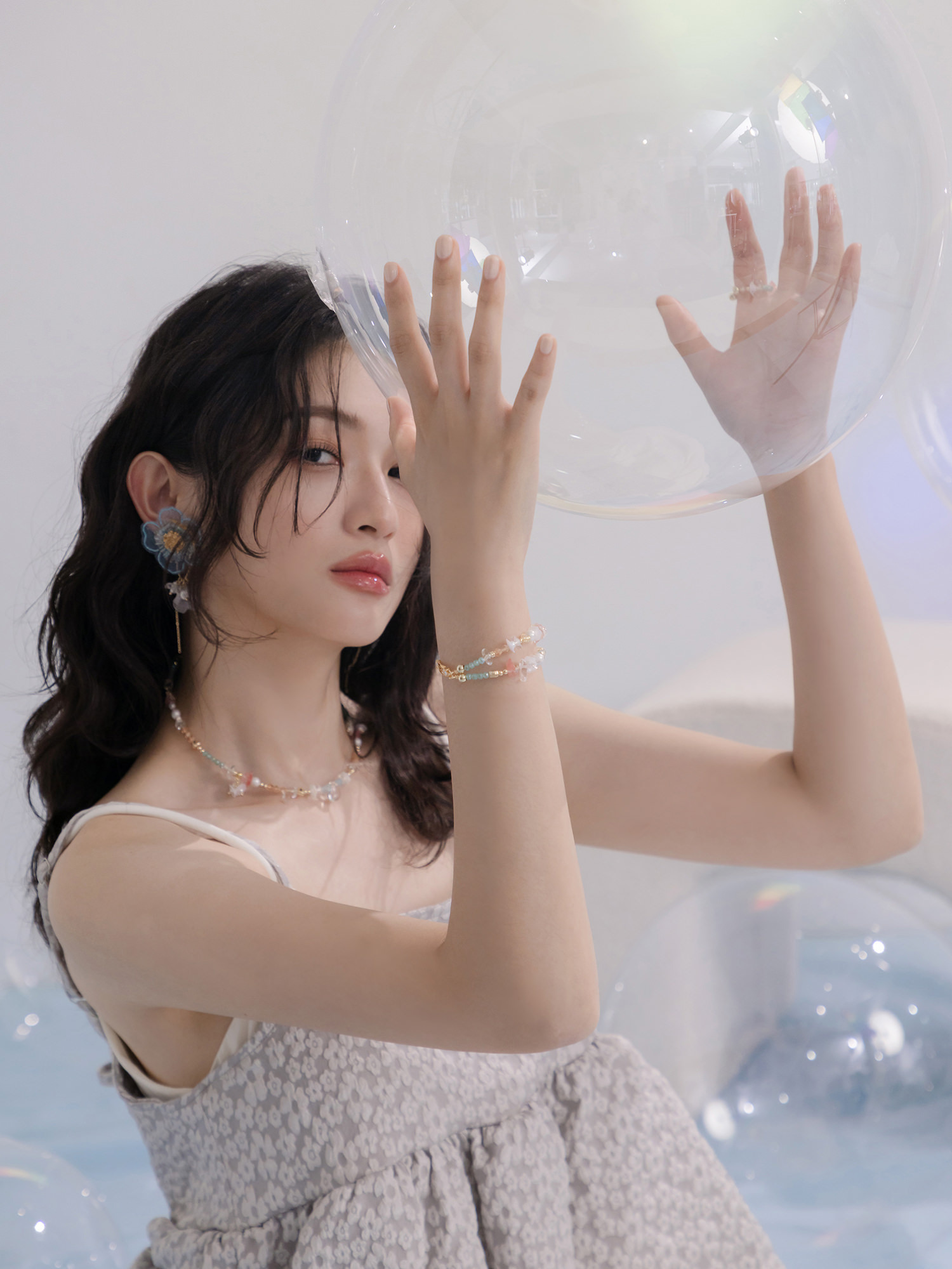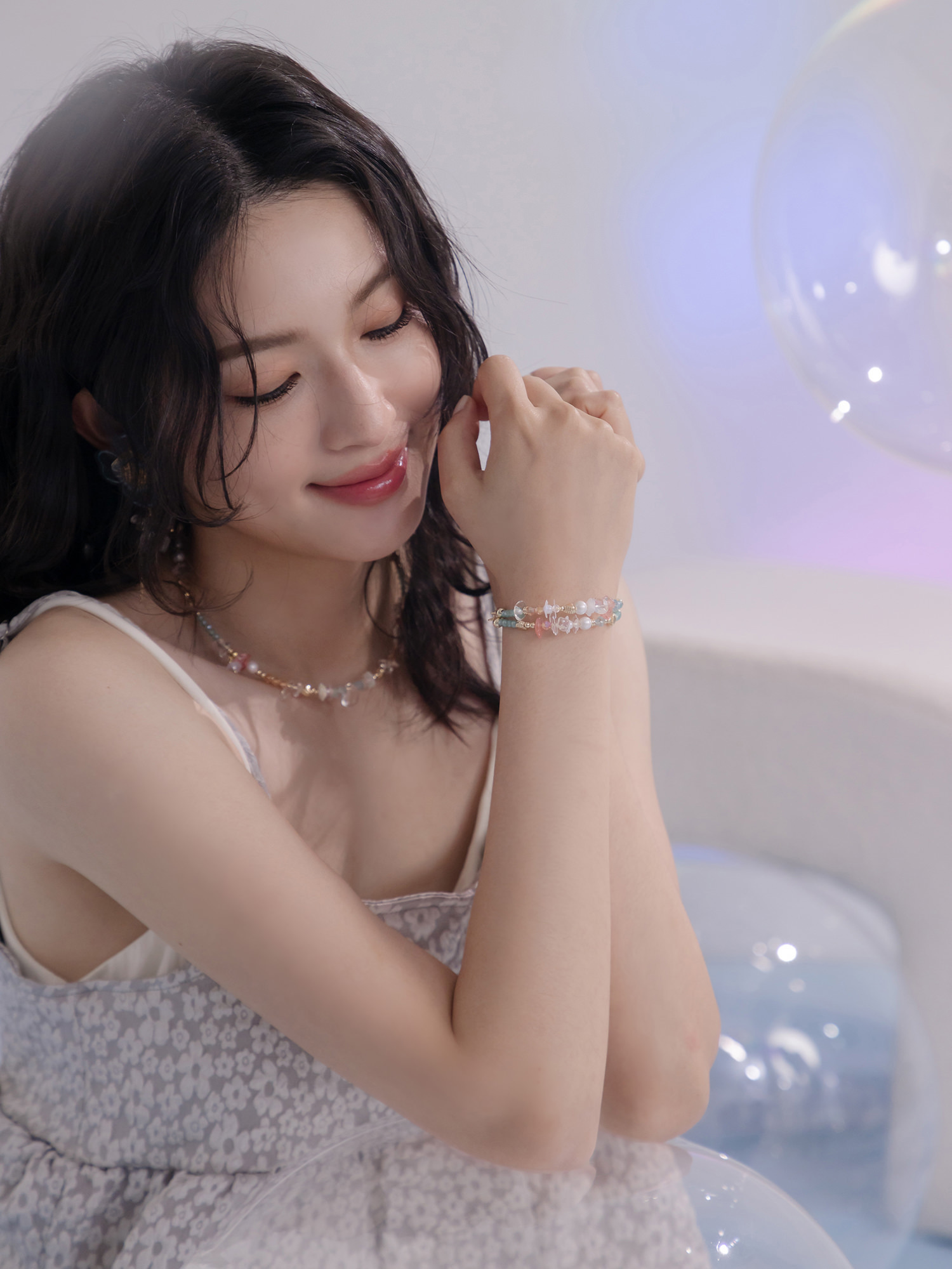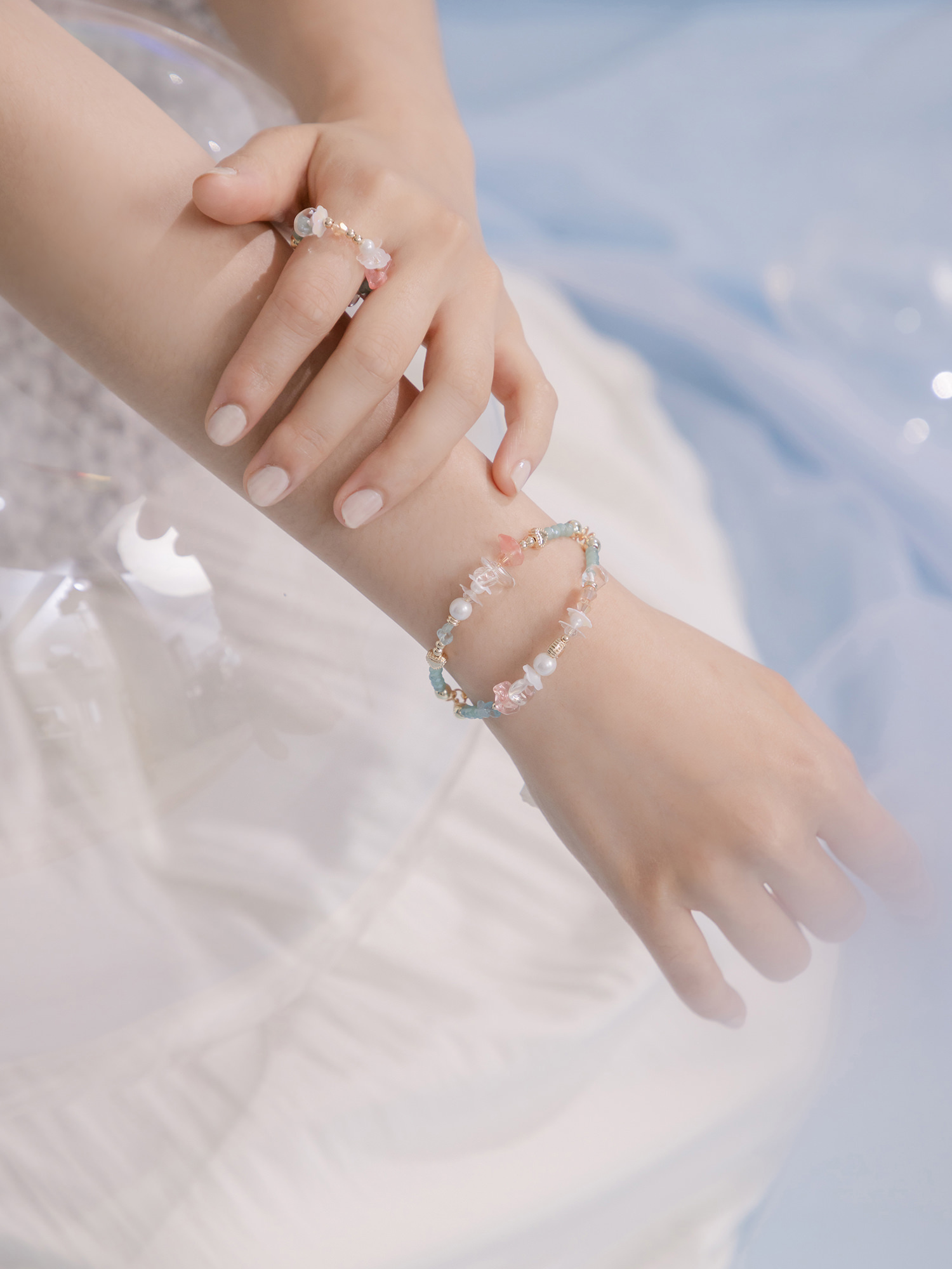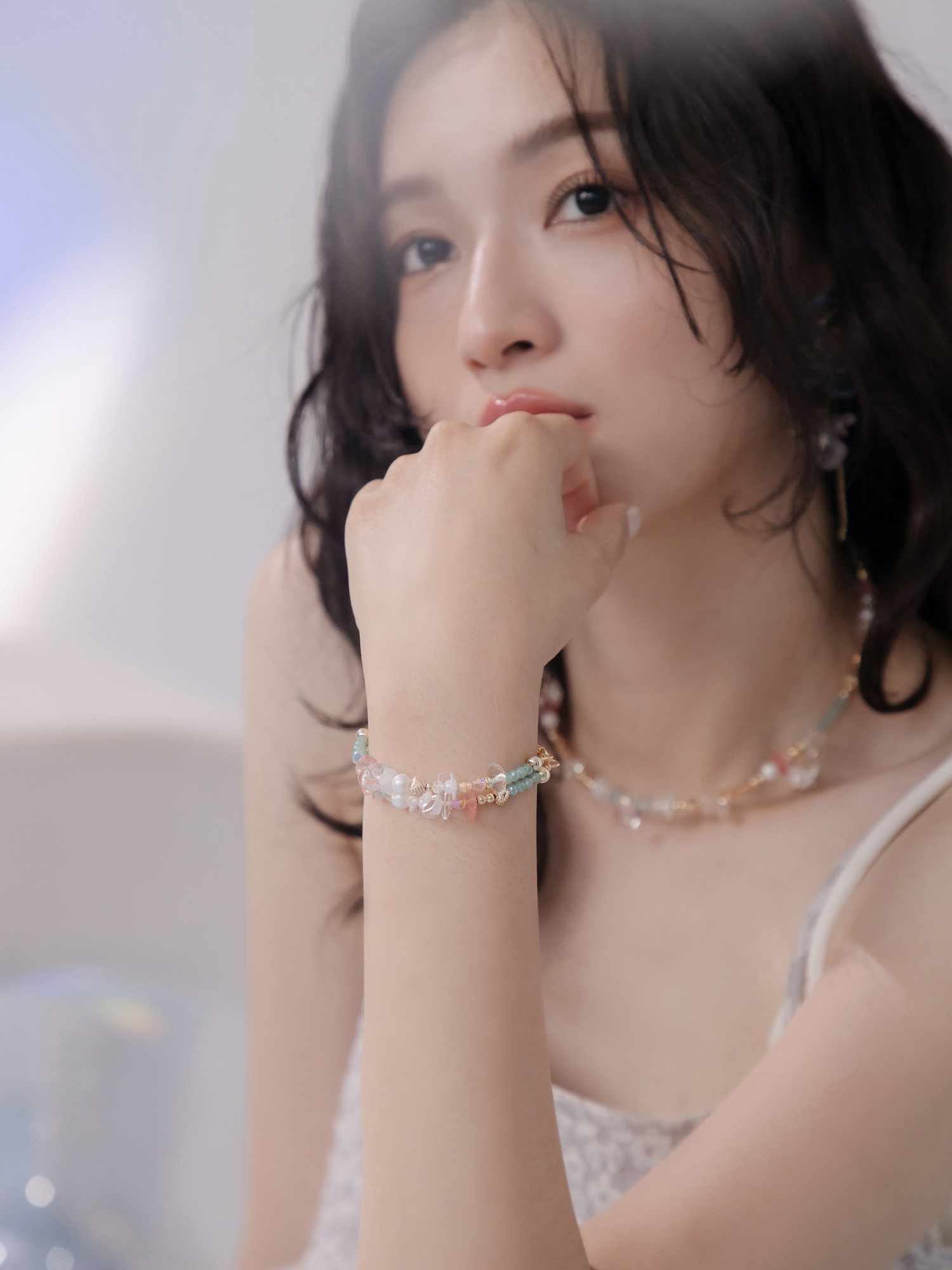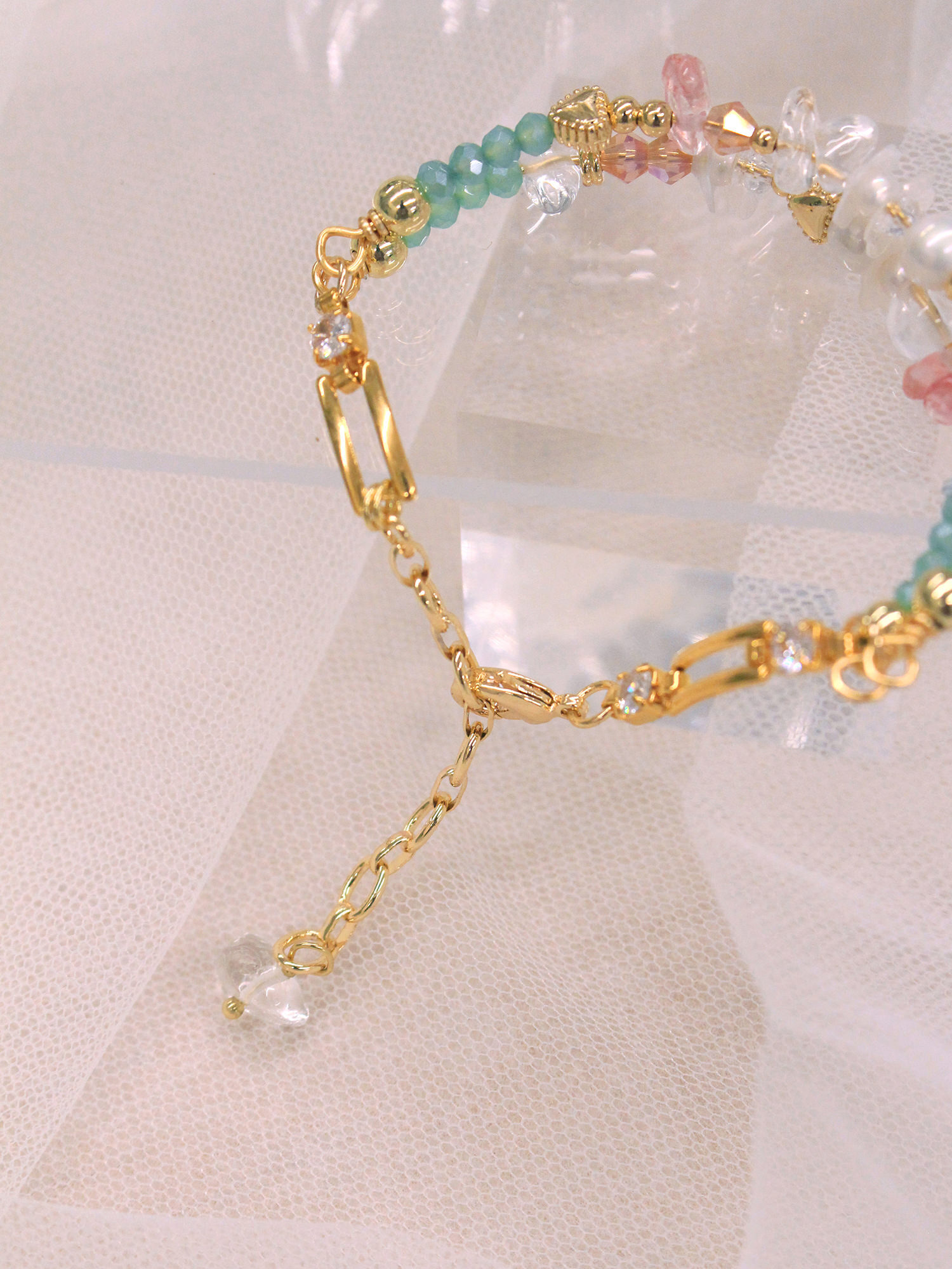 ▸ 素材:銅鍍14KGP、仿珠、亮片、海藍寶、西瓜晶、白水晶、鋯石、水晶珠等複合材質