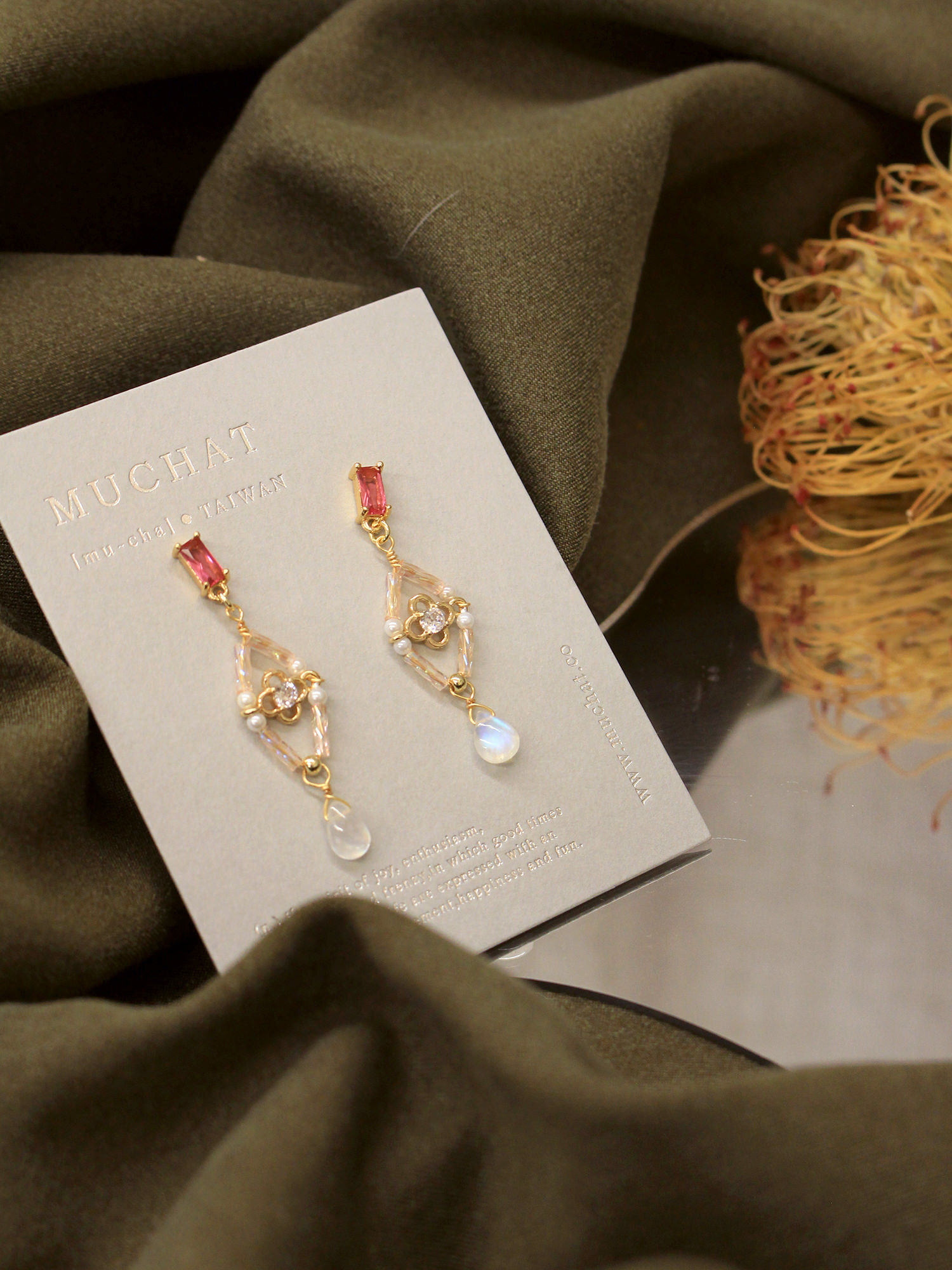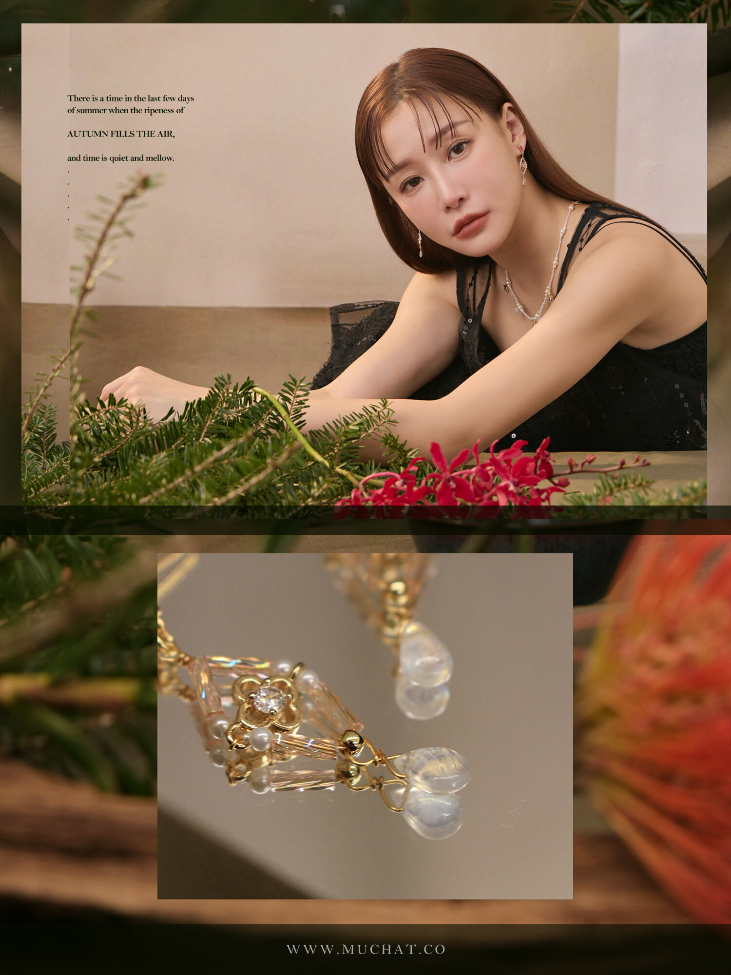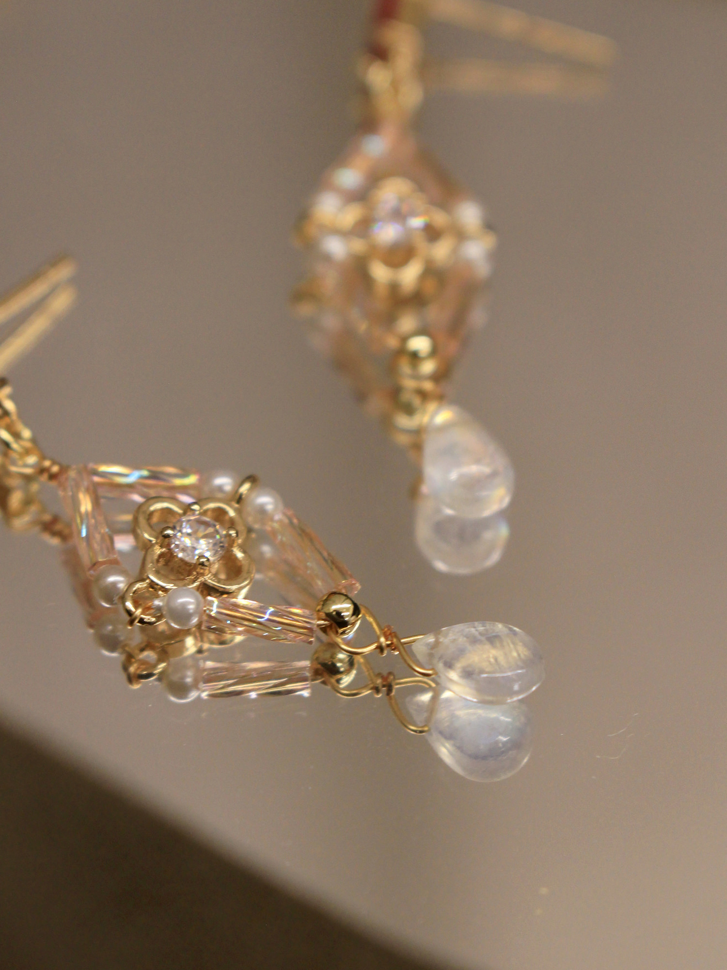 ▸ 素材:銅鍍14KGP、月光石、仿珠、串珠、鋯石、水晶等複合材質