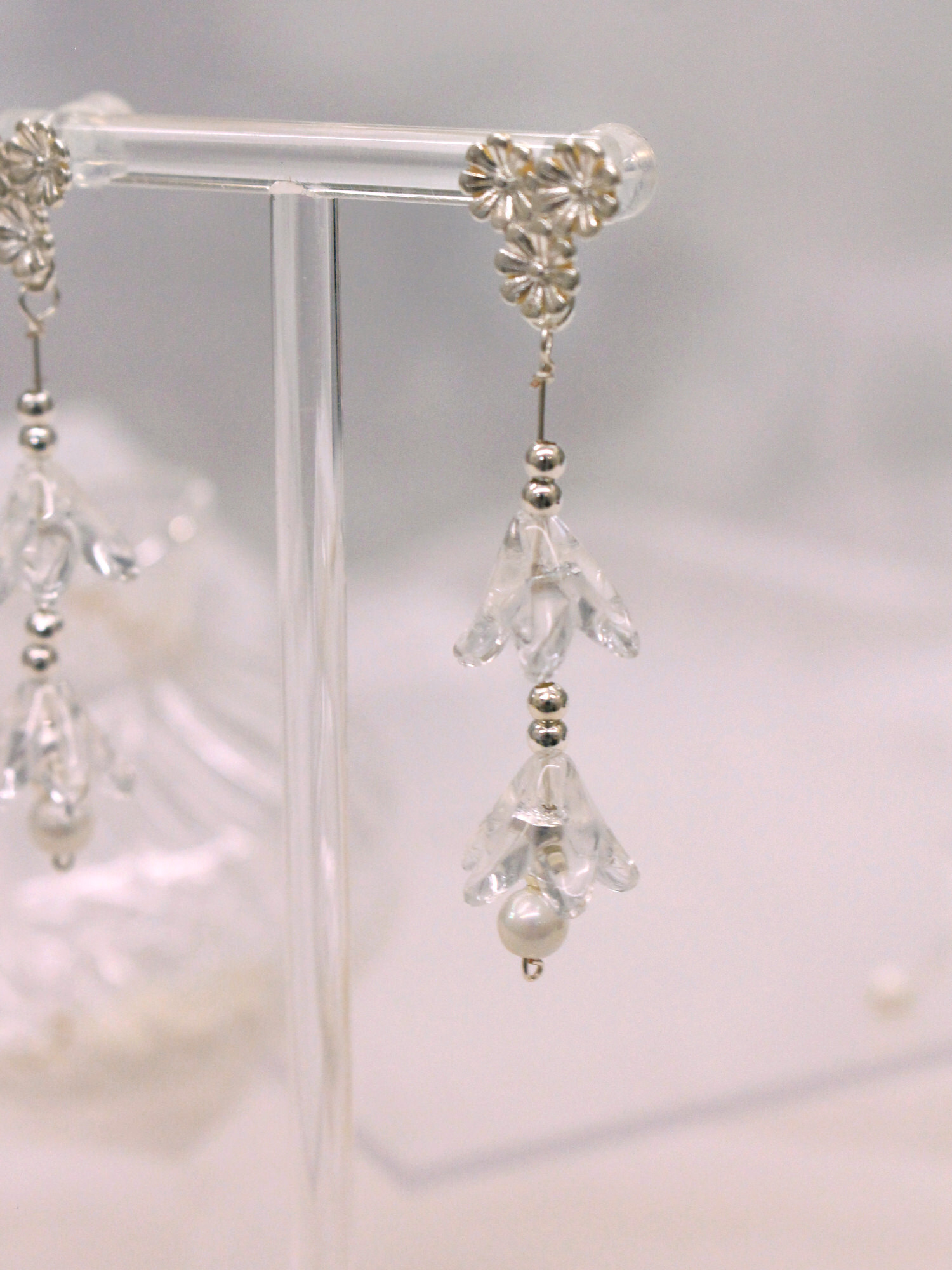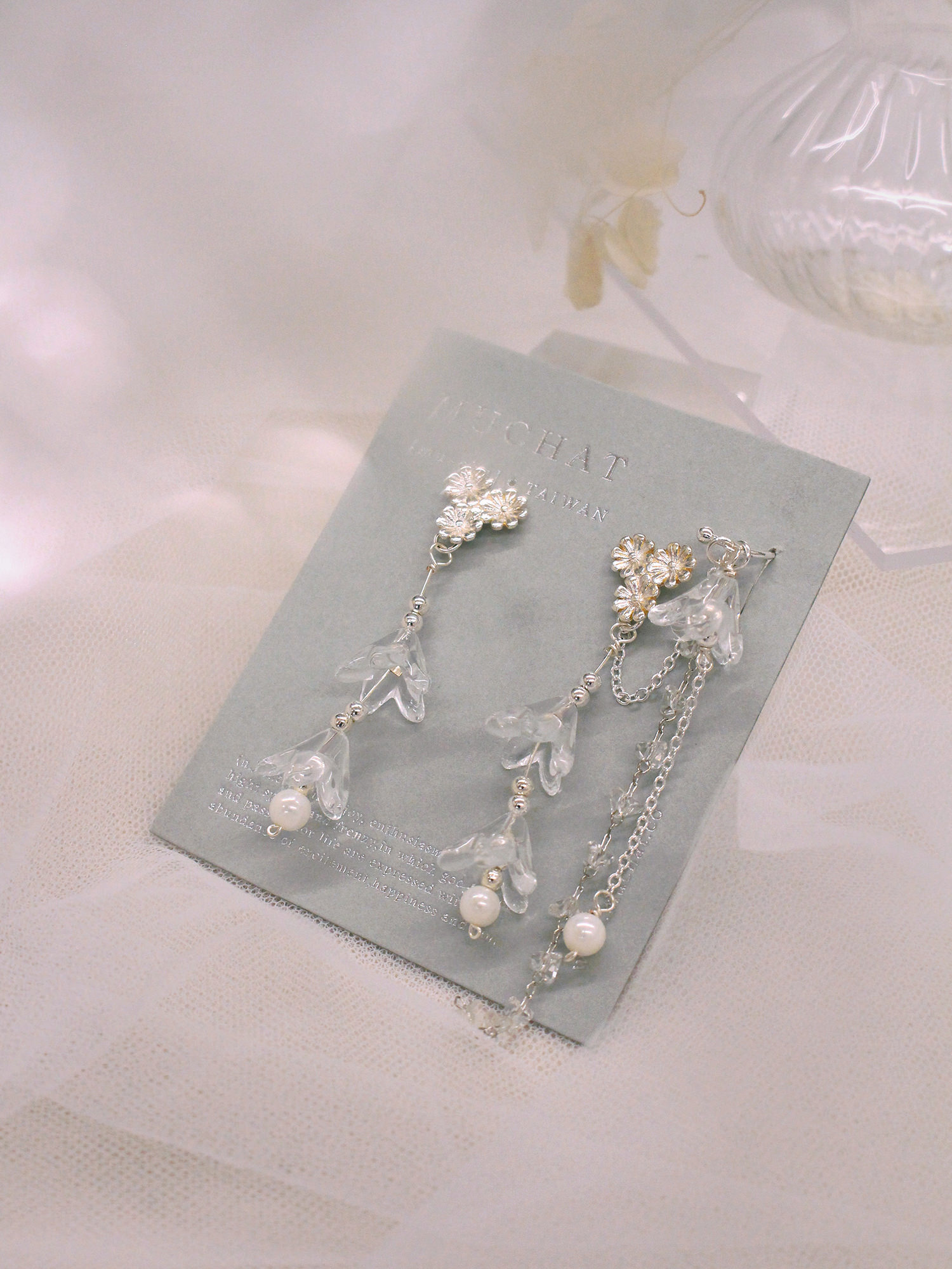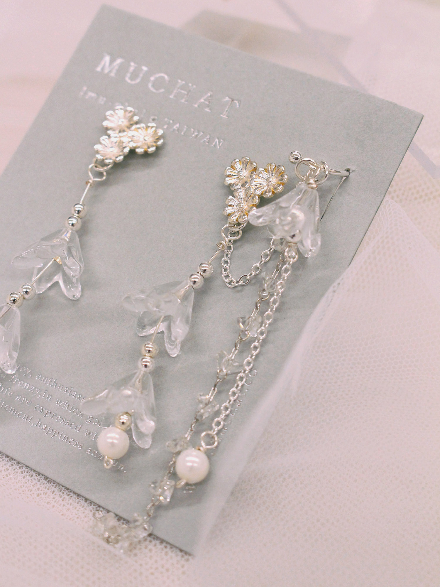 ▸ 素材:銅鍍白K、三角水晶、樹酯、串珠、仿珠等複合材質