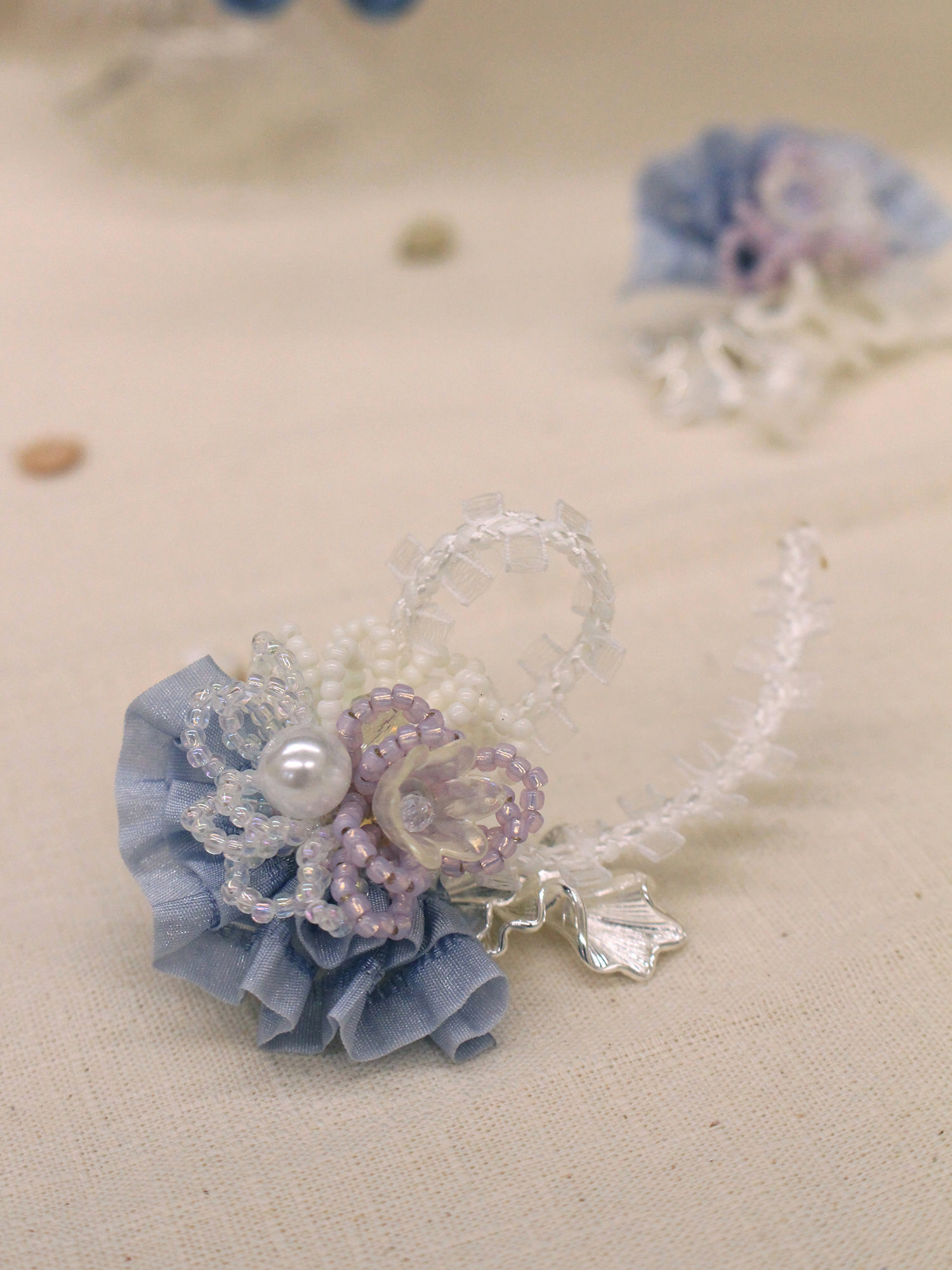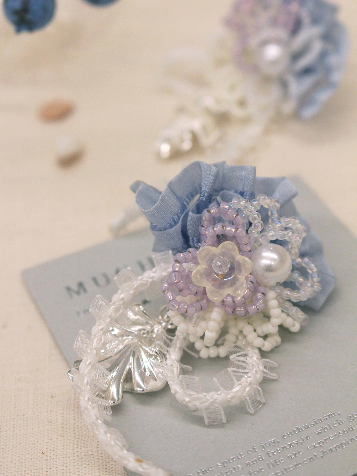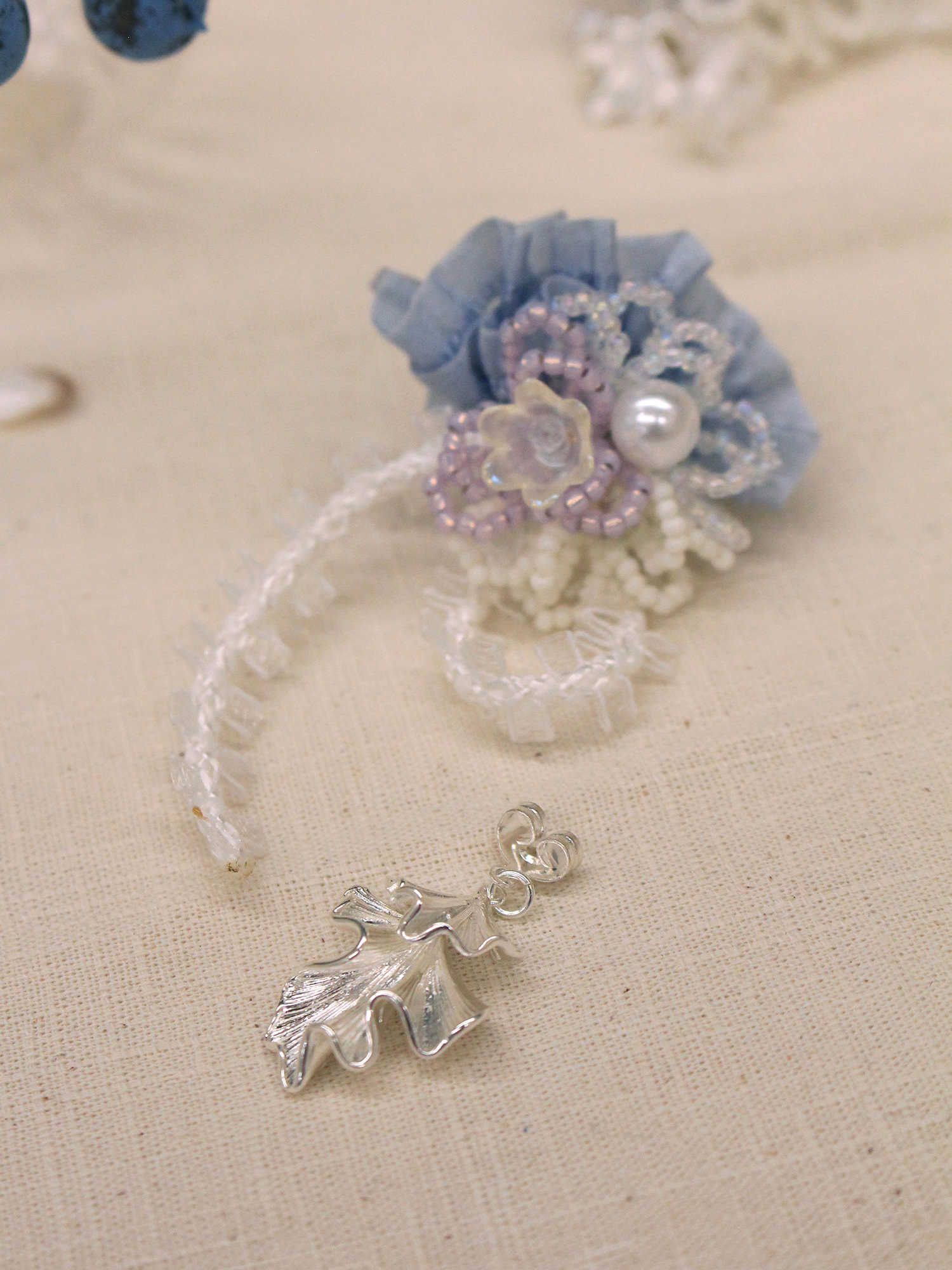 ▸ 素材:銅鍍銀、仿珠、樹酯、串珠、緞帶、聚酯纖維等複合材質