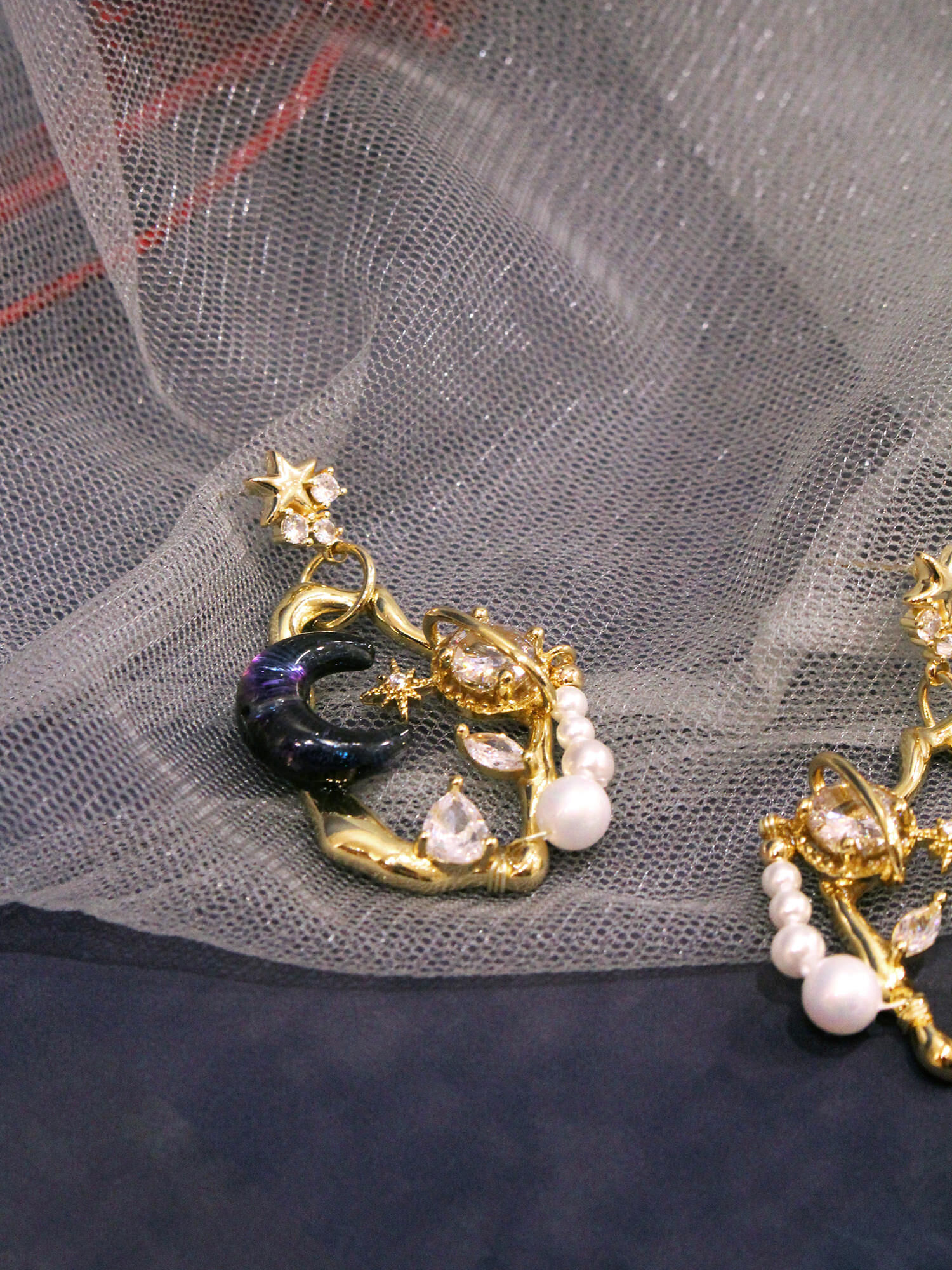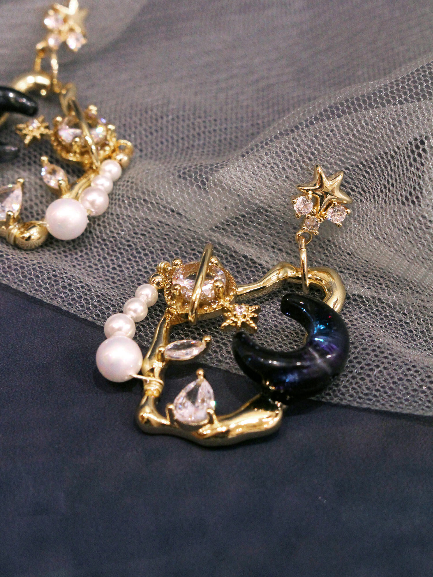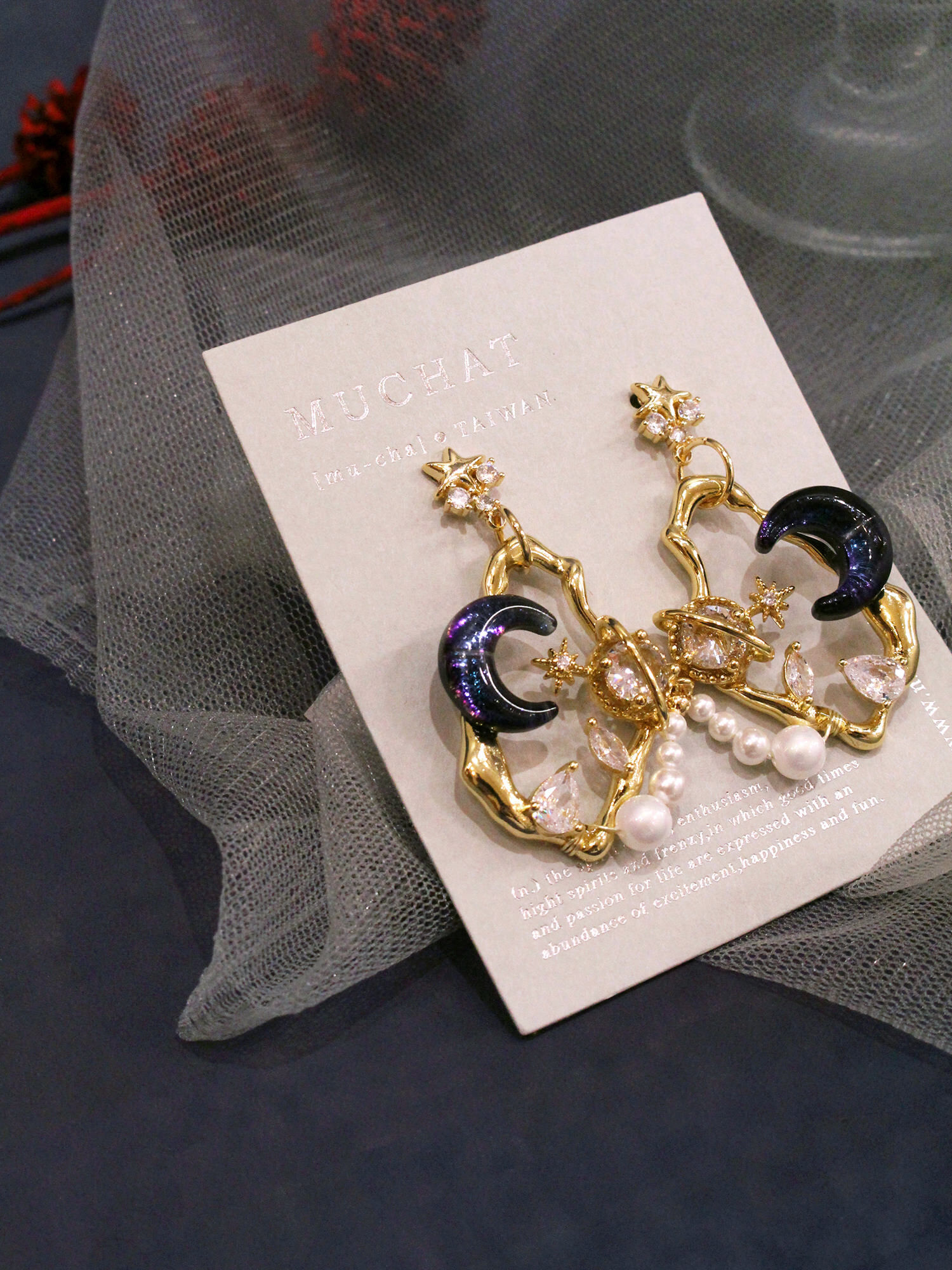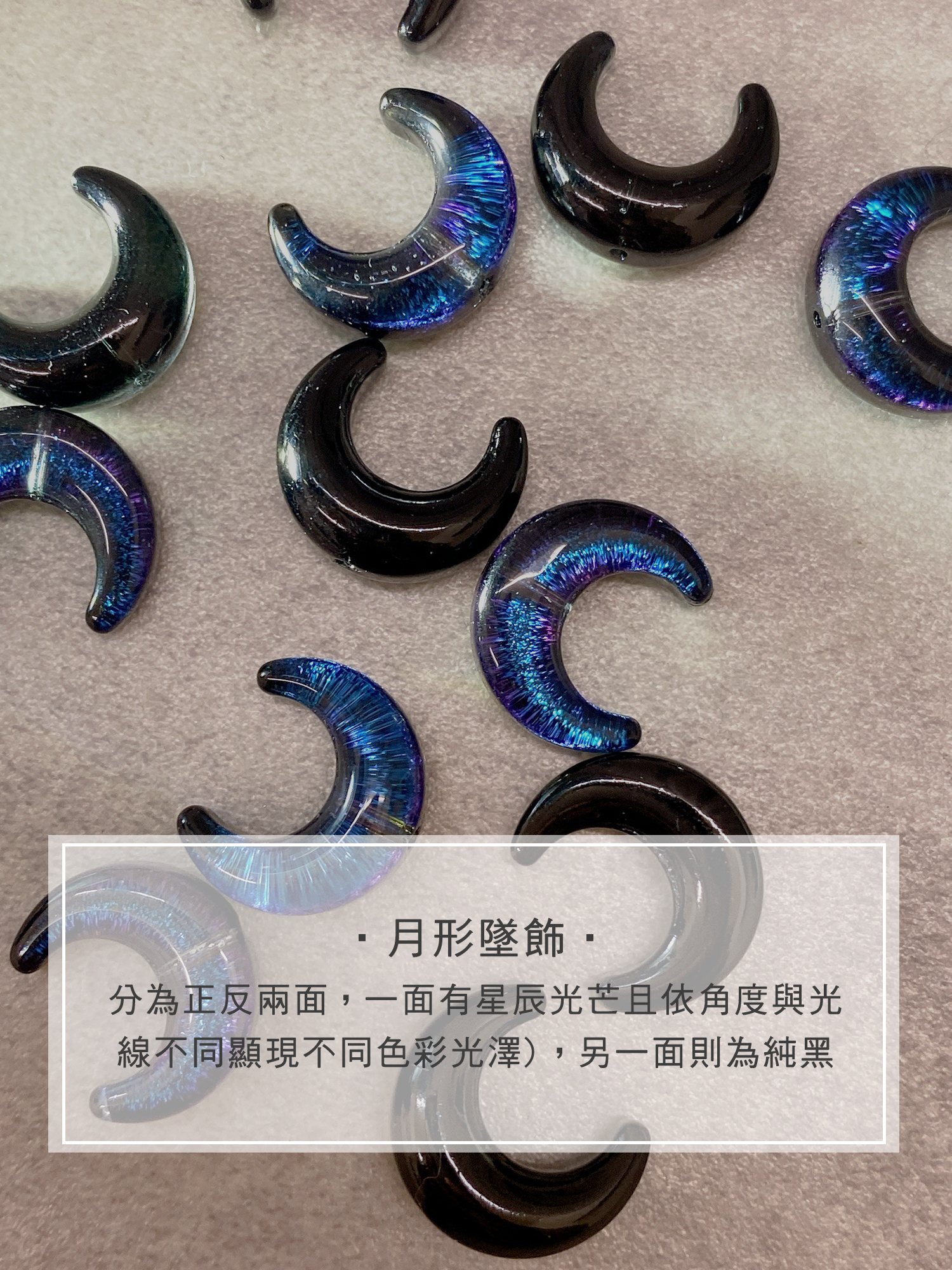 ▸ 素材:銅鍍14+18KGP、月形墜飾(琉璃電鍍)、鋯石、仿珠等複合材質