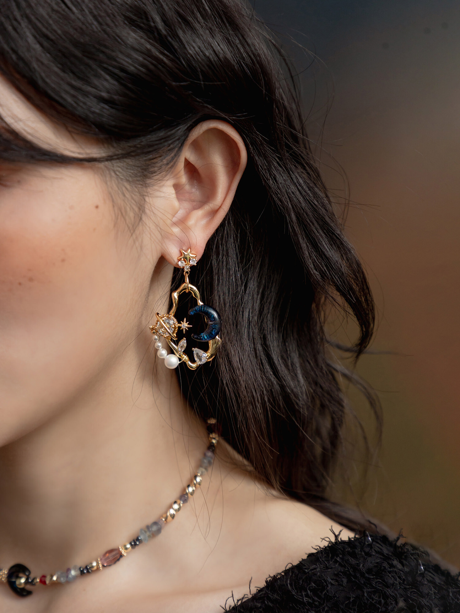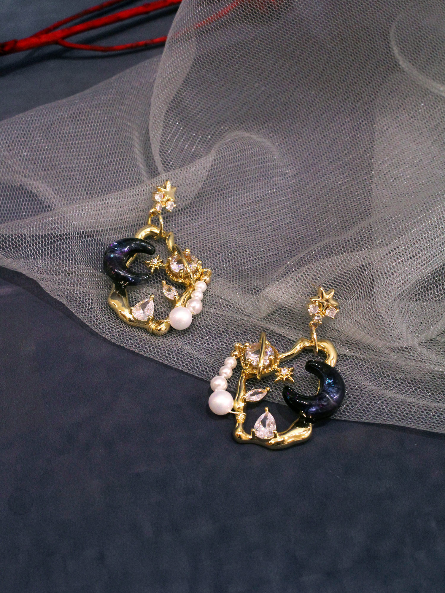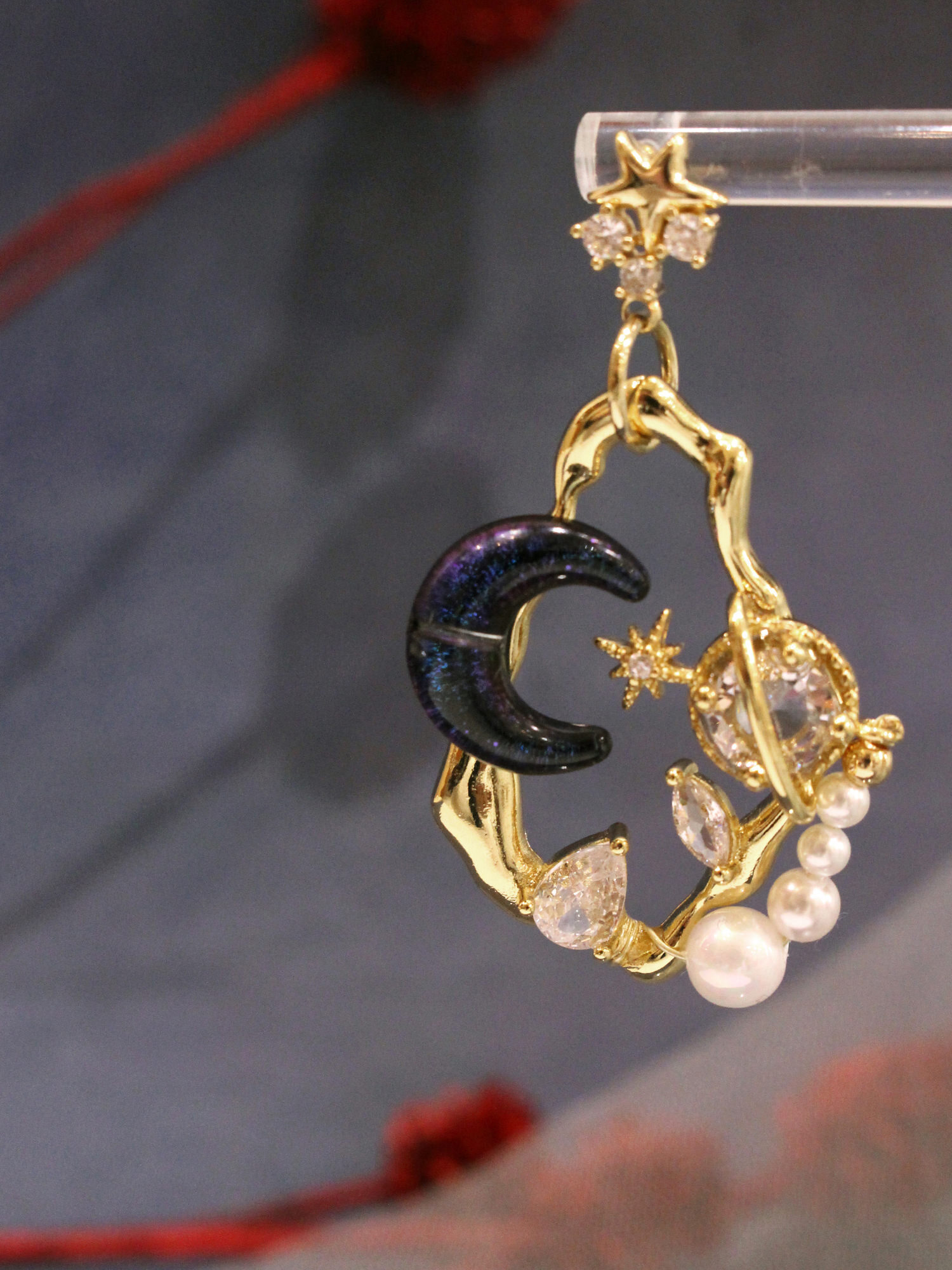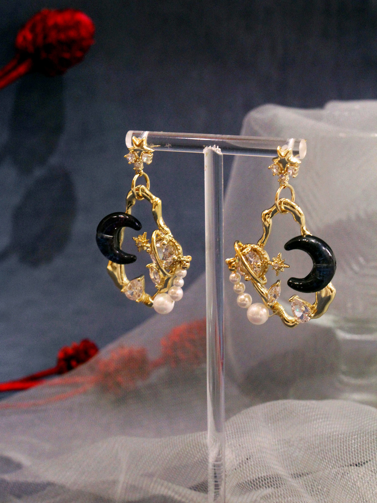 ▸ 素材:銅鍍14+18KGP、月形墜飾(琉璃電鍍)、鋯石、仿珠等複合材質
