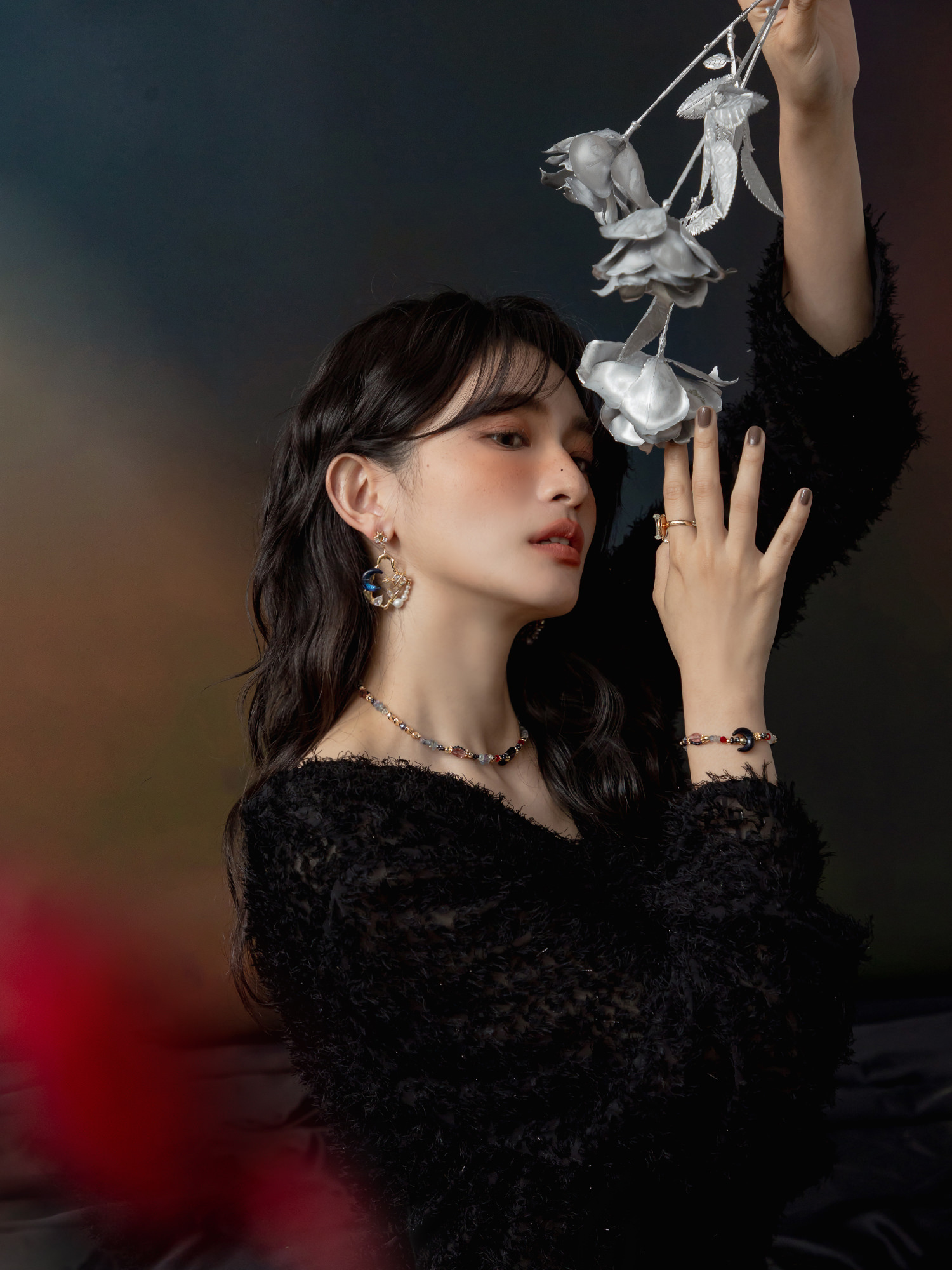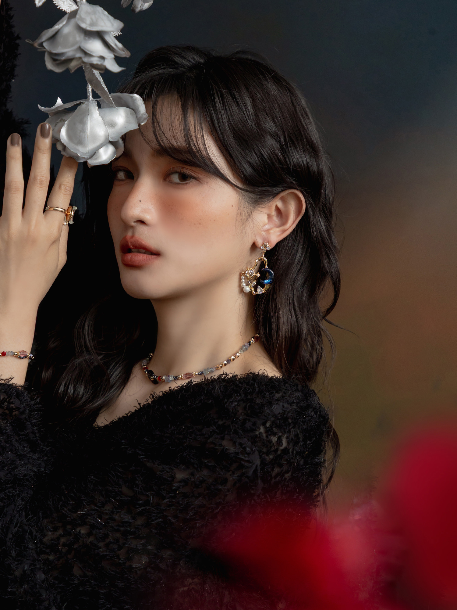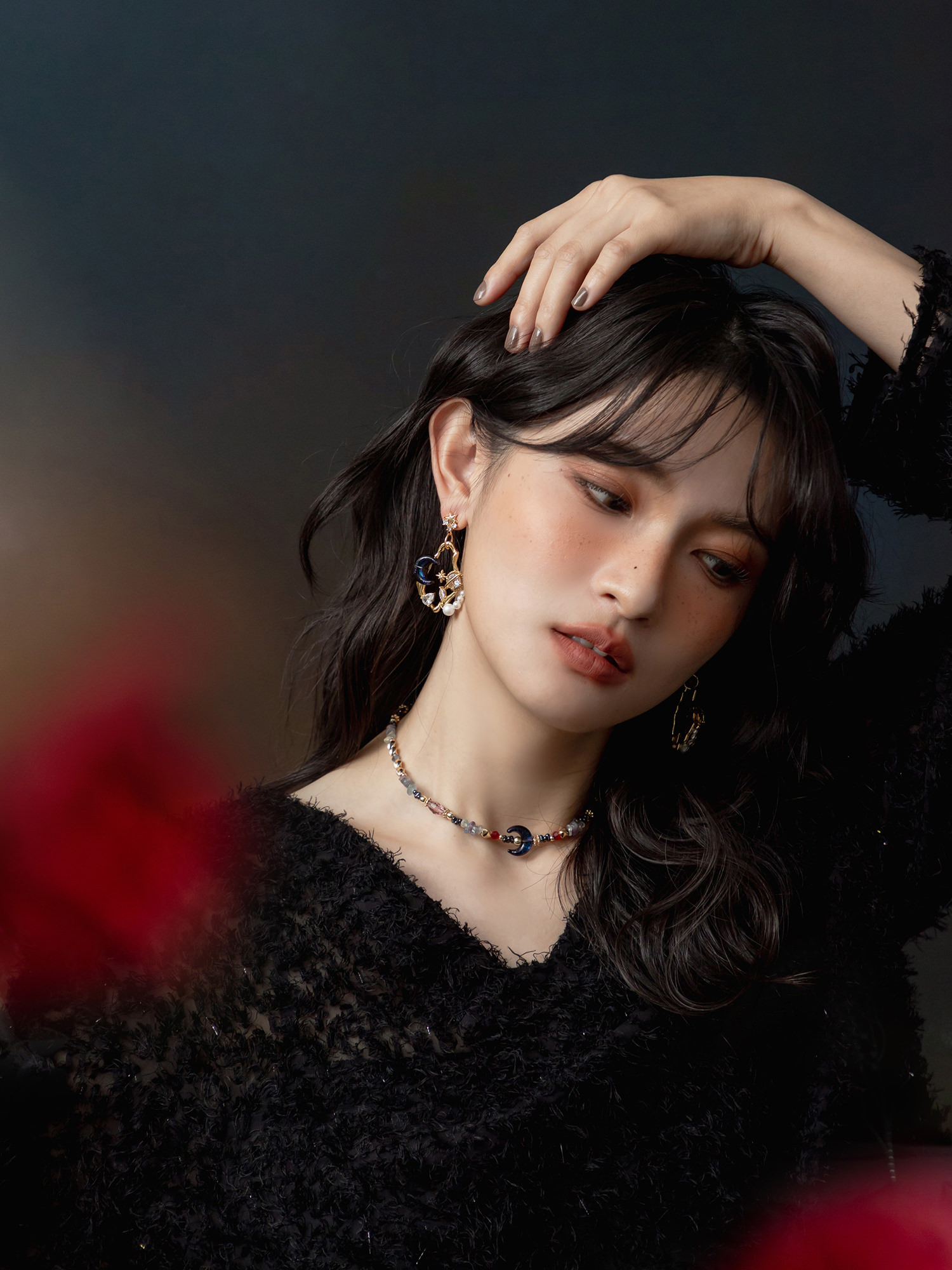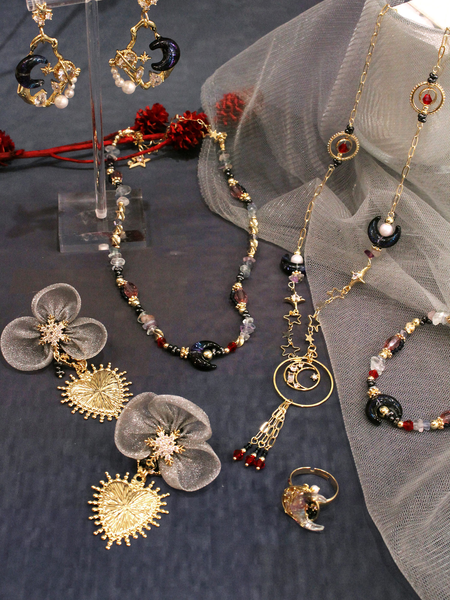 ▸ 素材:銅鍍14+18KGP、月形墜飾(琉璃電鍍)、鋯石、仿珠等複合材質