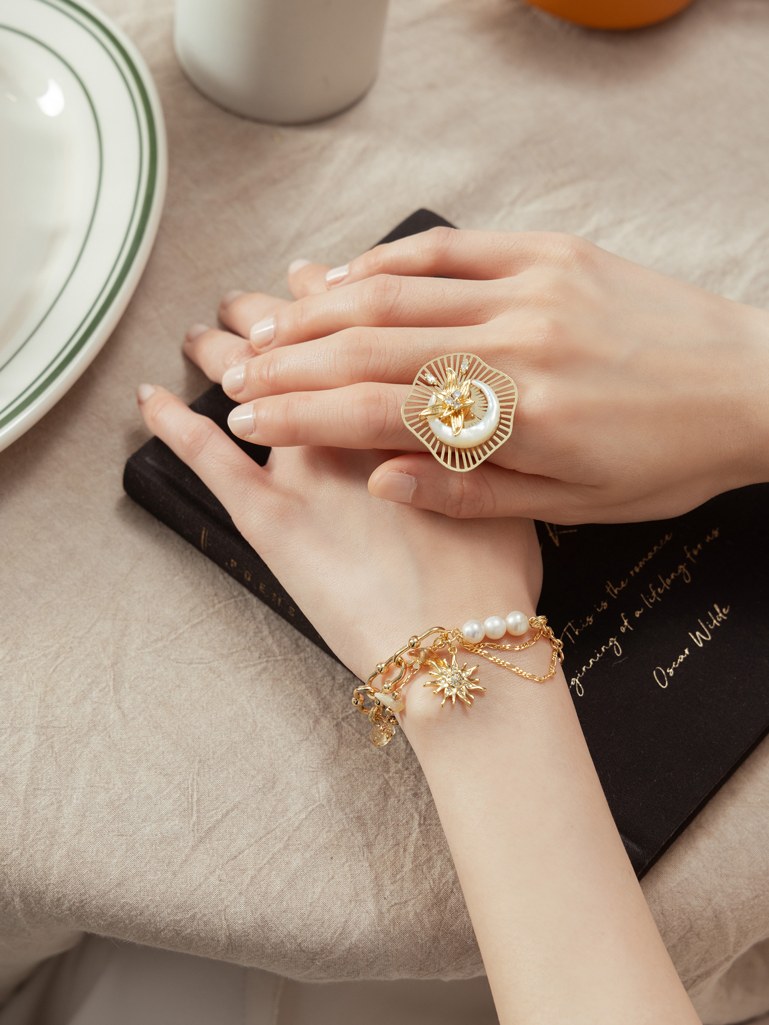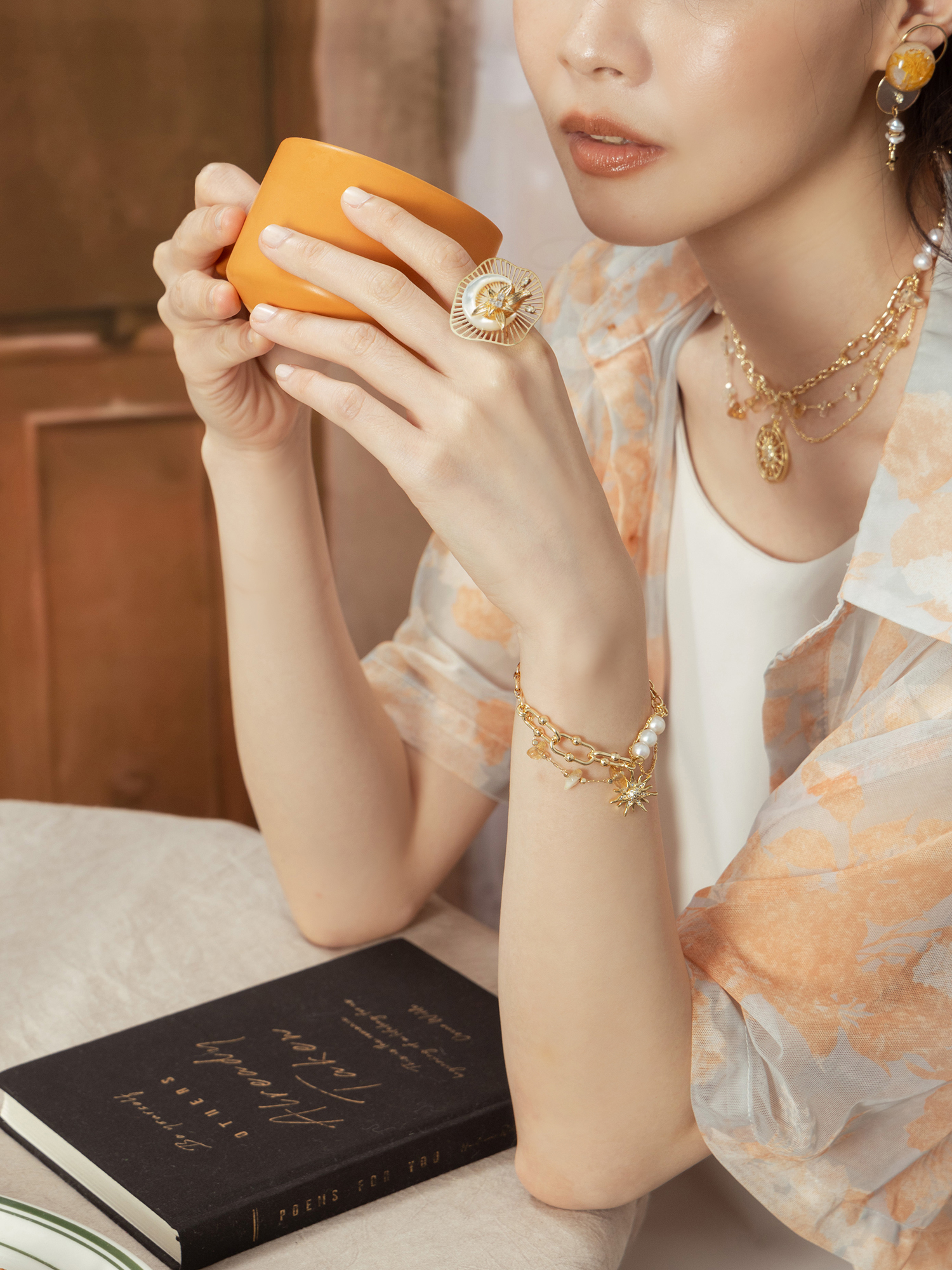 ▸ 水晶、貝殼、天然珍珠為天然材料,混色與花紋每款或有差異,鍍金屬不均、斑點、刮痕與凹洞為正常,非瑕疵。
