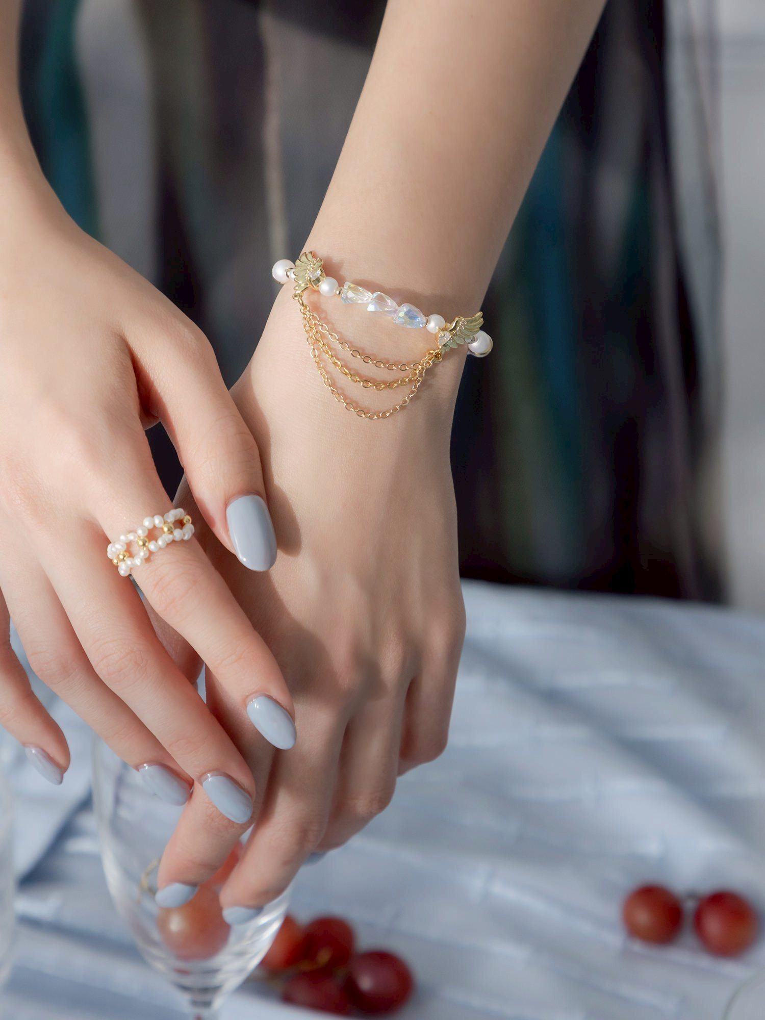 ▸ 水晶、貝殼、天然珍珠為天然材料,混色與花紋每款或有差異,鍍金屬不均、斑點、刮痕與凹洞為正常,非瑕疵。