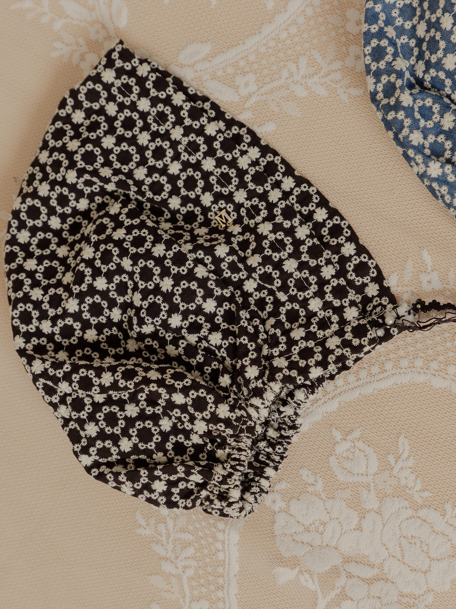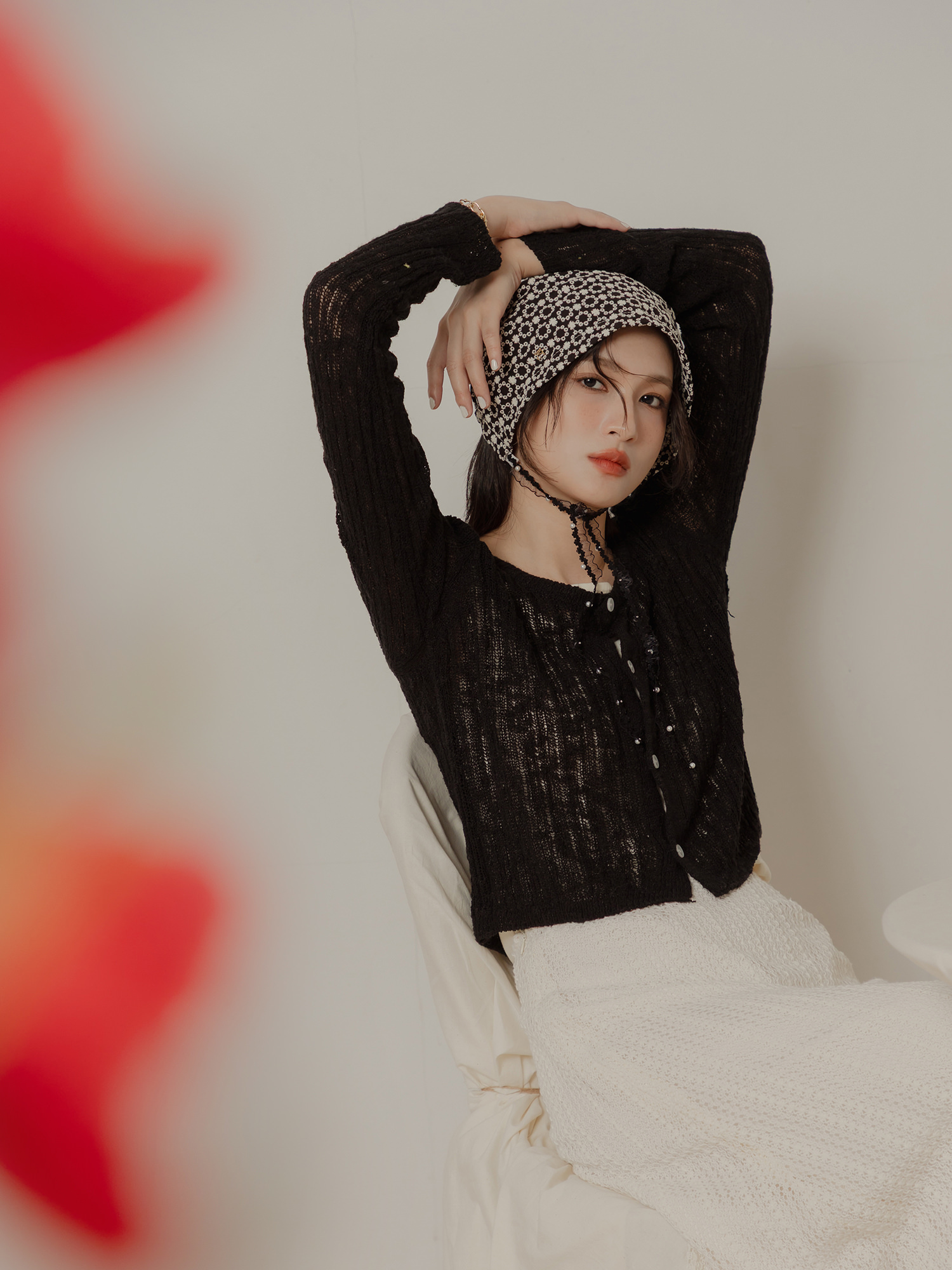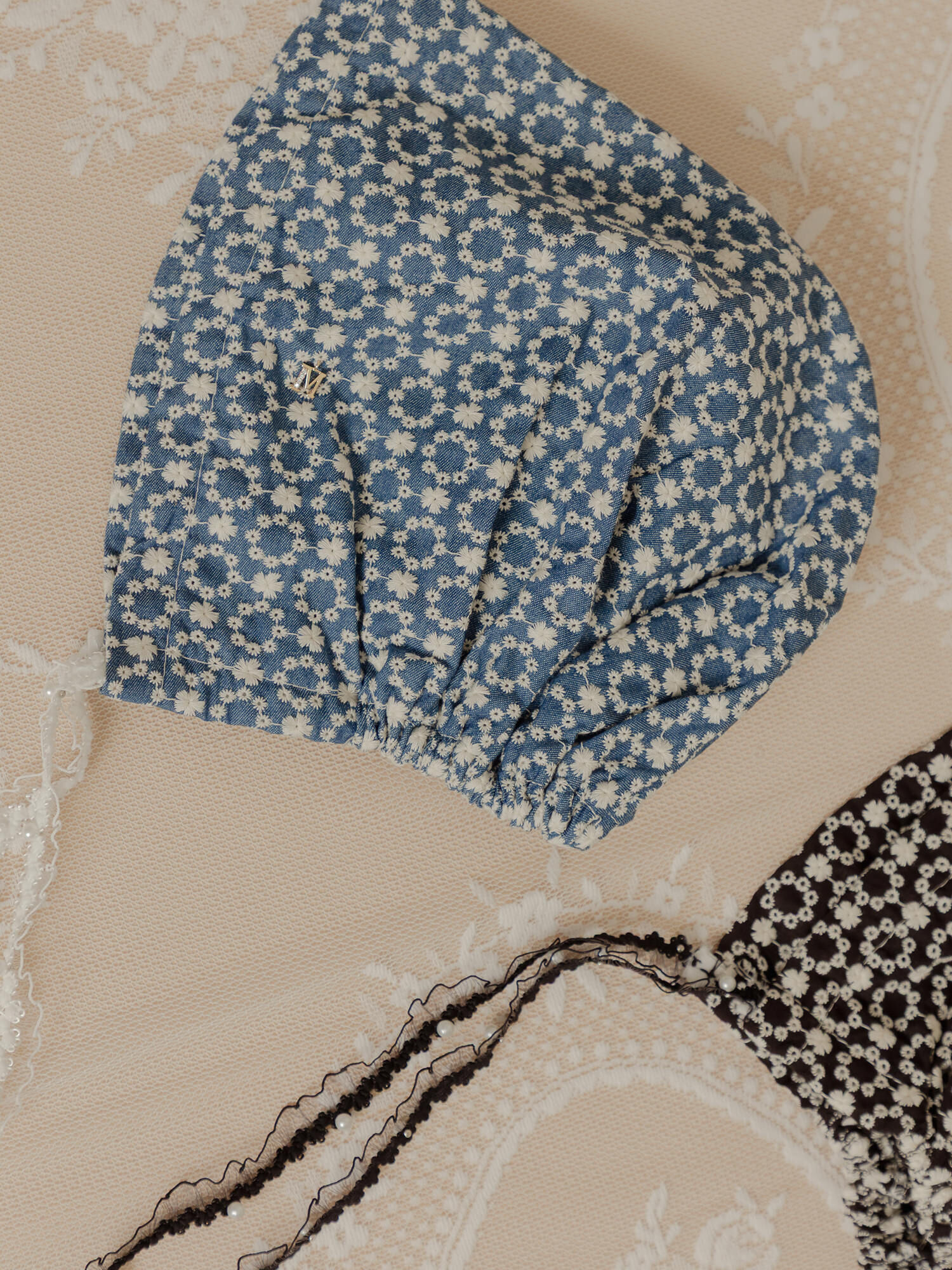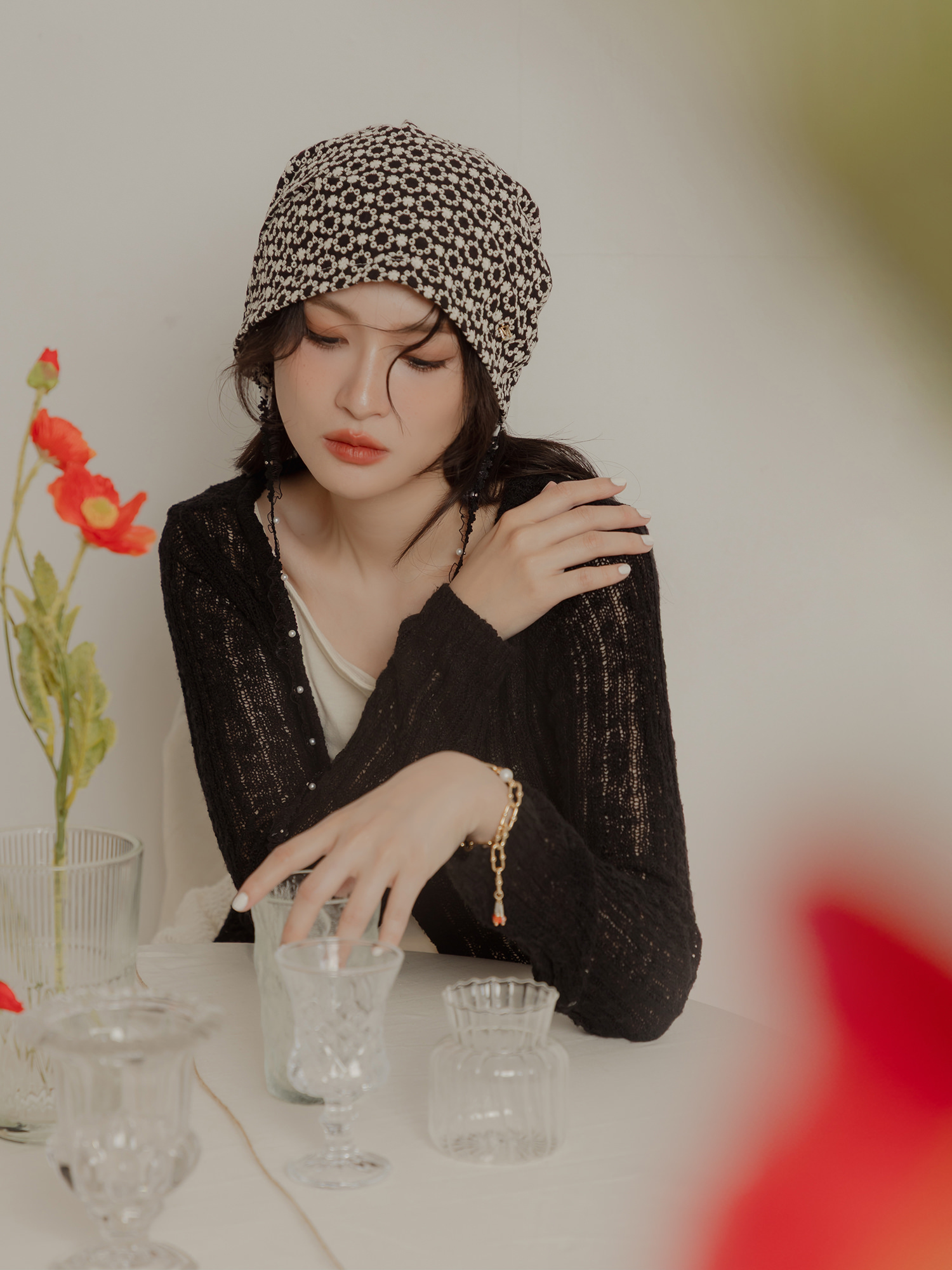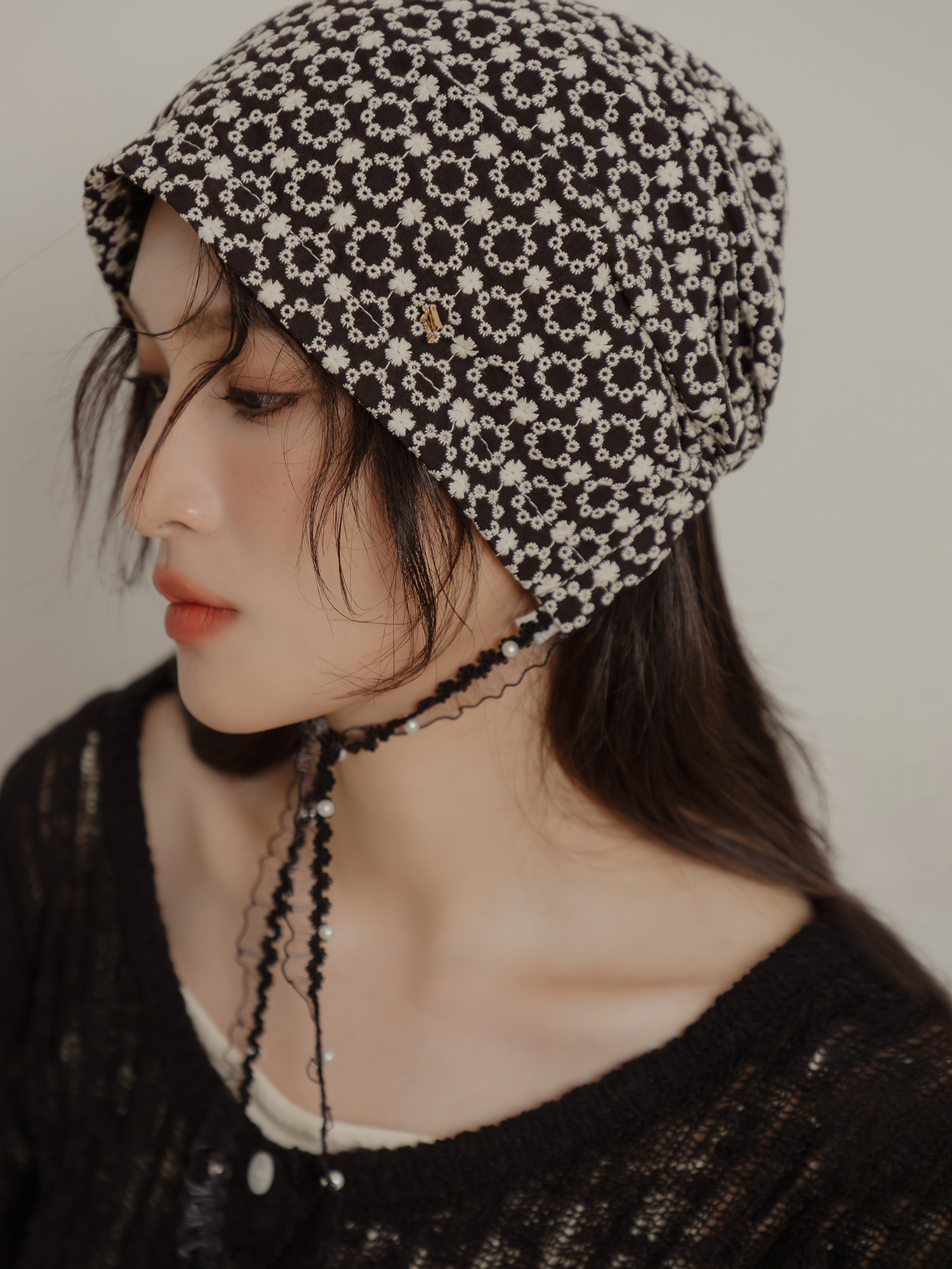 某某怪奇。MUCHAT手作小花蕾絲綁帶編織帽 (黑)