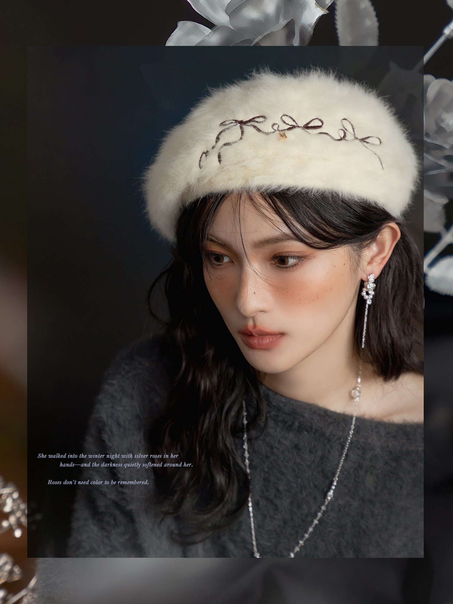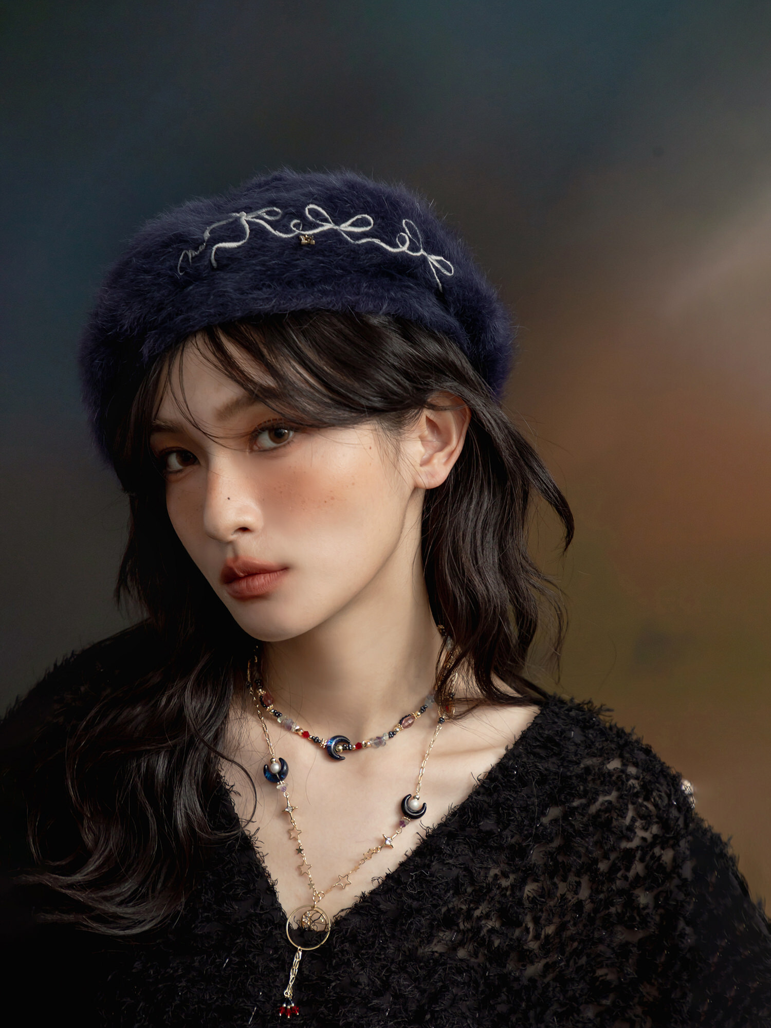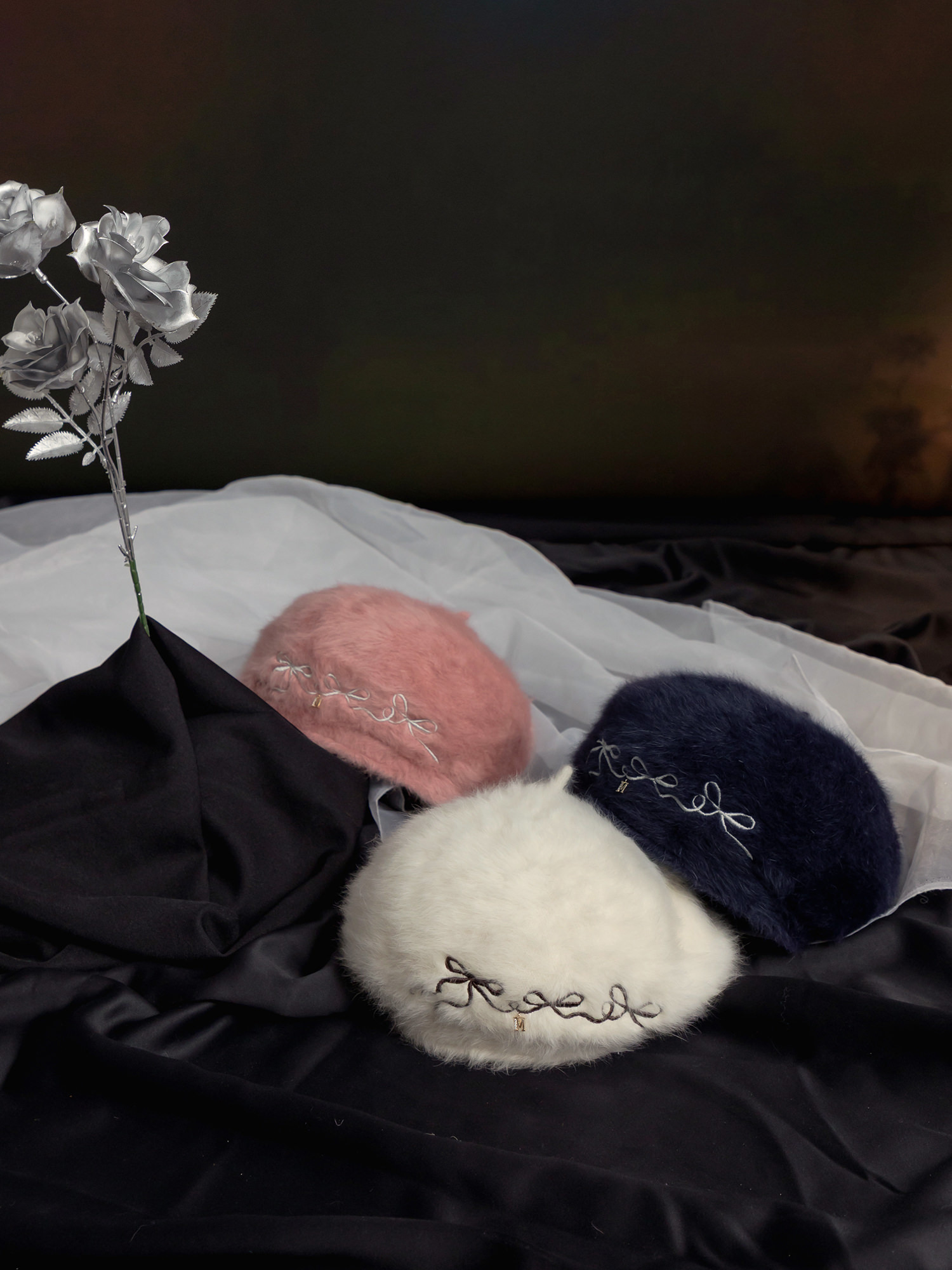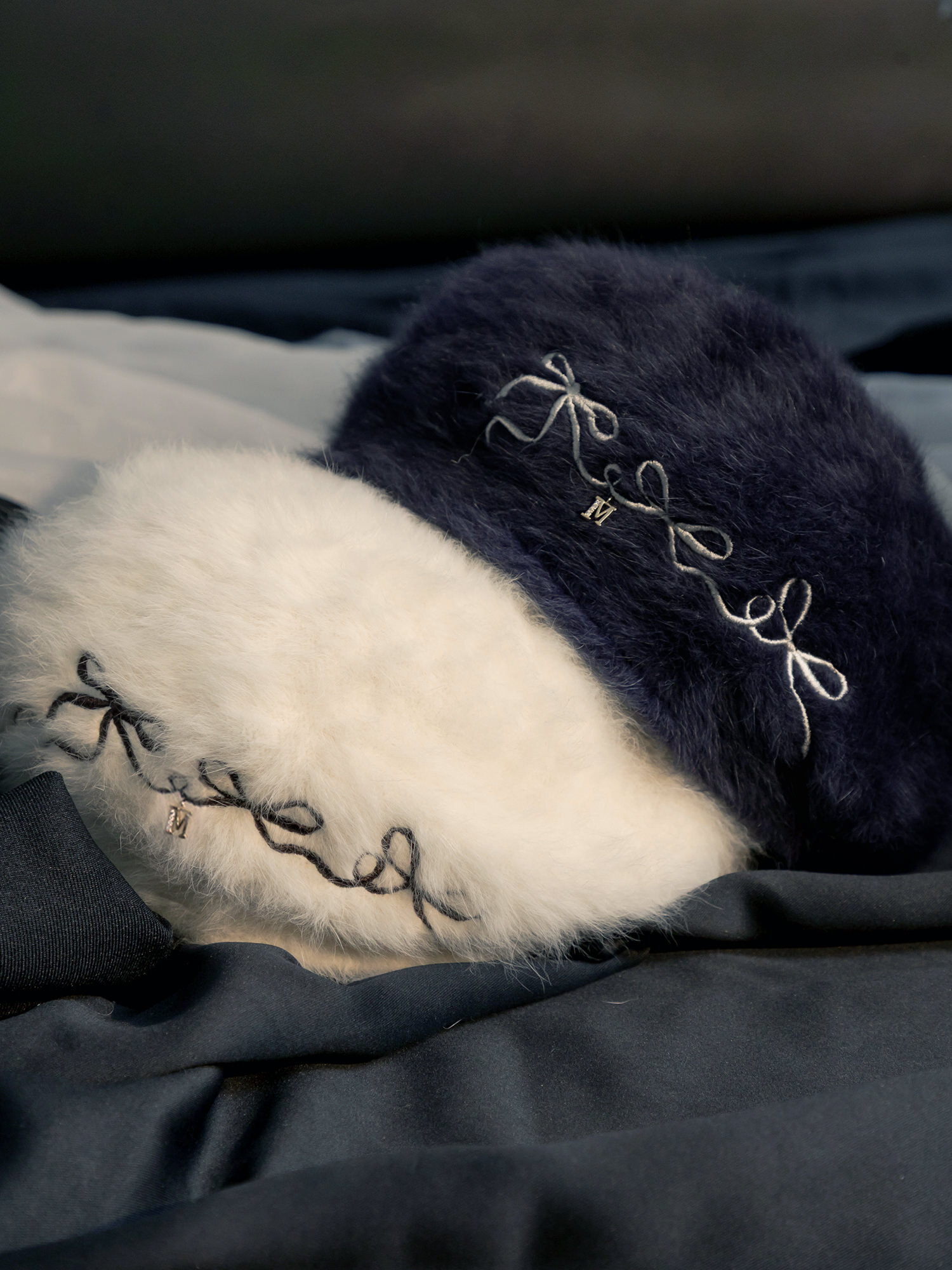 煙囪裡有包裹。MUCHAT手作刺繡蝶結絨毛貝蕾帽 (藏藍)