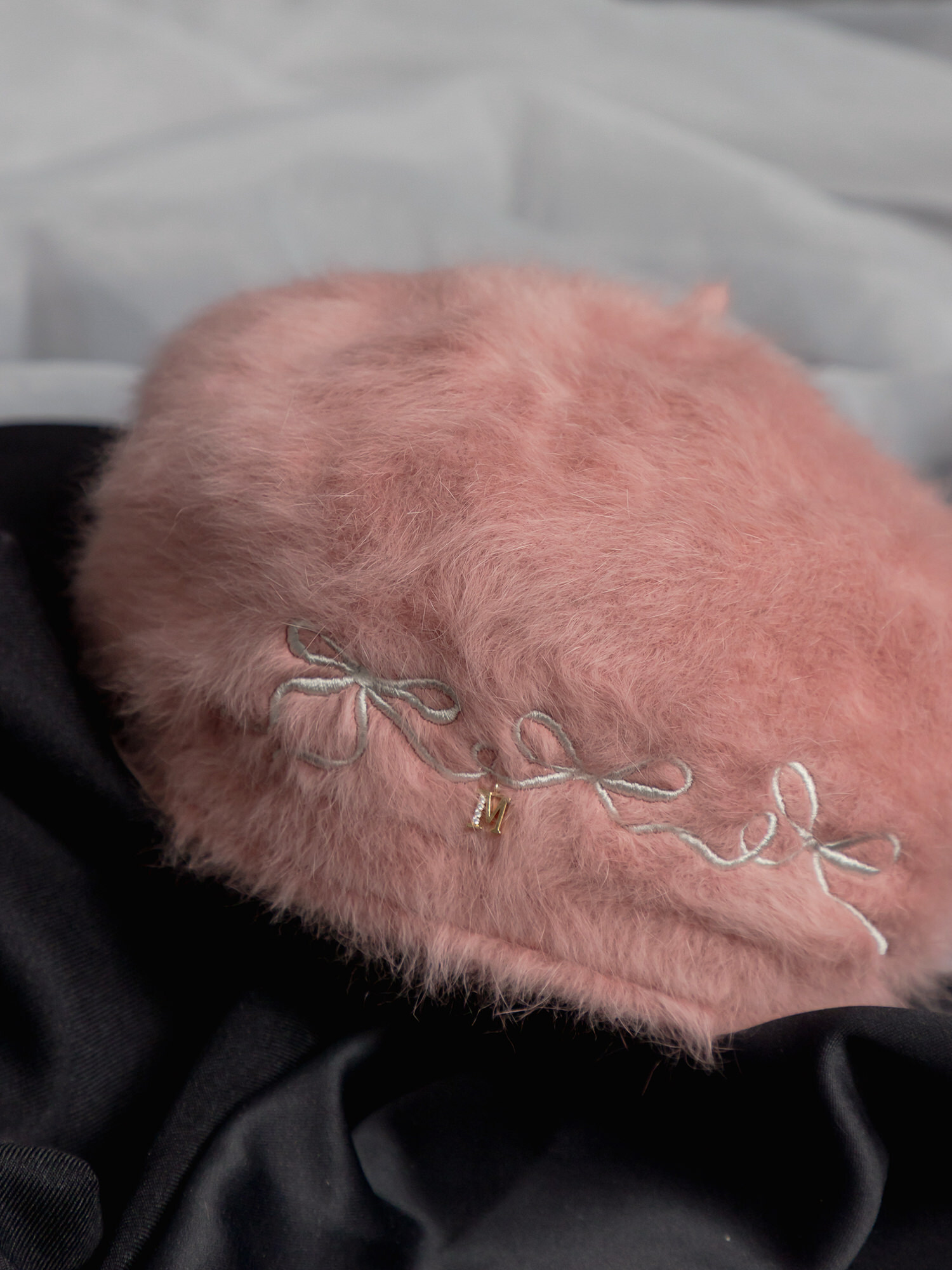 煙囪裡有包裹。MUCHAT手作刺繡蝶結絨毛貝蕾帽 (米白)