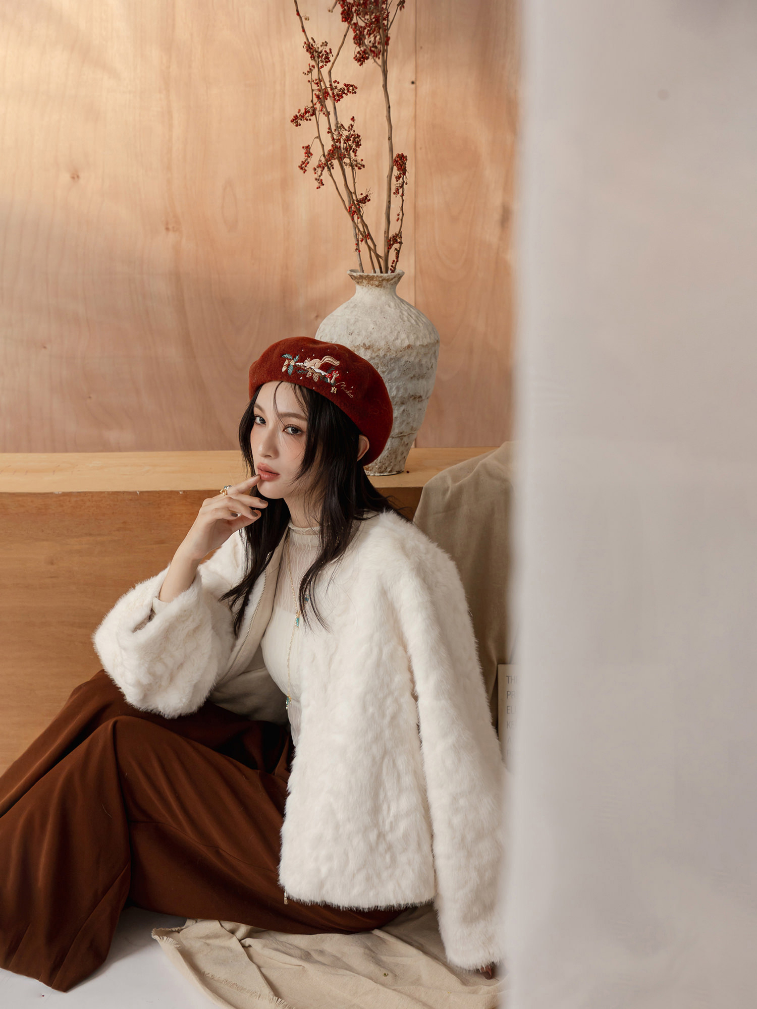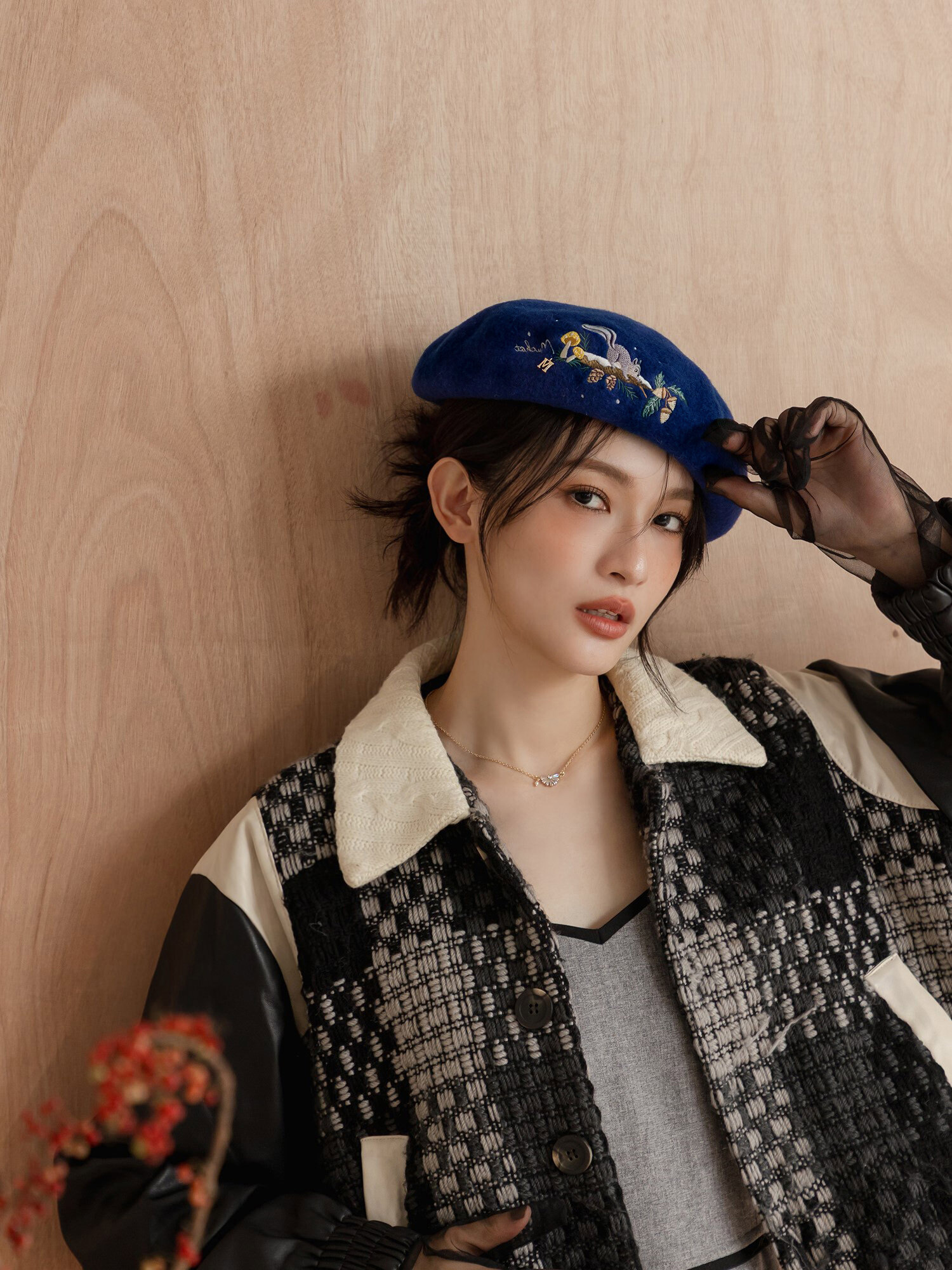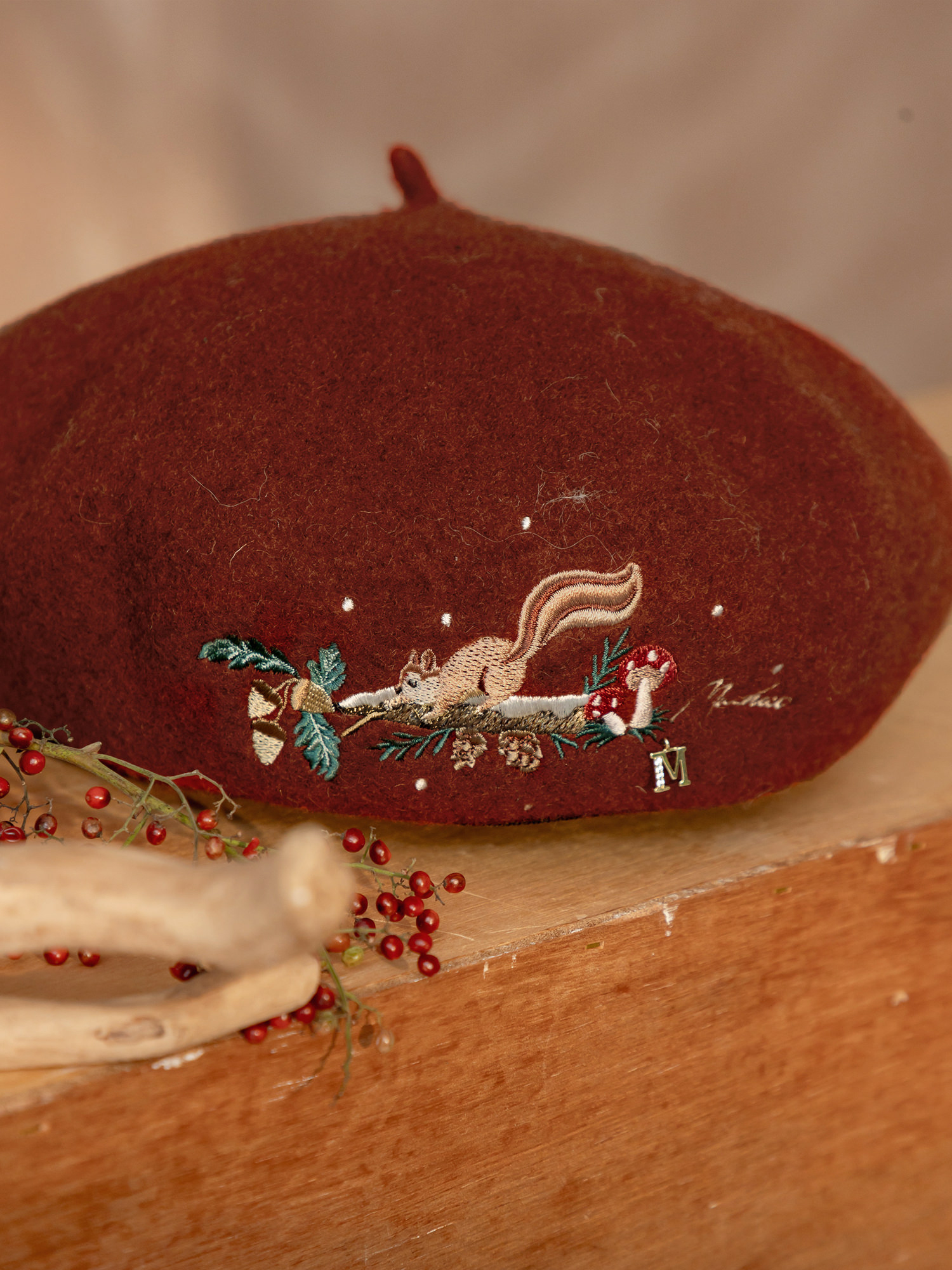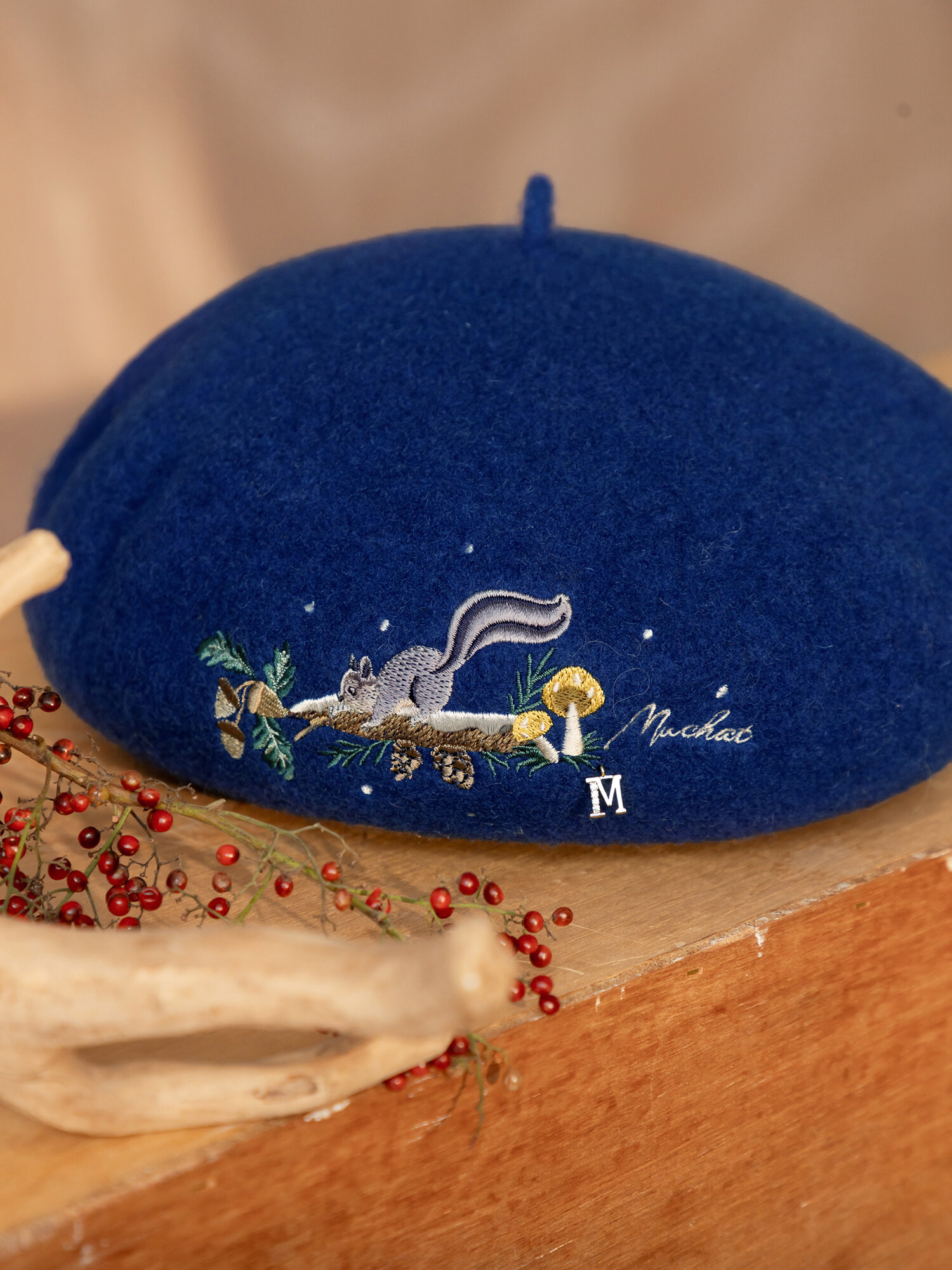 松鼠奶奶自製果醬。MUCHAT手作刺繡松鼠毛呢貝蕾帽 (寶藍)