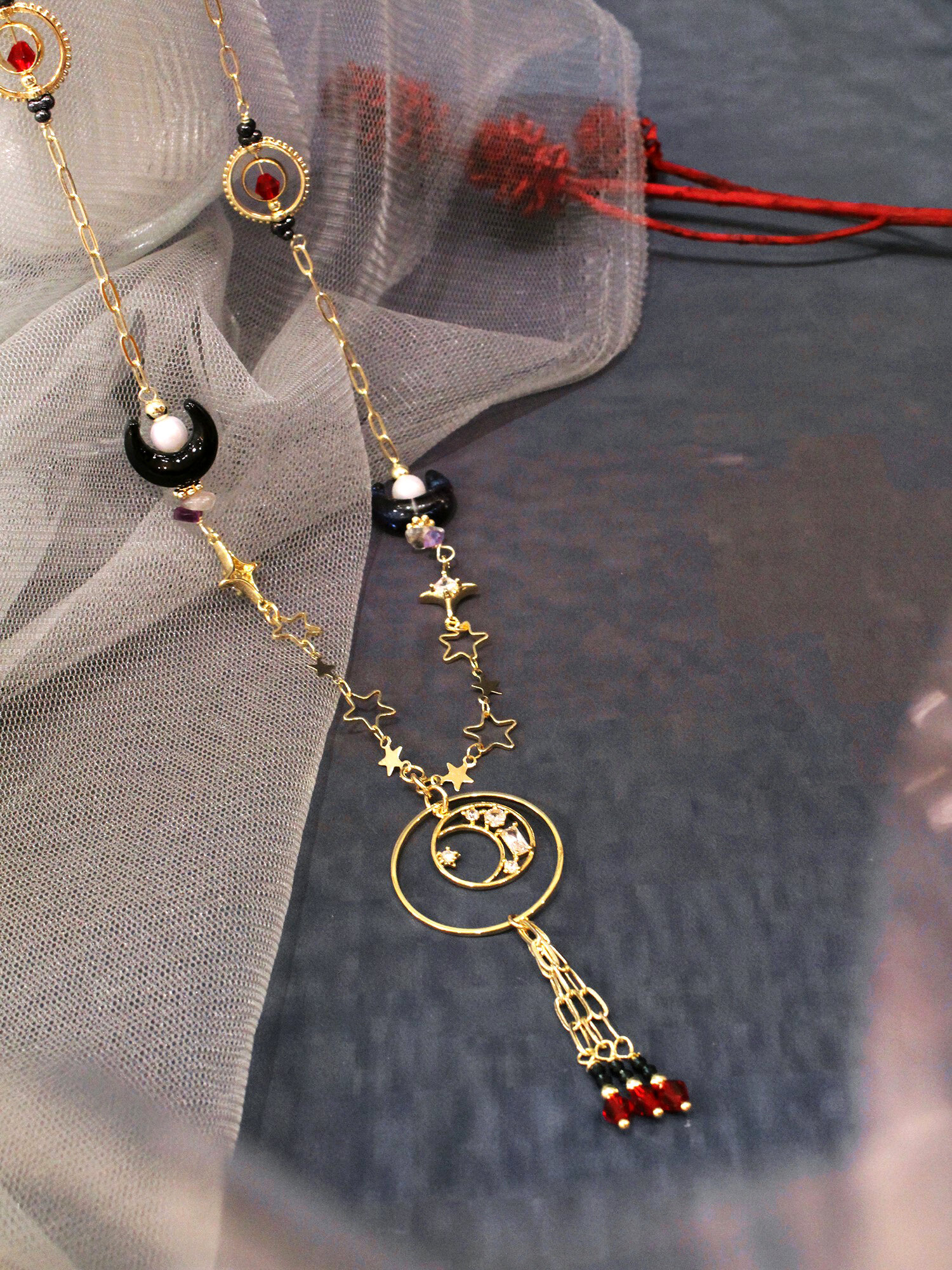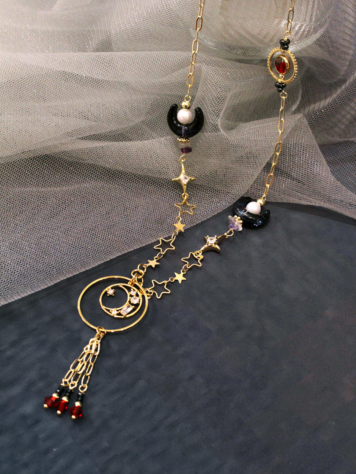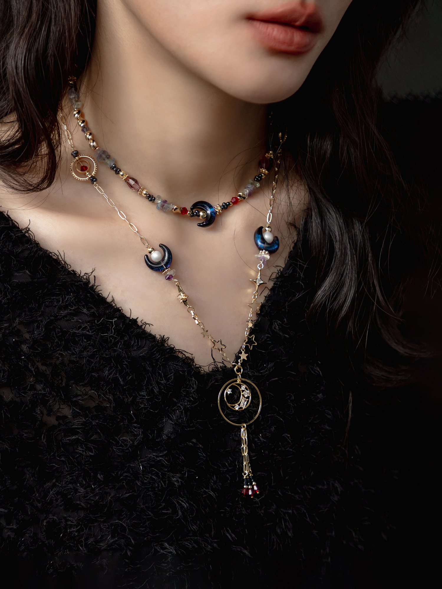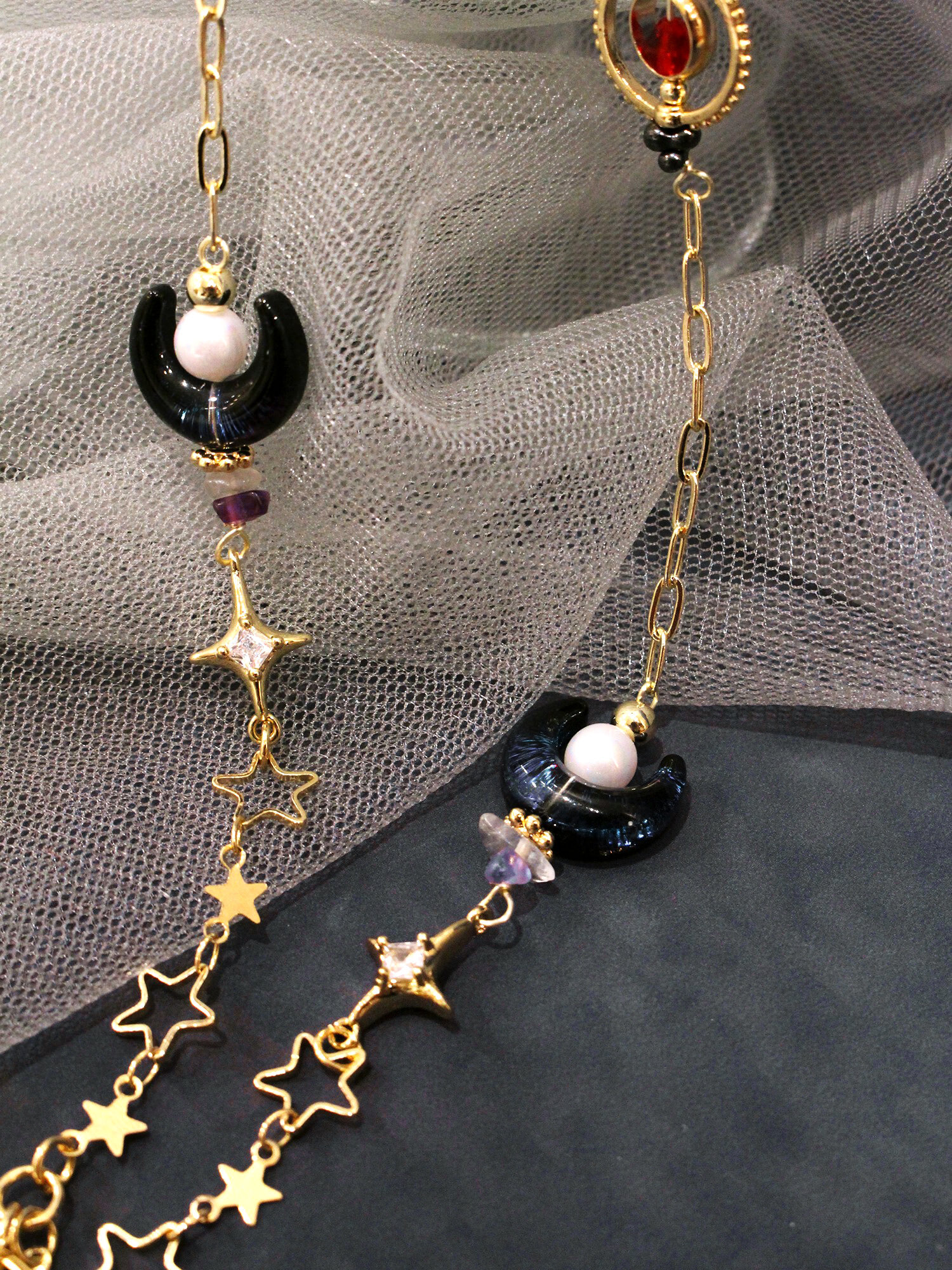 ▸ 素材:銅鍍14KGP、螢石、水晶珠、鋯石、月形墜飾(琉璃電鍍)、串珠等複合材質