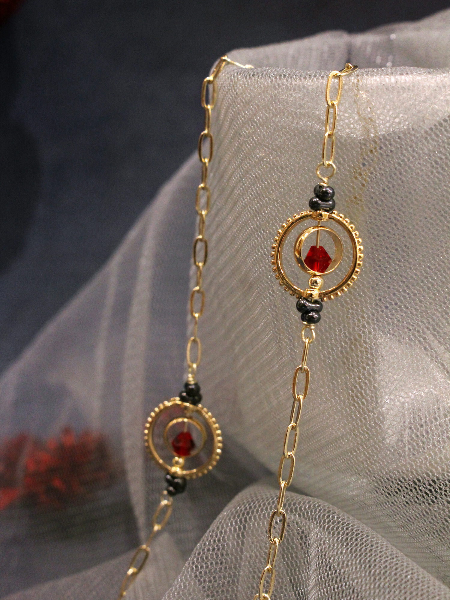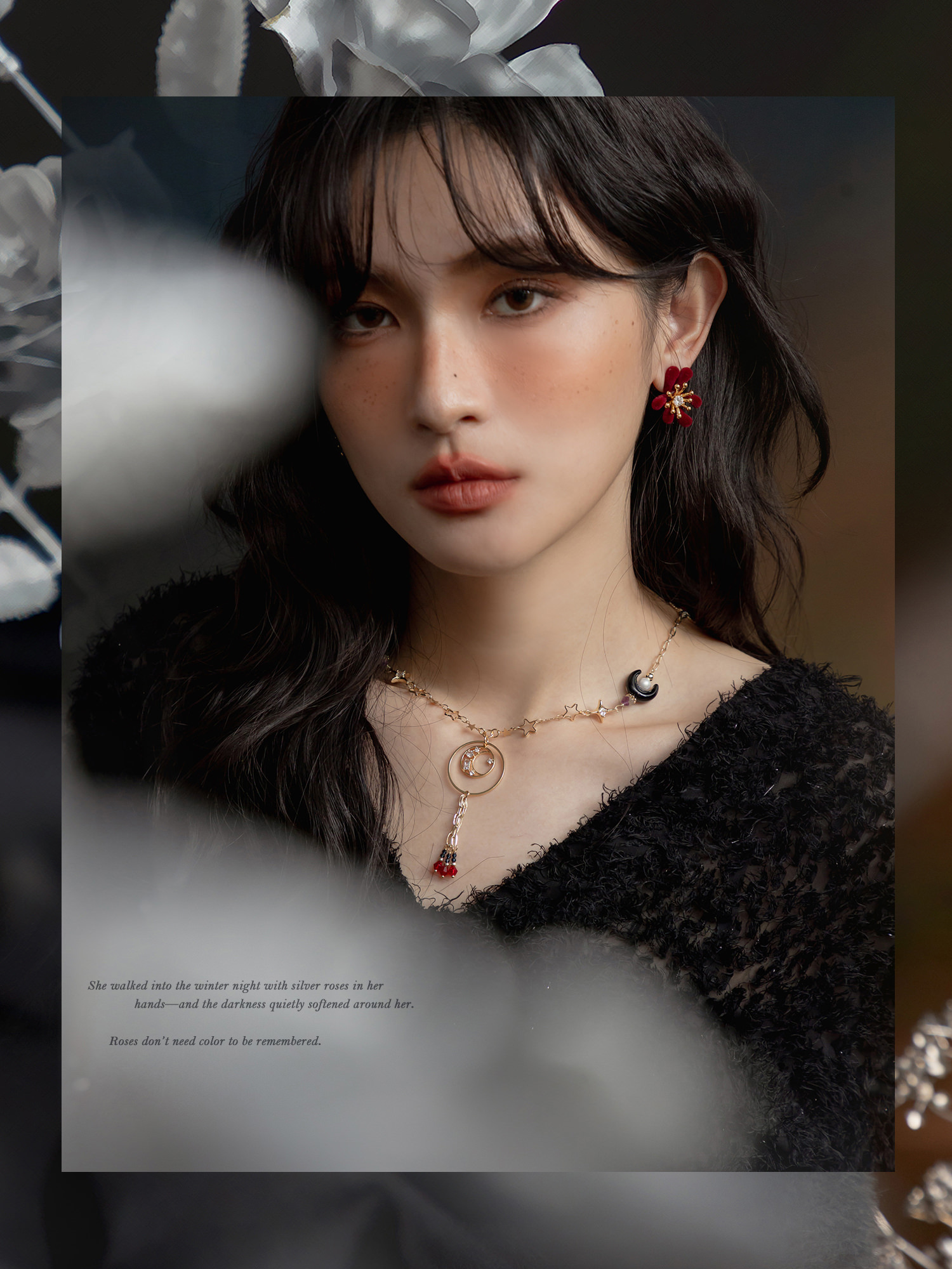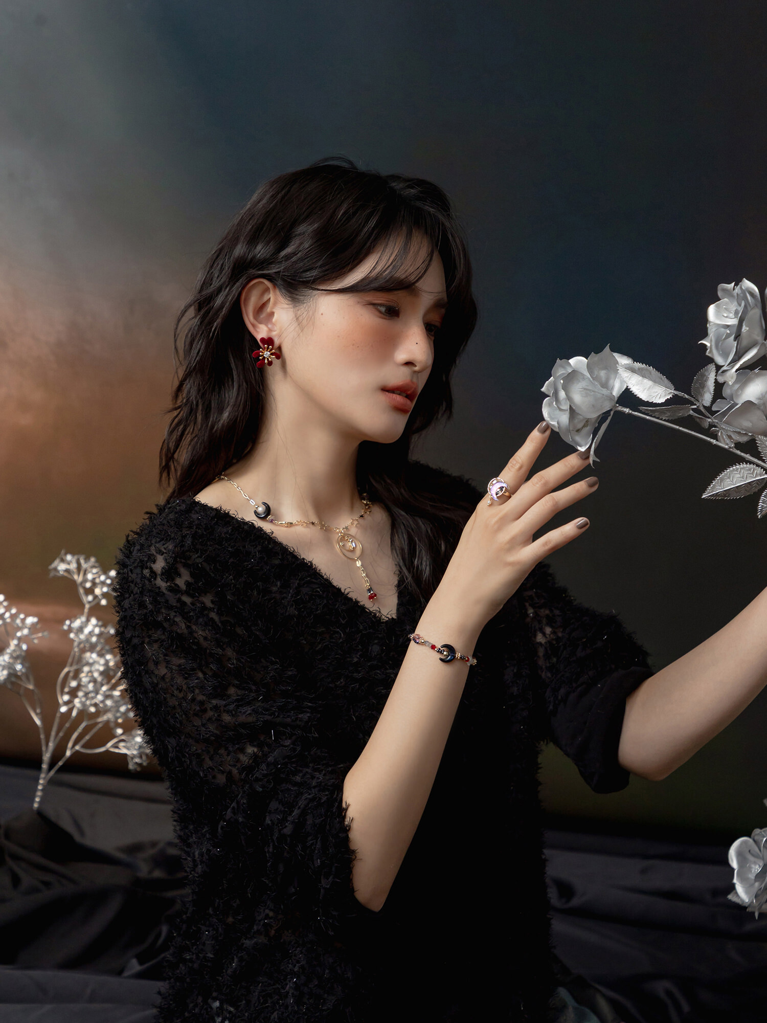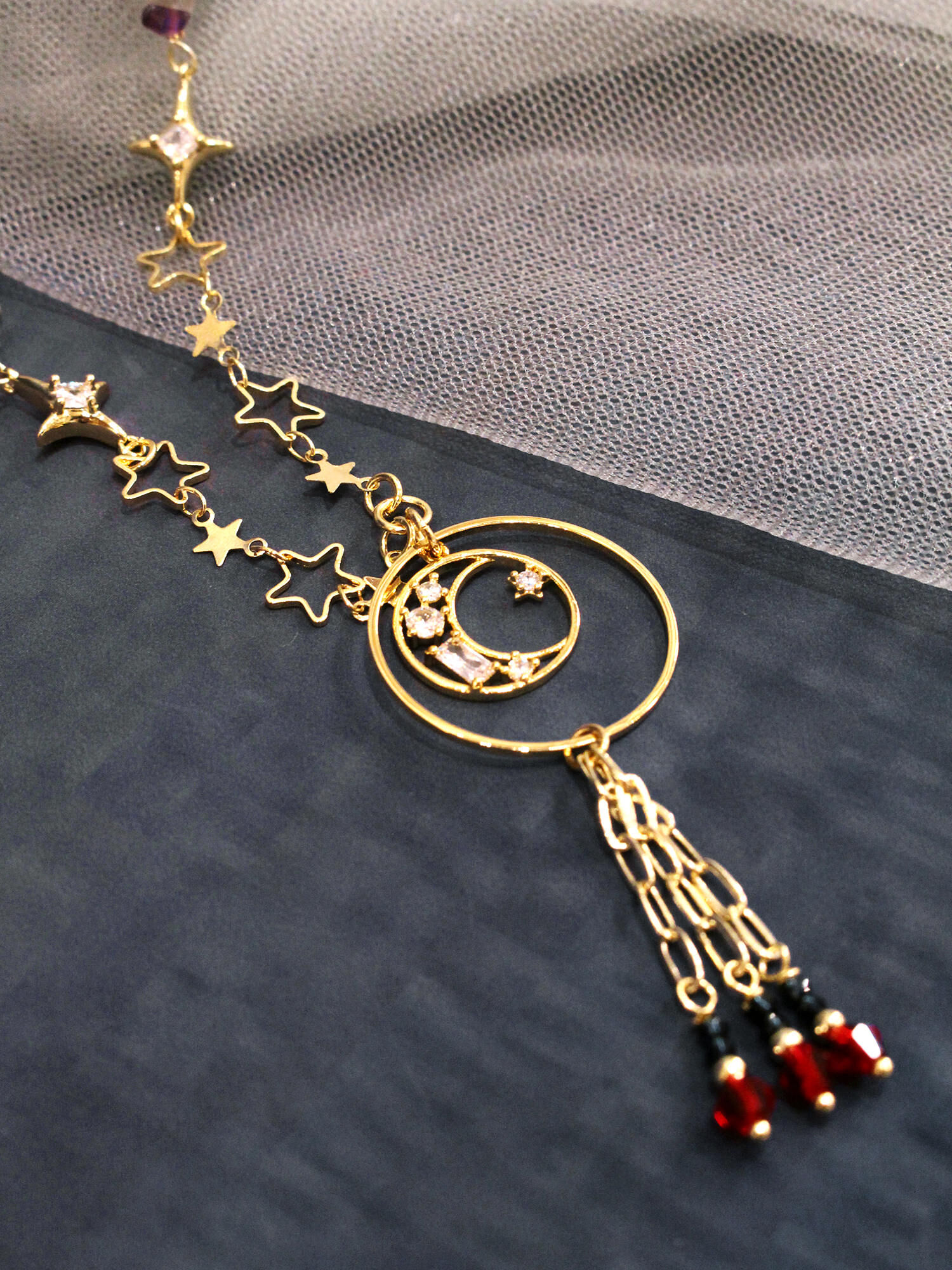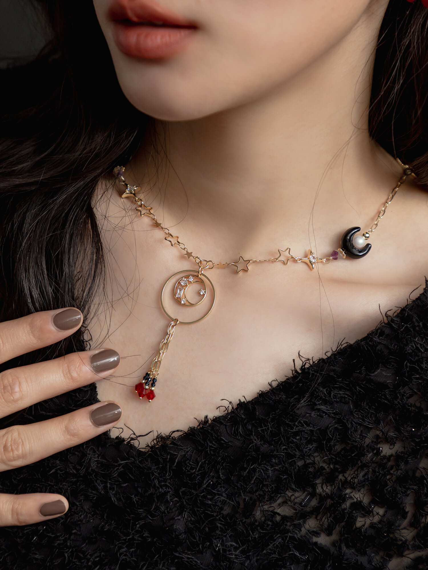▸ 素材:銅鍍14KGP、螢石、水晶珠、鋯石、月形墜飾(琉璃電鍍)、串珠等複合材質