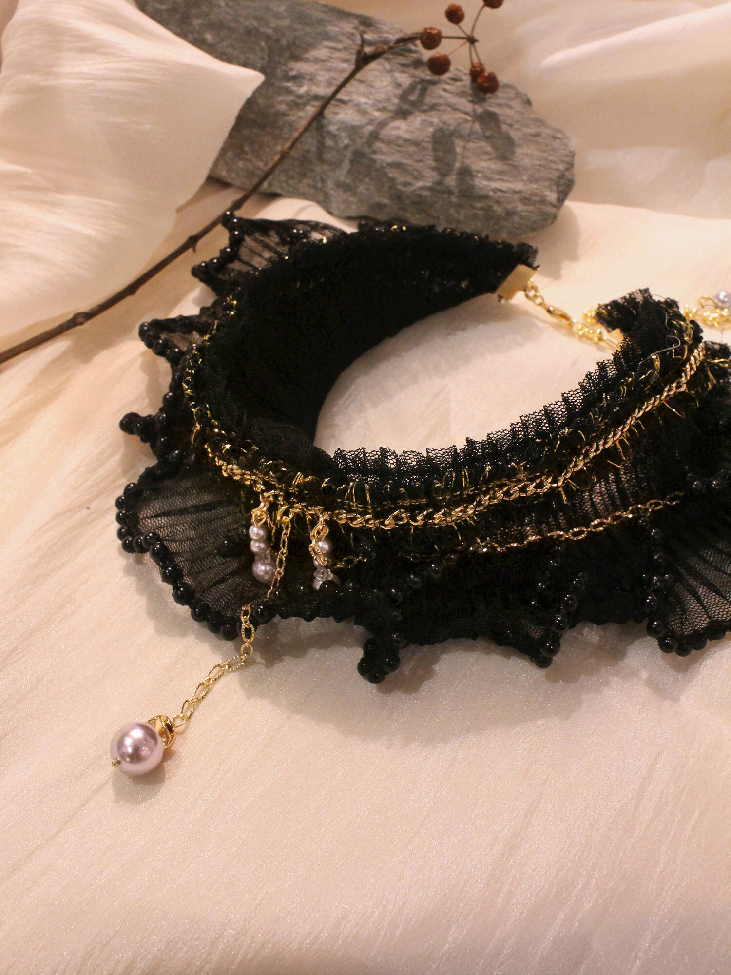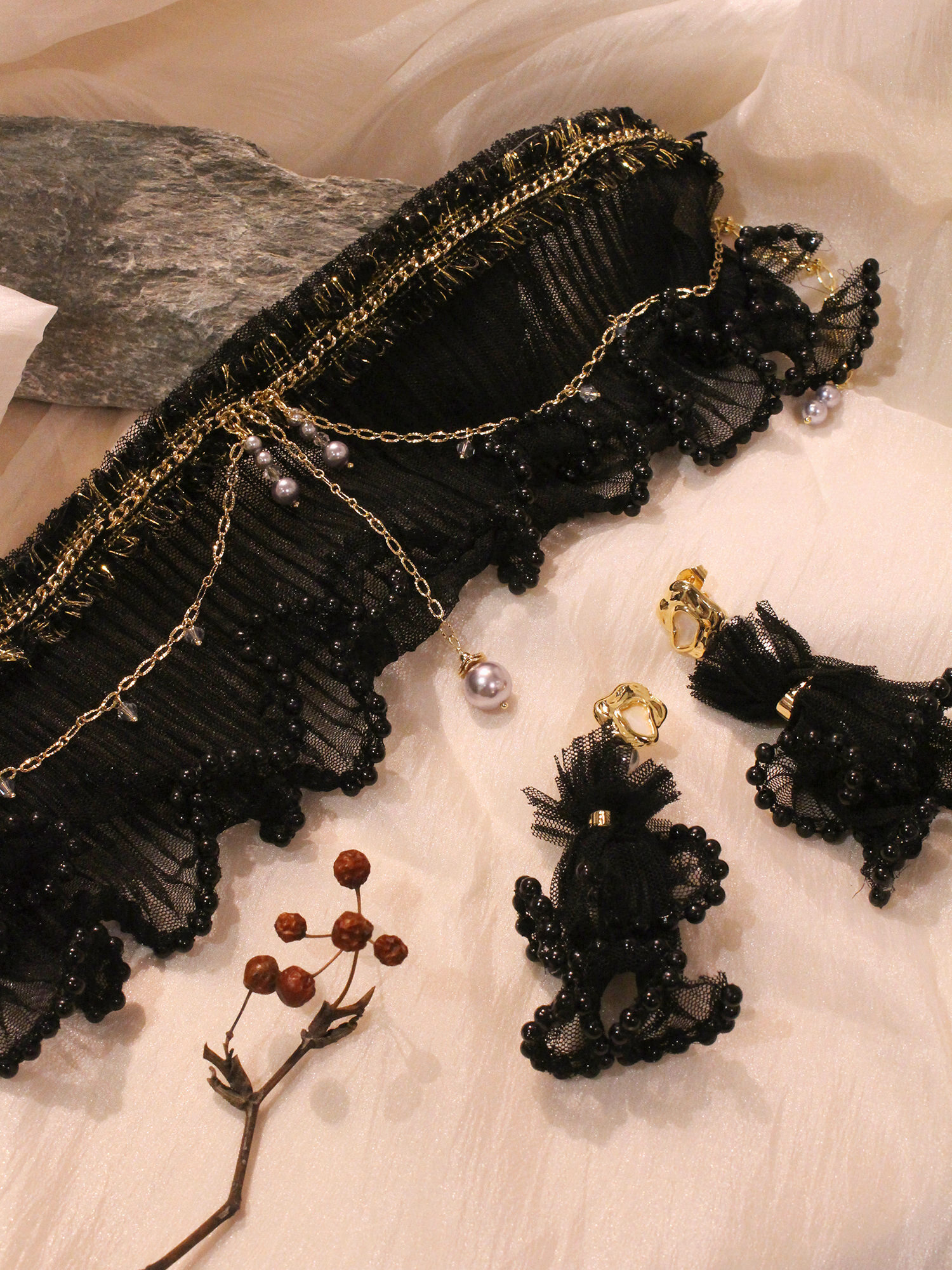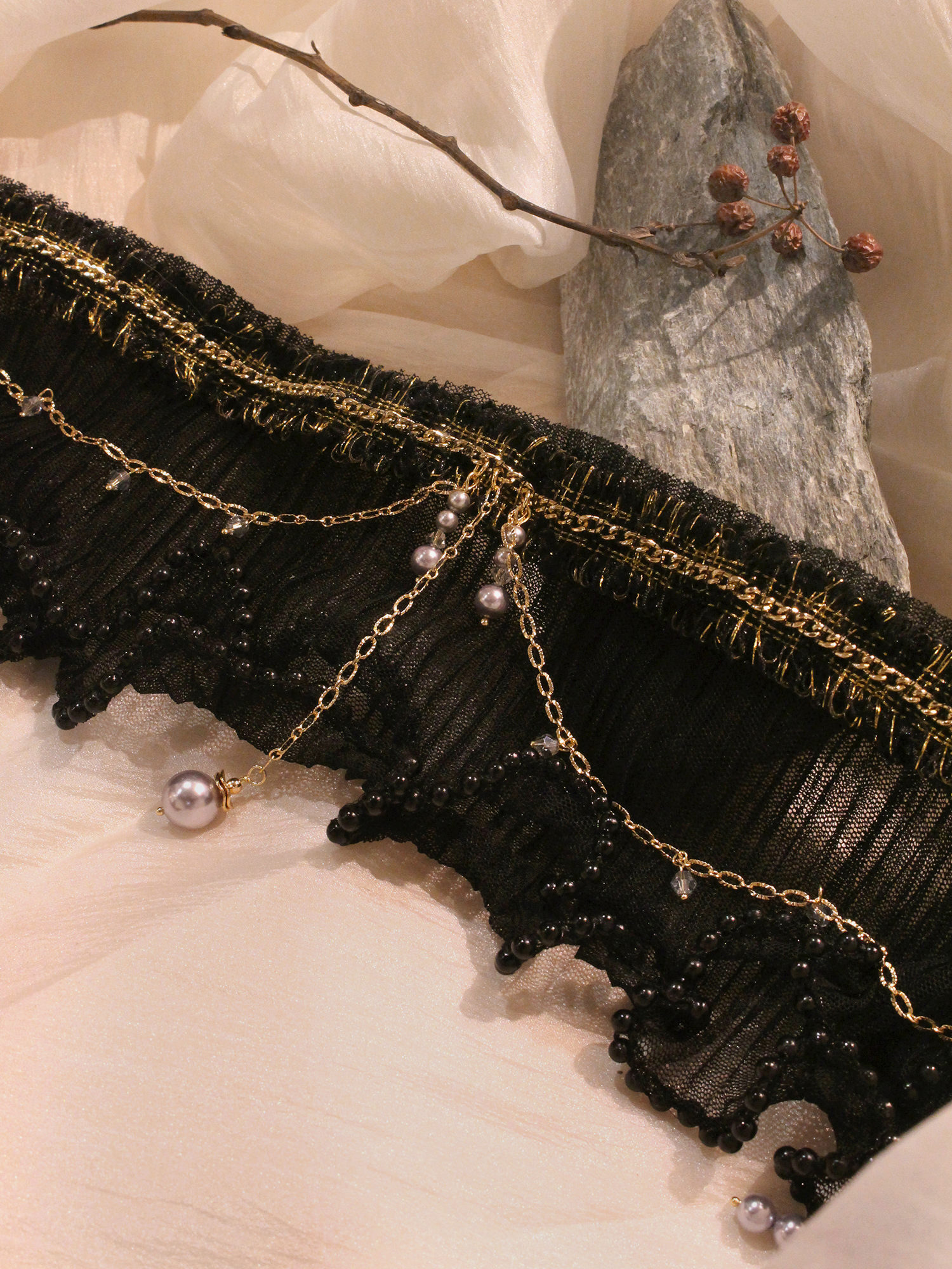 ▸ 素材:銅鍍14KGP、仿珠、三角水晶、水晶珠、聚酯纖維、緞帶等複合材質