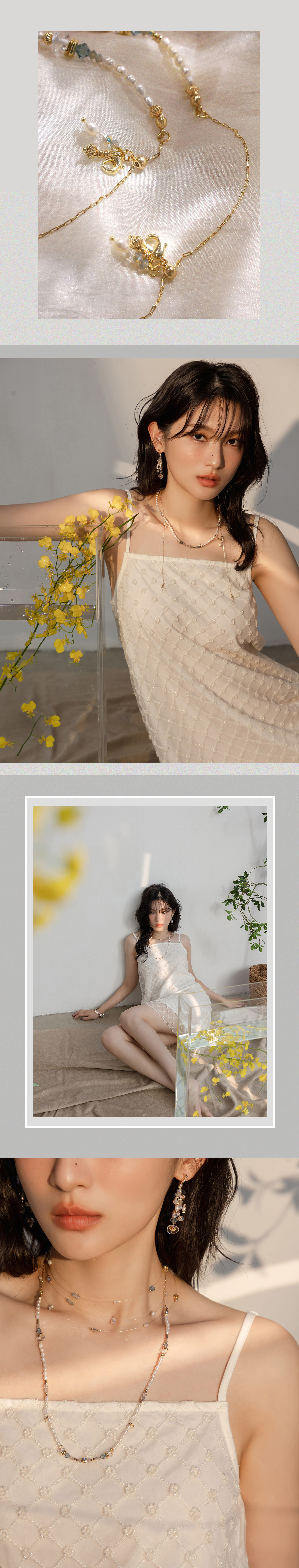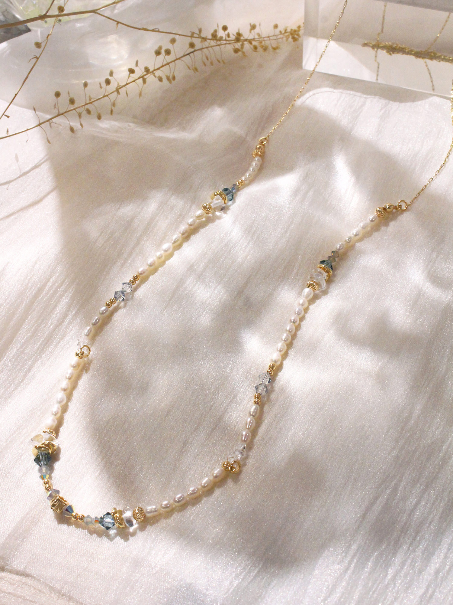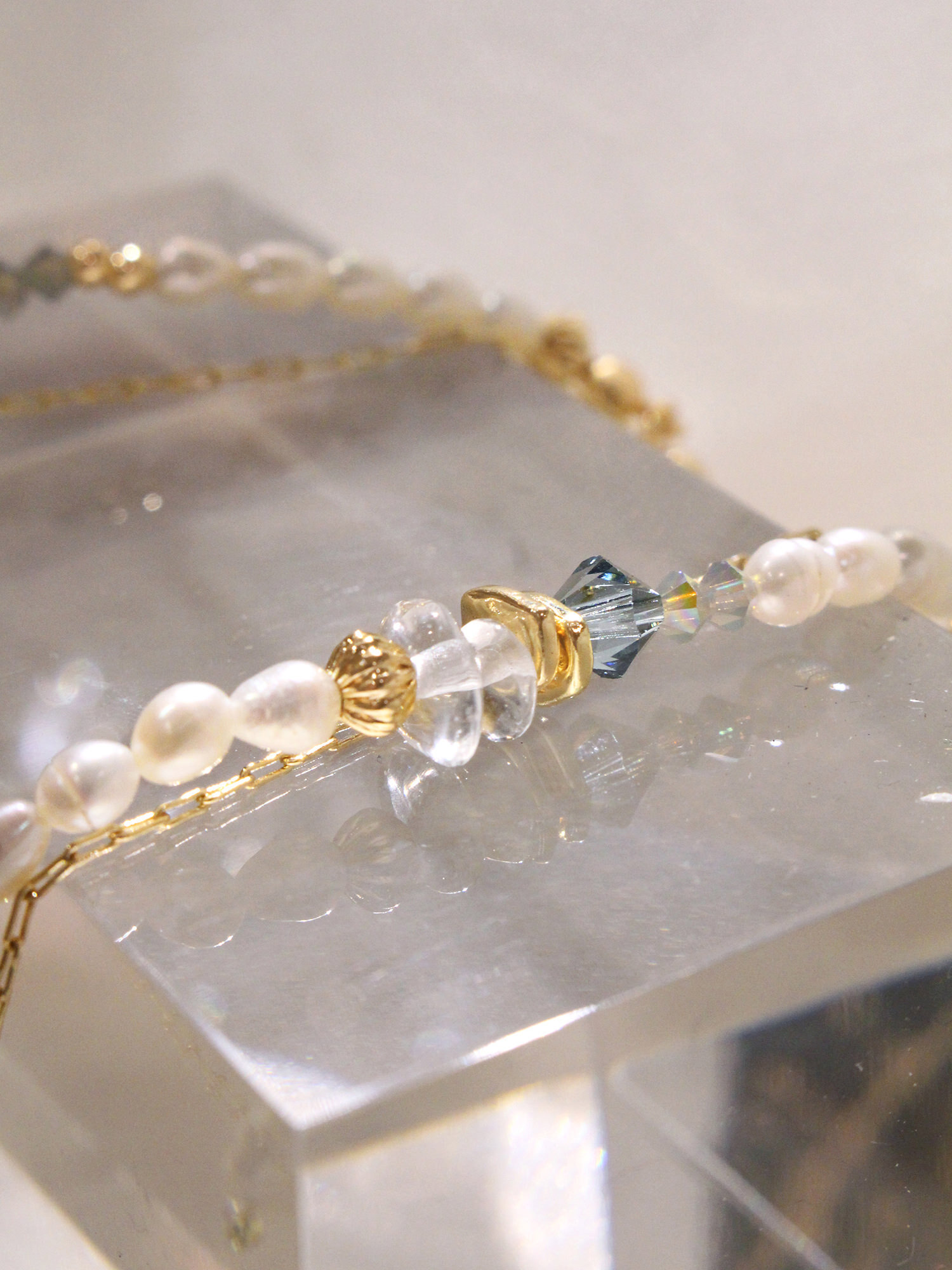 ▸ 素材:銅鍍14KGP、天然淡水珍珠、施華洛水晶角珠、白水晶、閃靈鑽、串珠等複合材質