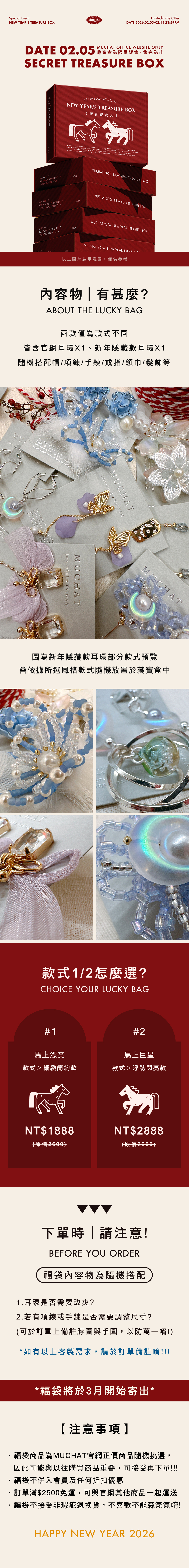 ▸ 內容物:官網耳環X1、新年隱藏款耳環X1、隨機搭配帽/項鍊/手鍊/戒指/領巾/髮飾...等